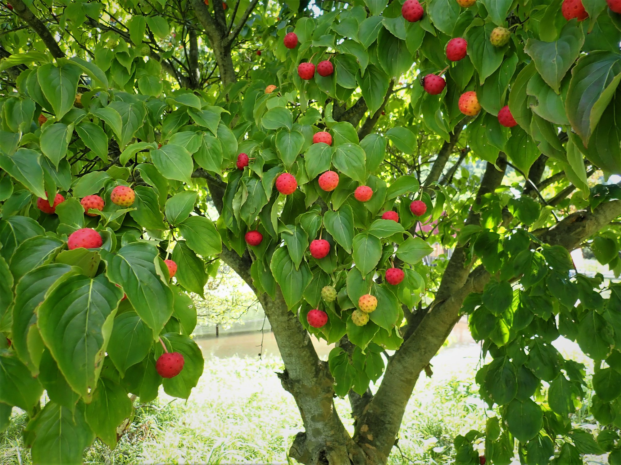 花が終わると丸い果実ができます。花が集合していましたので、くっついて一つの果実のように見えますが、一つの花に一つの種子ができて、果肉の部分が癒着している状態です。