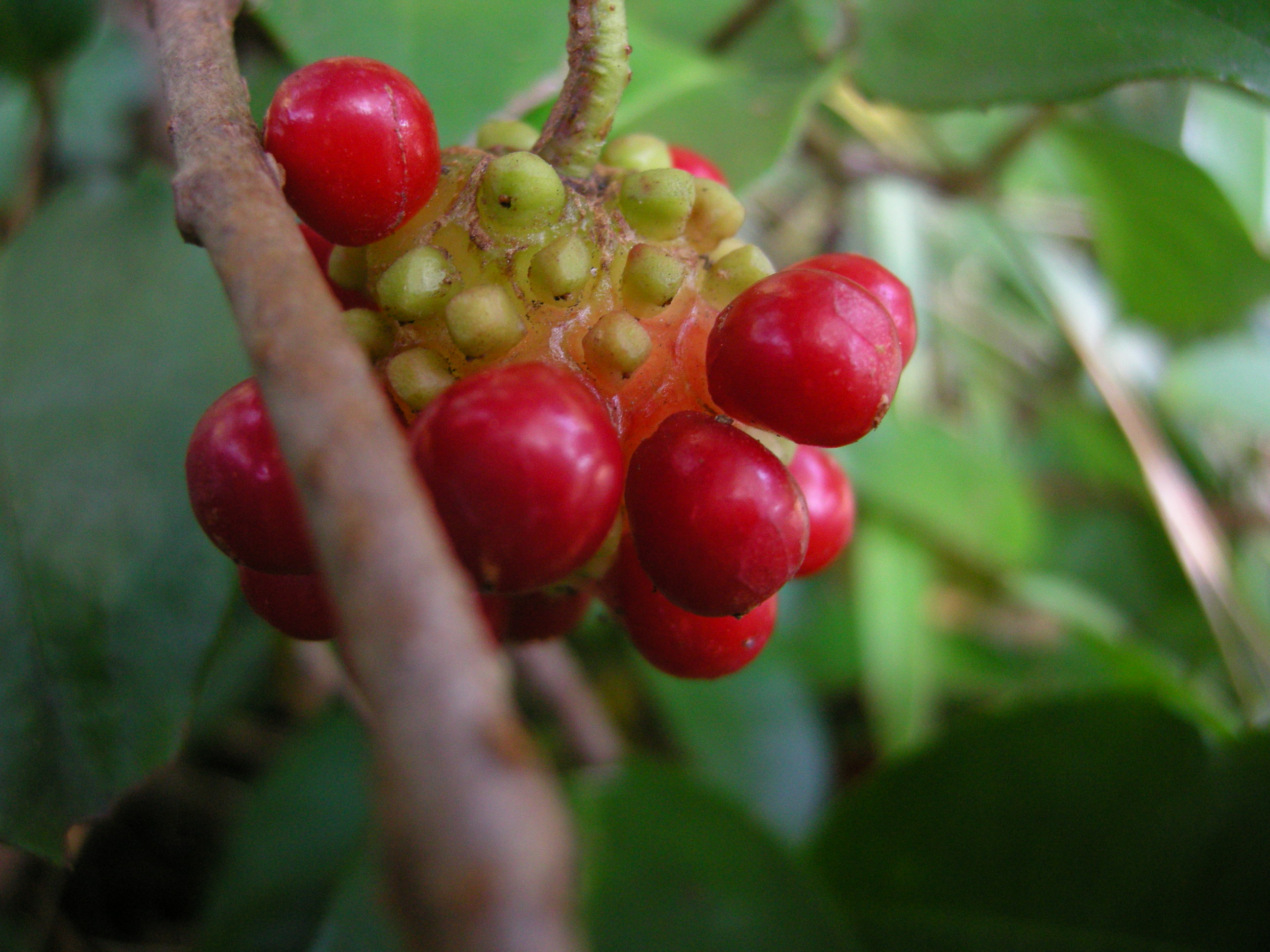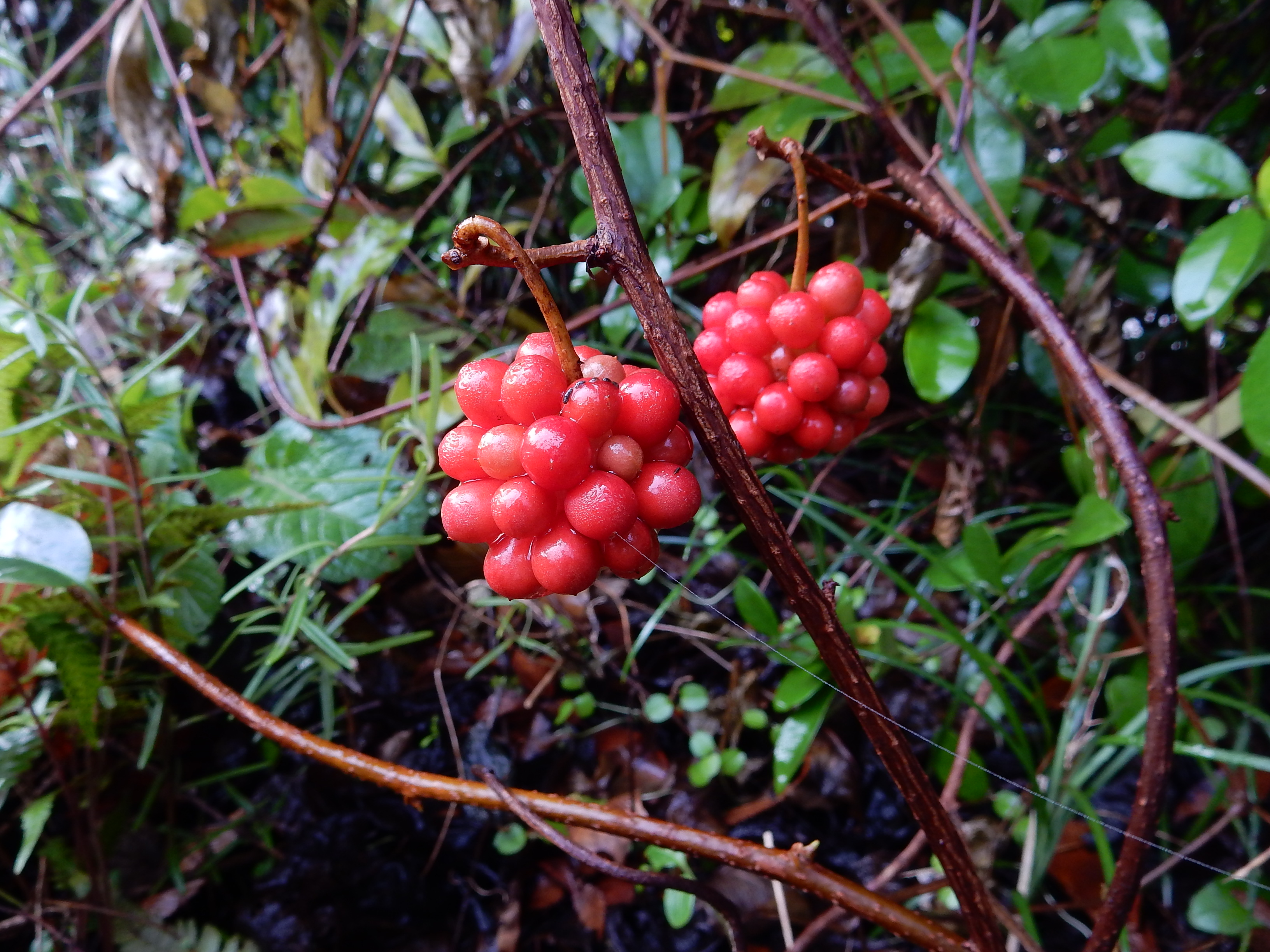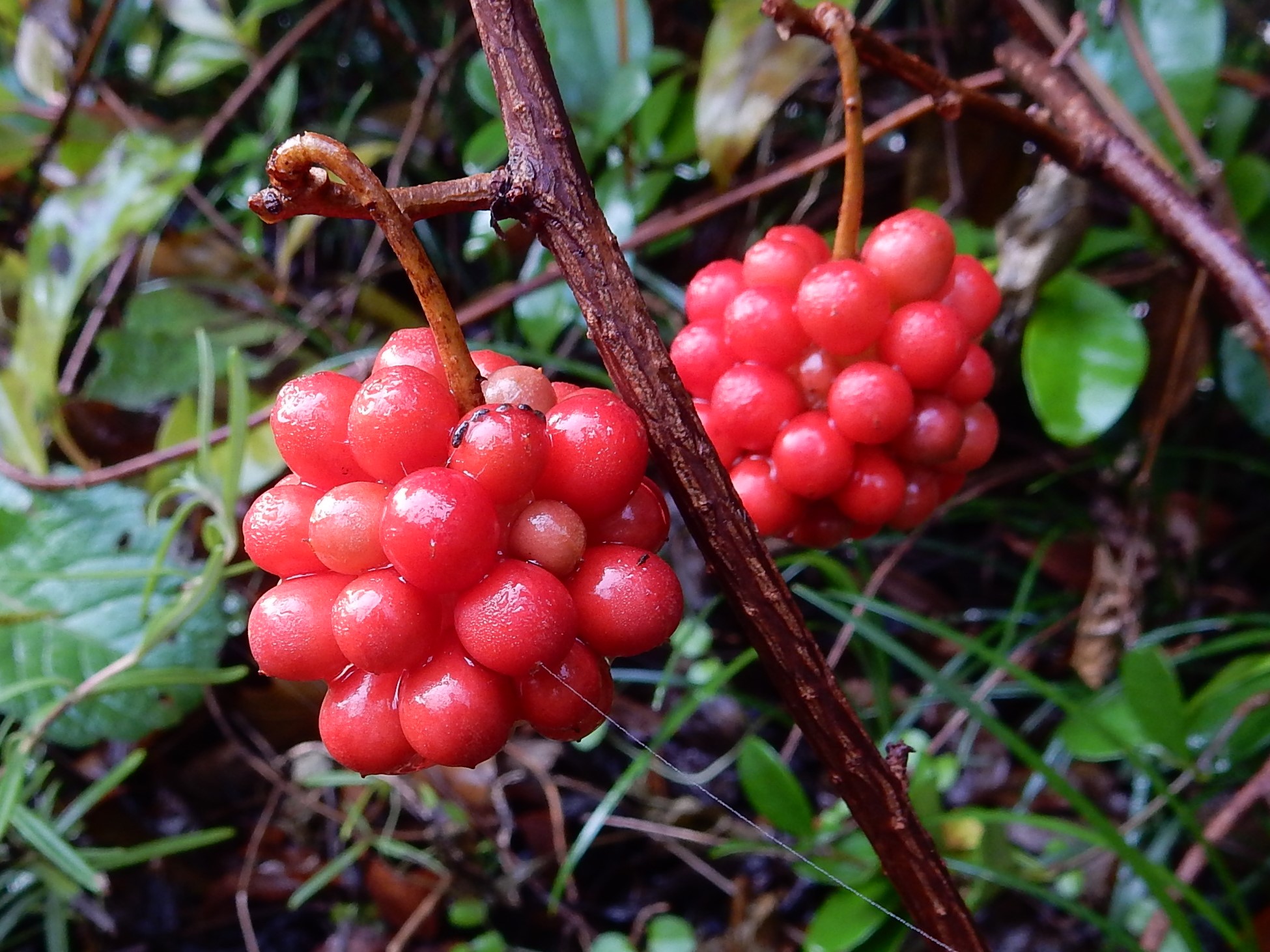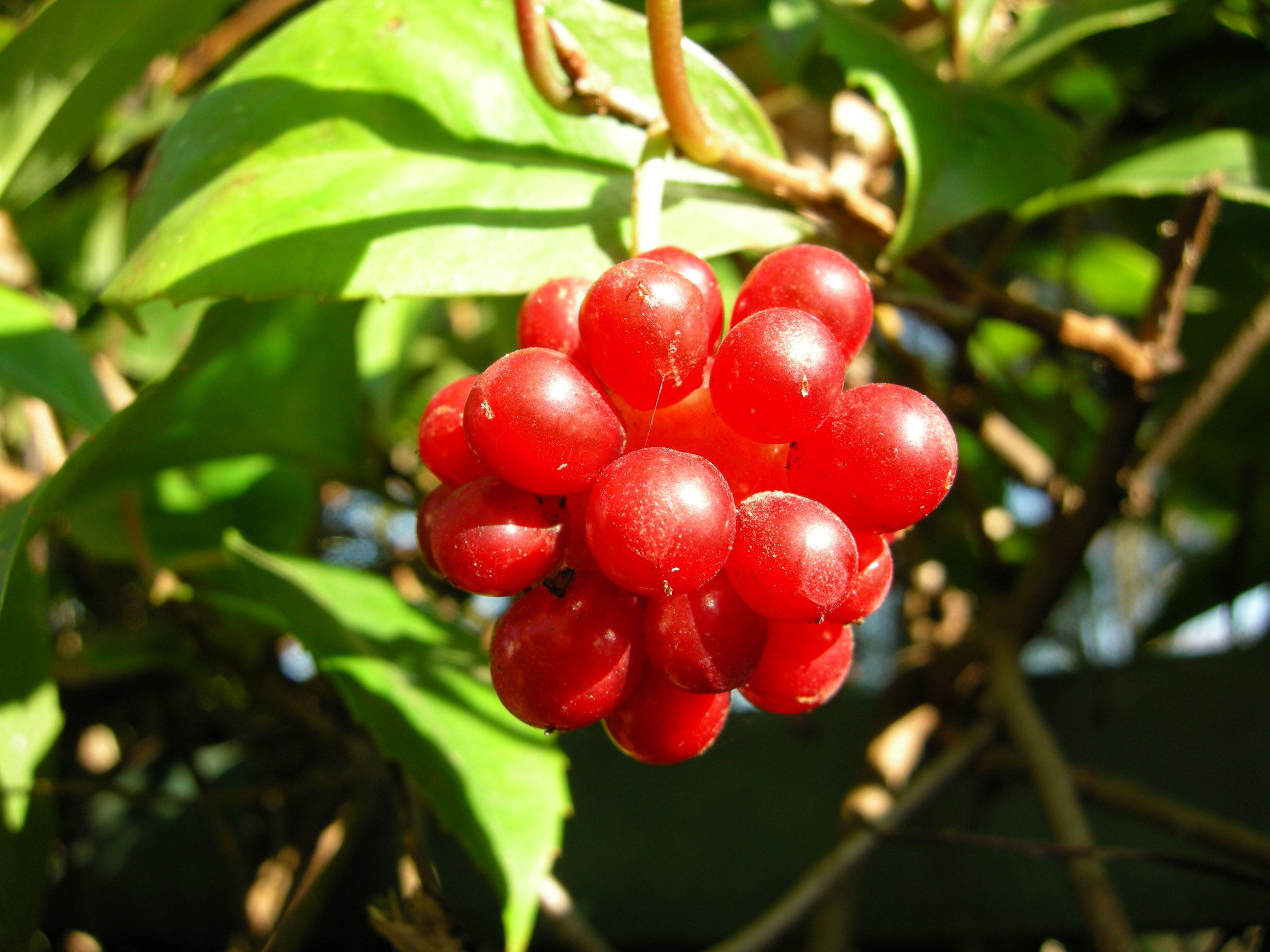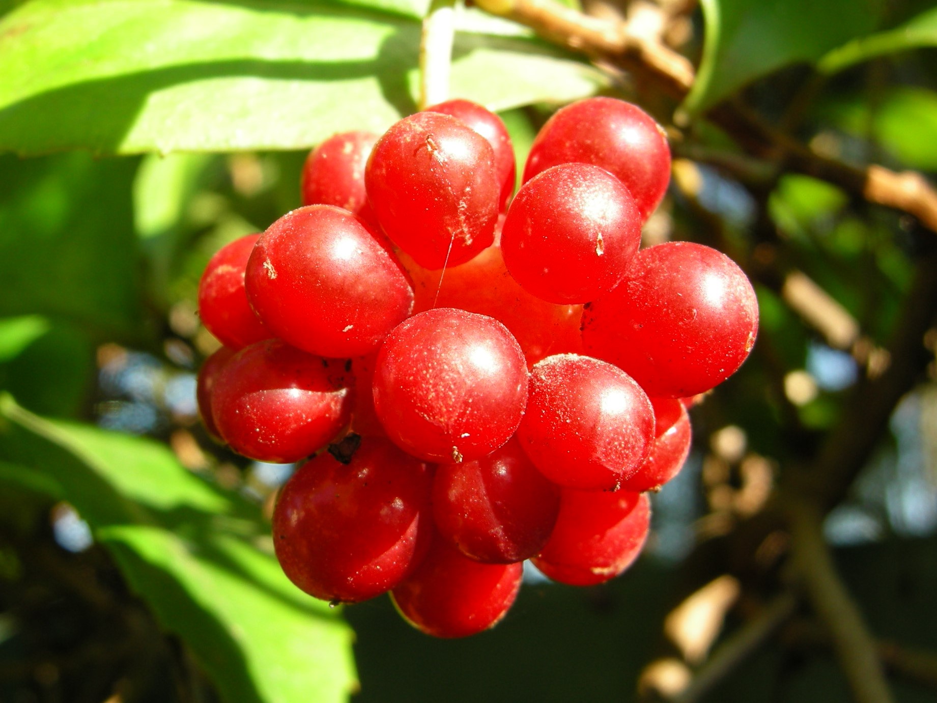 秋に赤く熟す球状の果実は人気です。茎を水に浸すと粘液が出ます。この粘液は整髪料として使われていました。別名ビナンカズラ(美男葛)の所以です。多数の雌しべが球状になっているため、受粉にあずかれなかった雌しべは結実できず、隙間があいていびつになります。