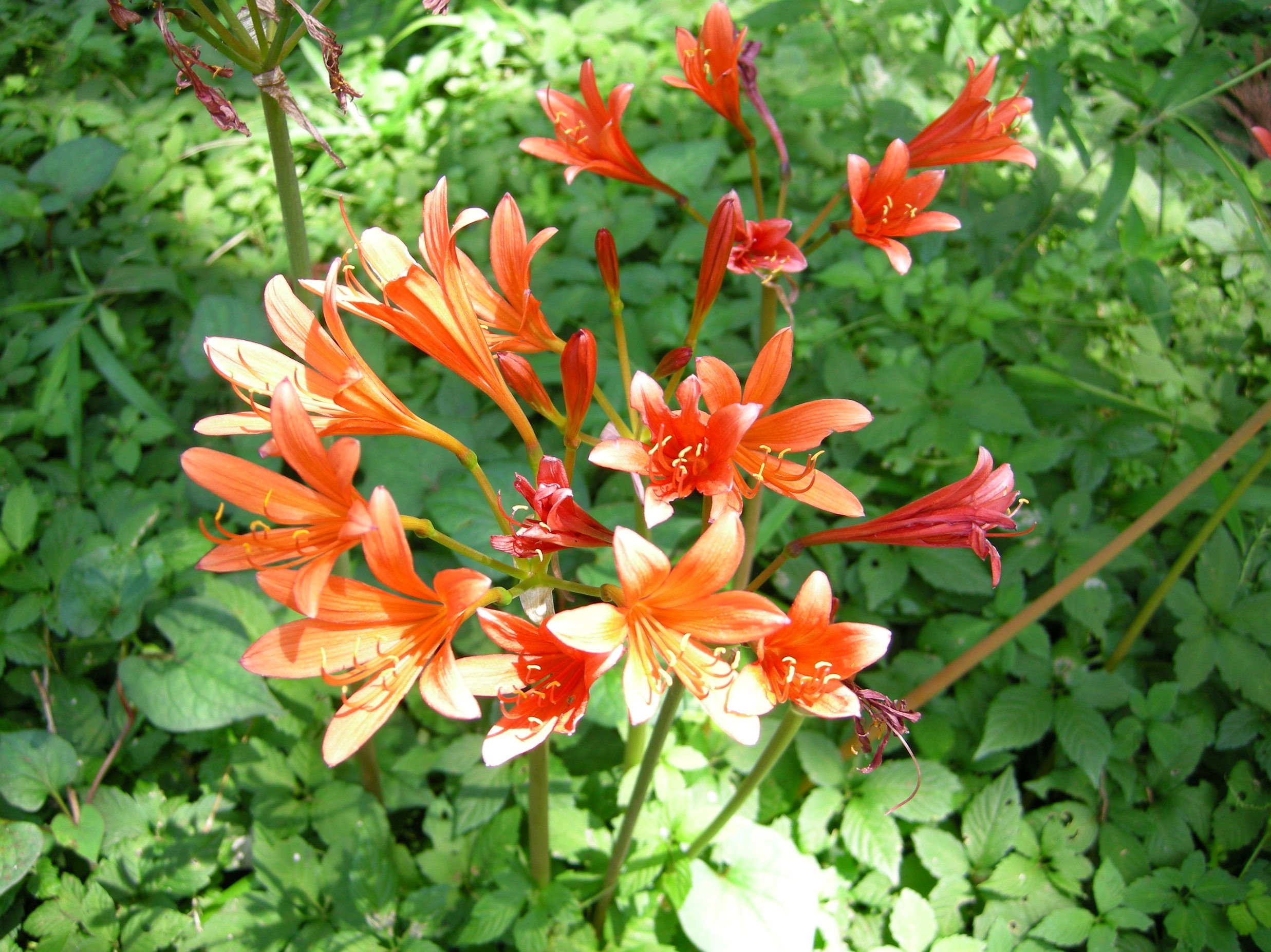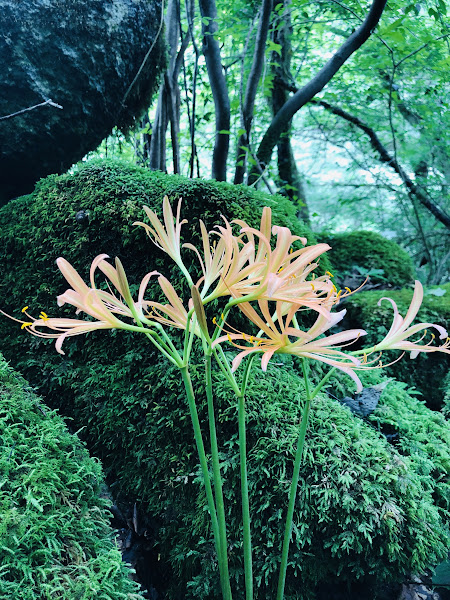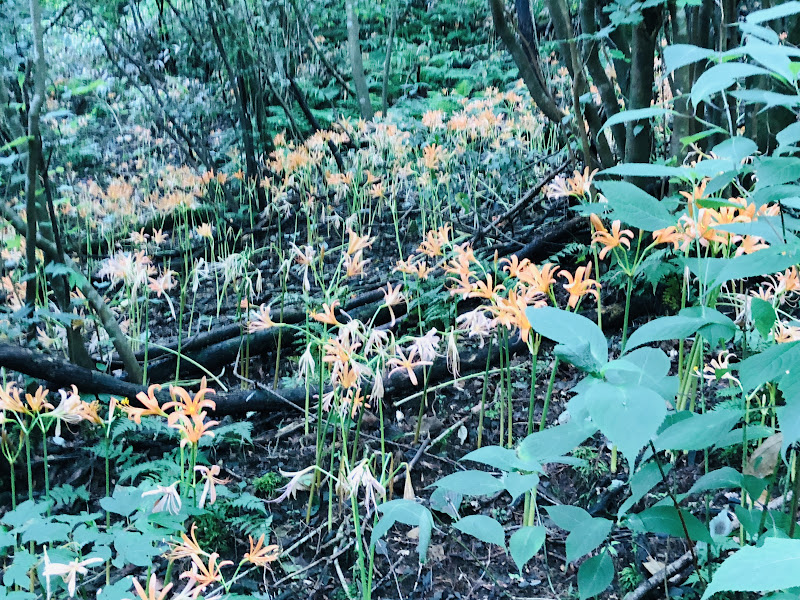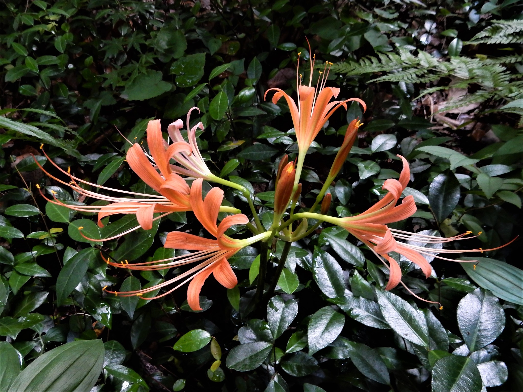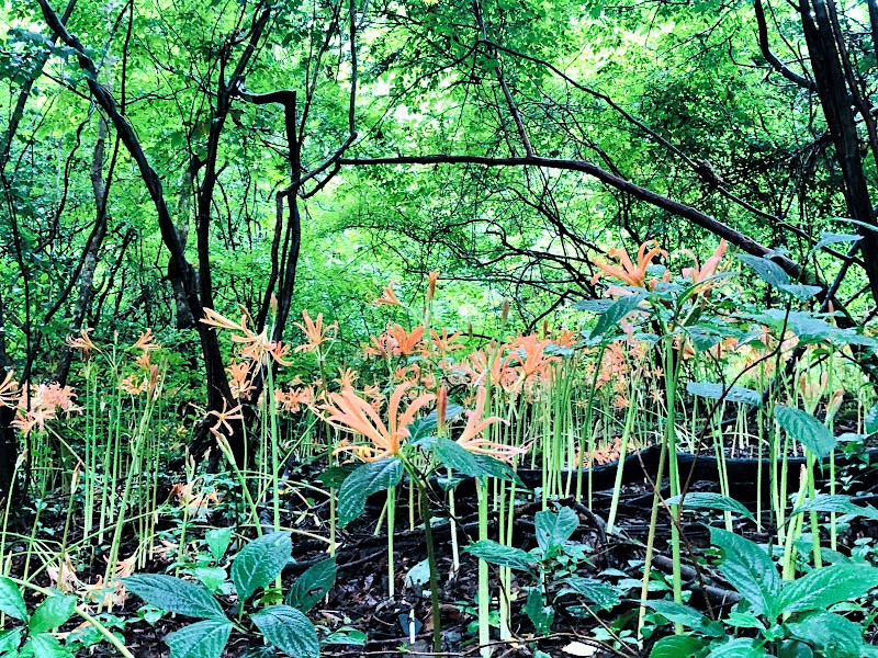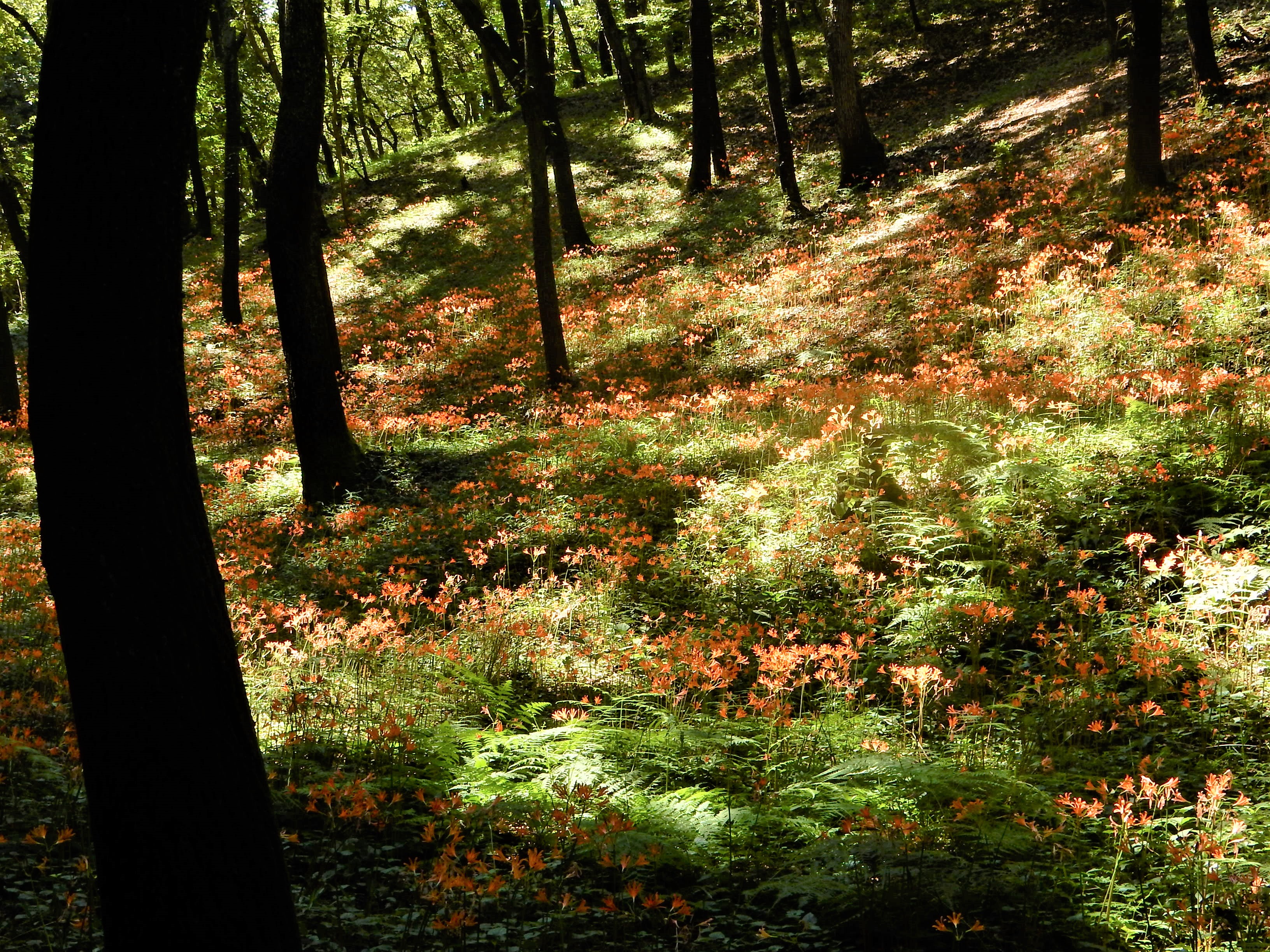 木漏れ日の中で咲き乱れるオレンジ色の花は、どこか儚げで、幻想的で、心惹かれる光景です。猛暑の中で出かけなければ見ることのできない景色です。