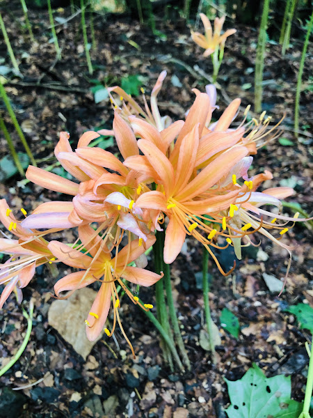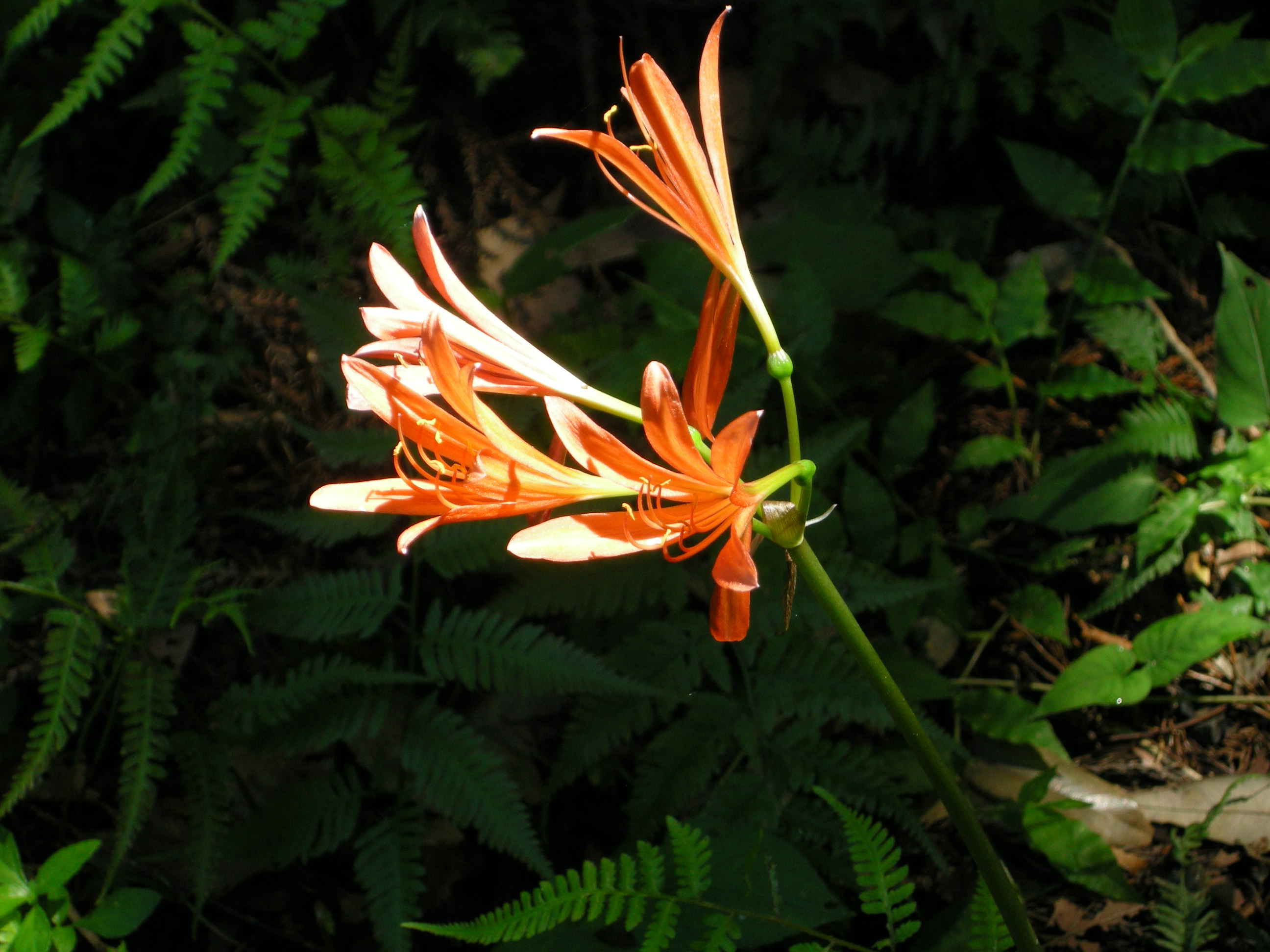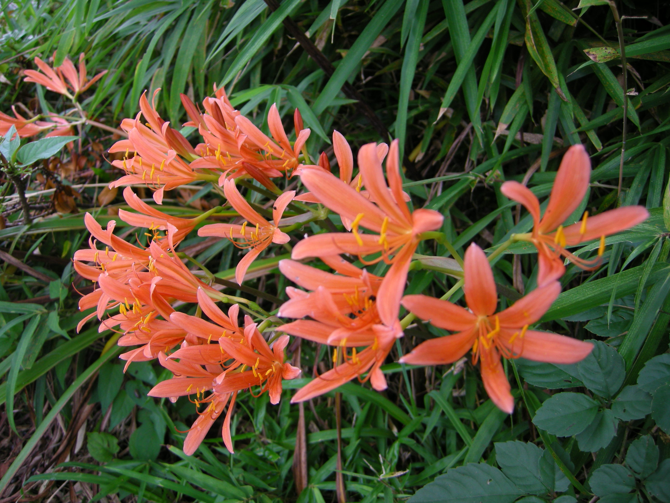 九州方面には変種でオオキツネノカミソリが自生します。全体に大振りで、雄しべ、雌しべが花弁よりも長く突き出しています。