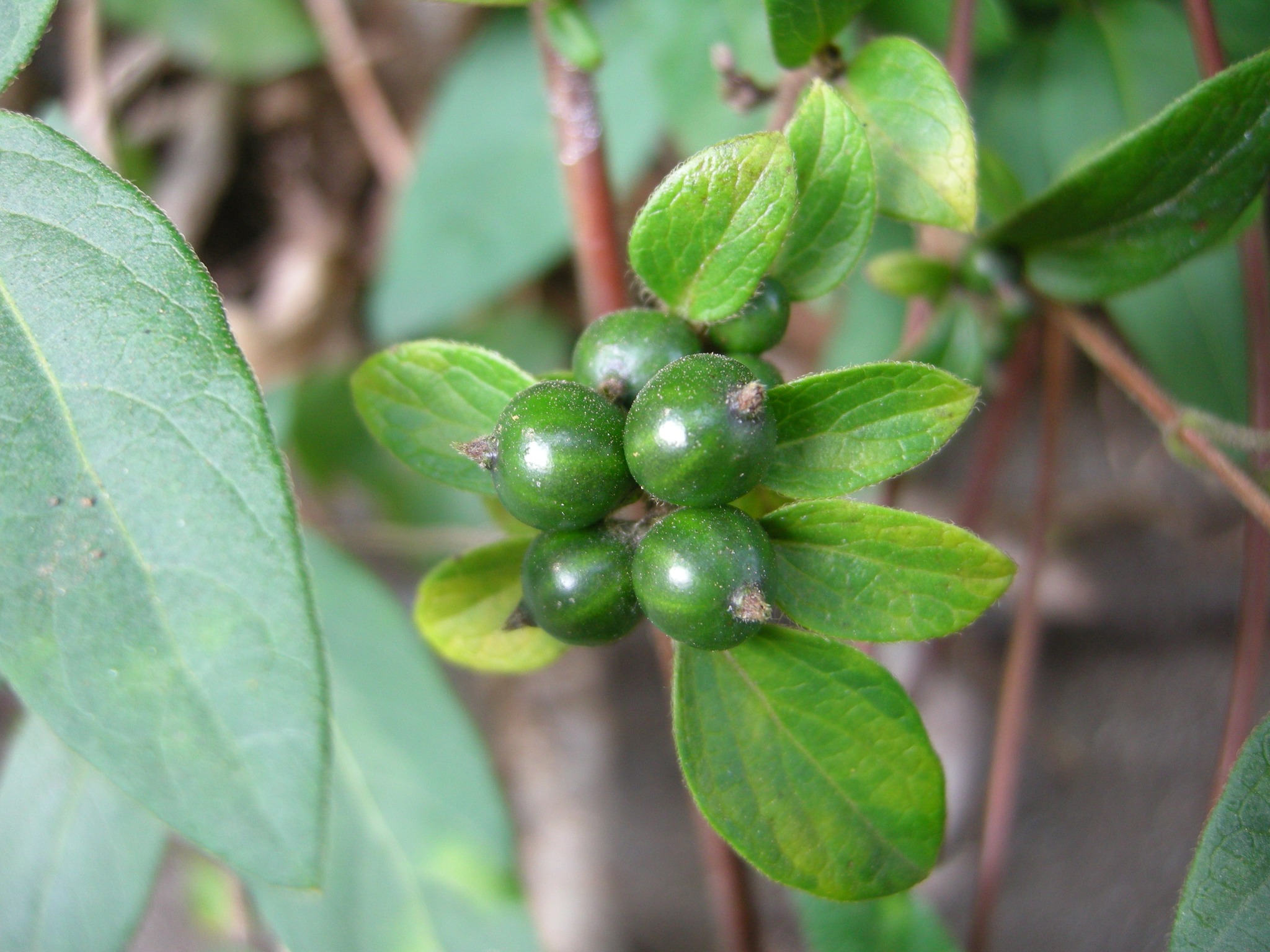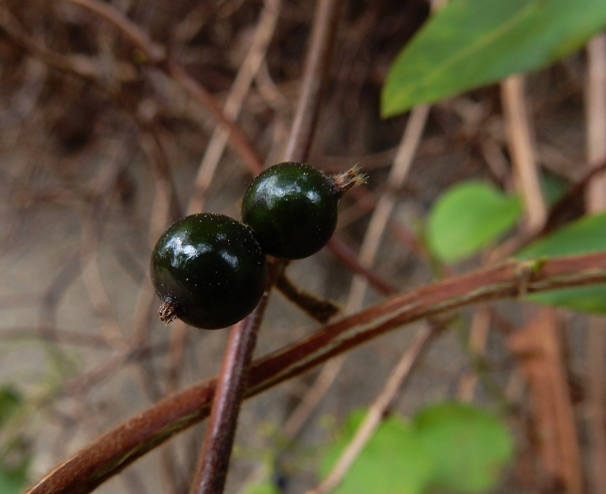 花は2個ずつがセットになって咲きます。花後結実する果実も2個がセットになっており、秋に黒く熟します。