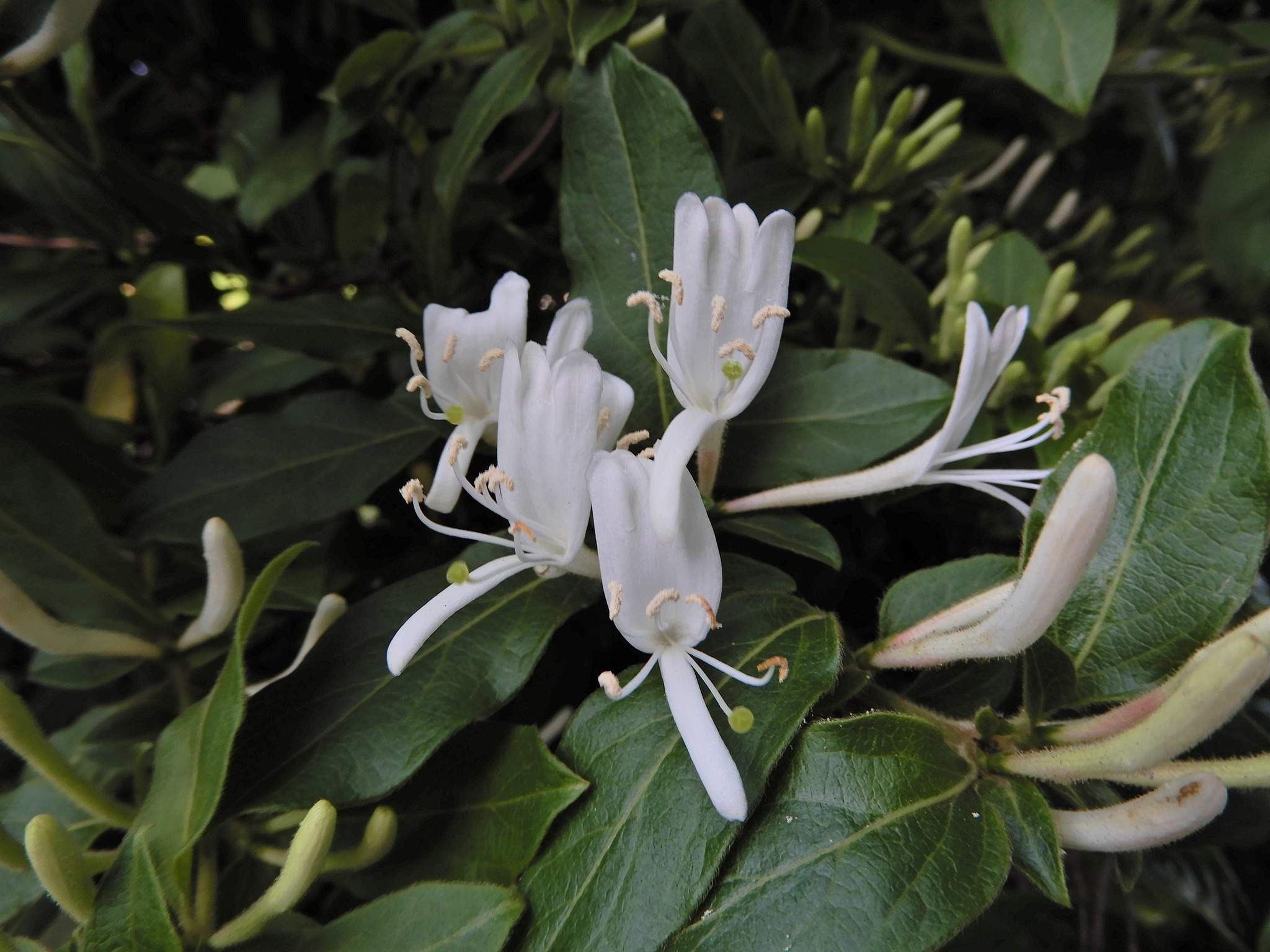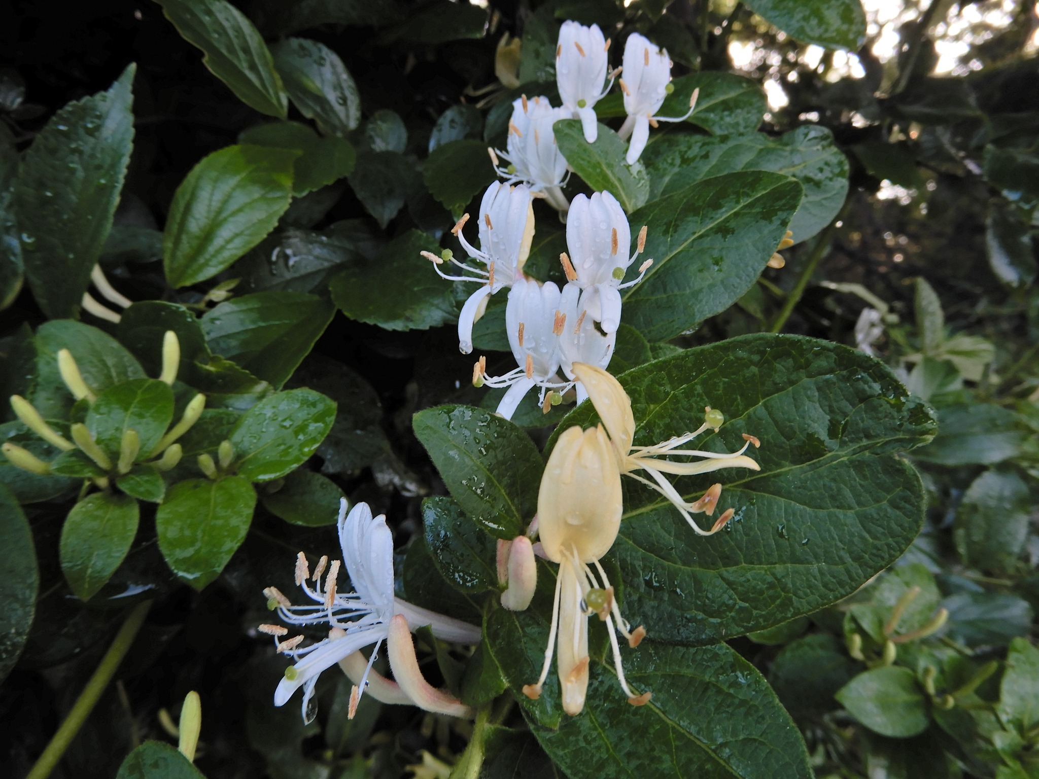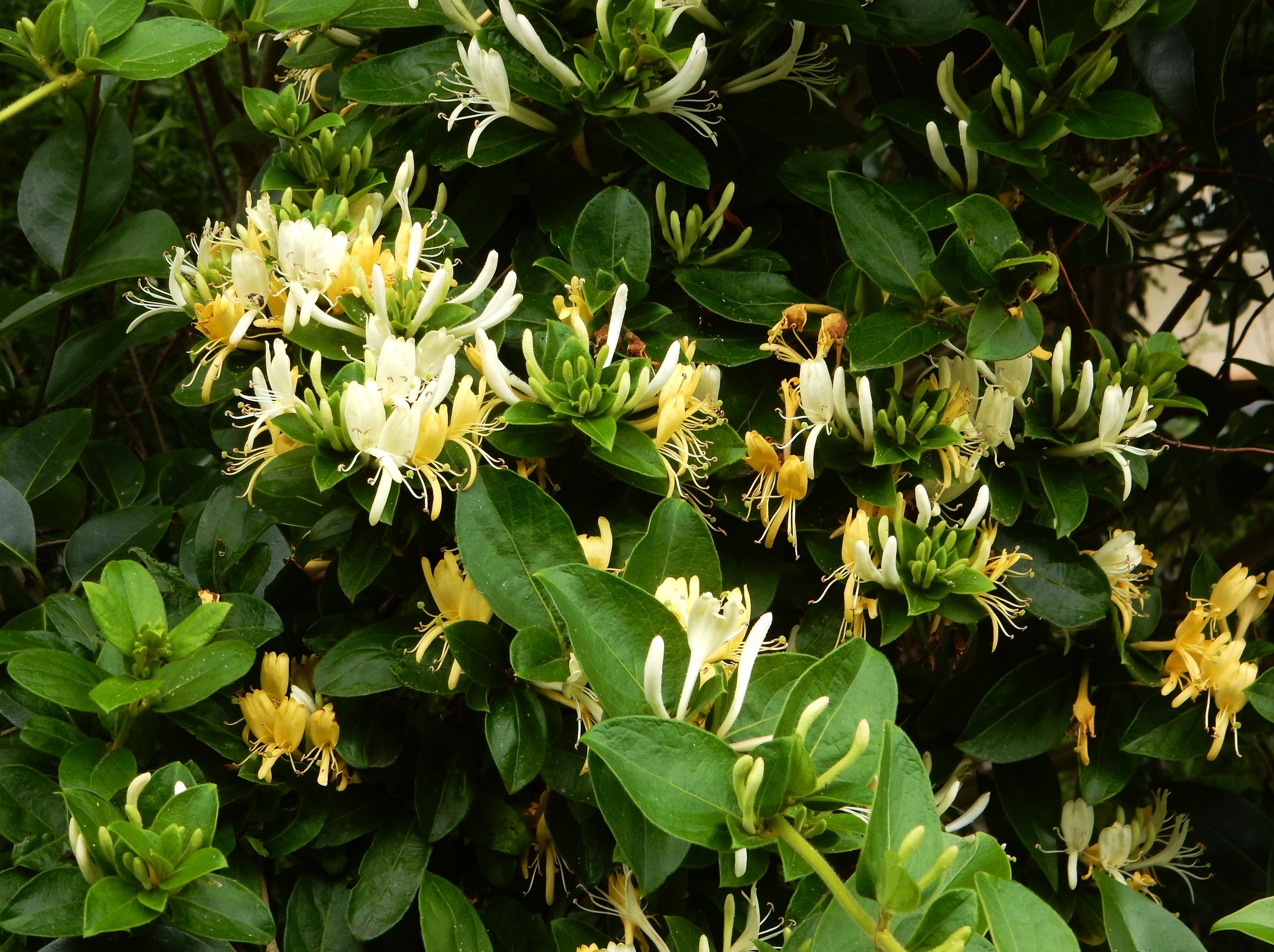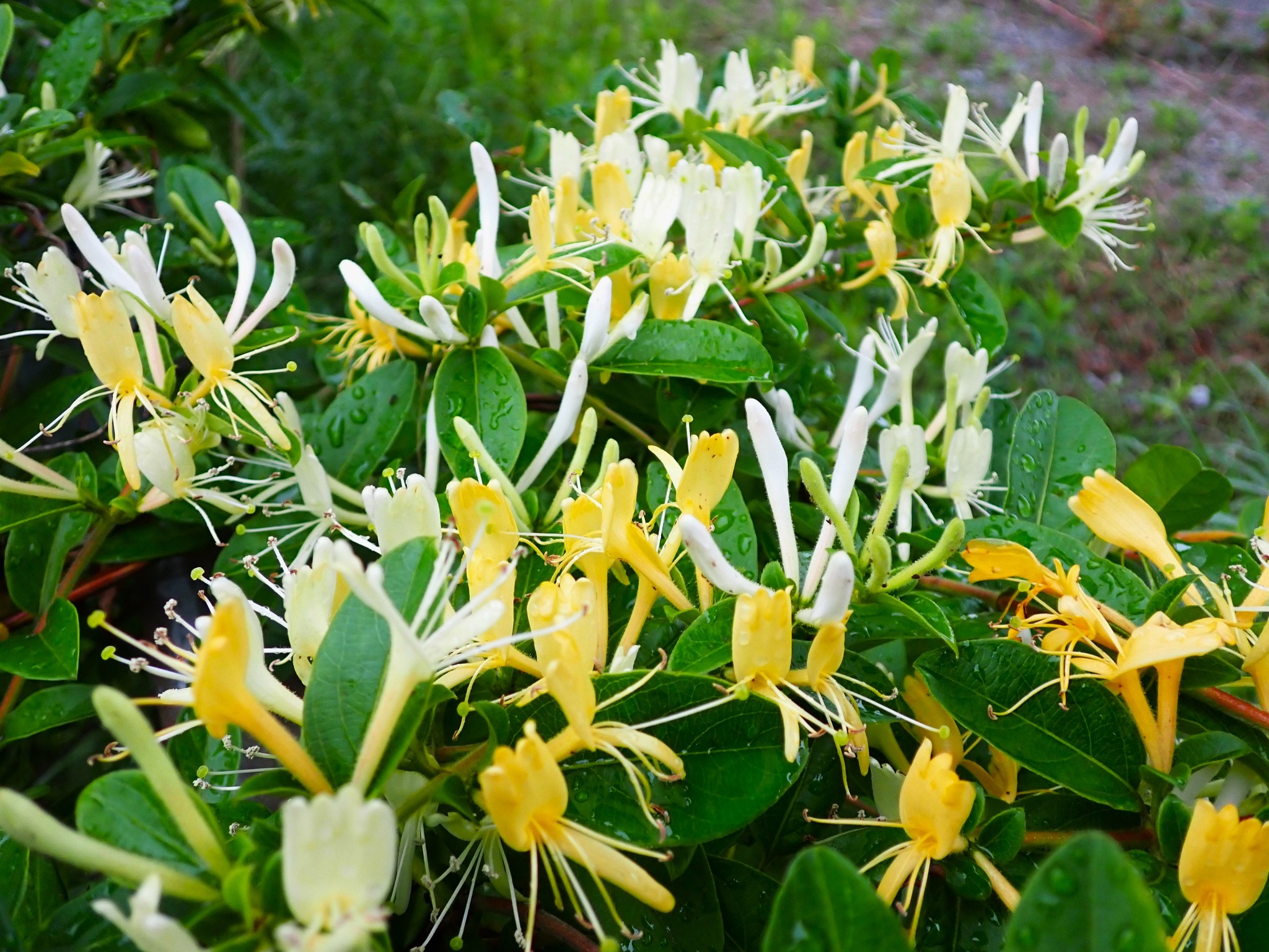 夕方、強い香りで存在をアピールするように白い花を咲かせます。花の蜜を吸って遊んだ経験のある方もいらっしゃるでしょうか。スイカズラ(吸い葛)の名前の由来と言われています。初め白色で咲く花は、後に黄色になります。キンギンカ(金銀花)の所以です。また、常緑で、冬を耐え忍んで葉をつけていることからニンドウ(忍冬)とも呼ばれます。
