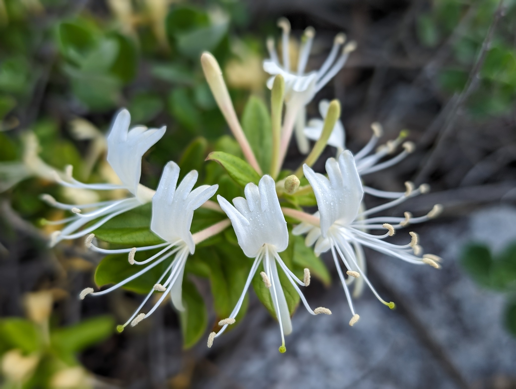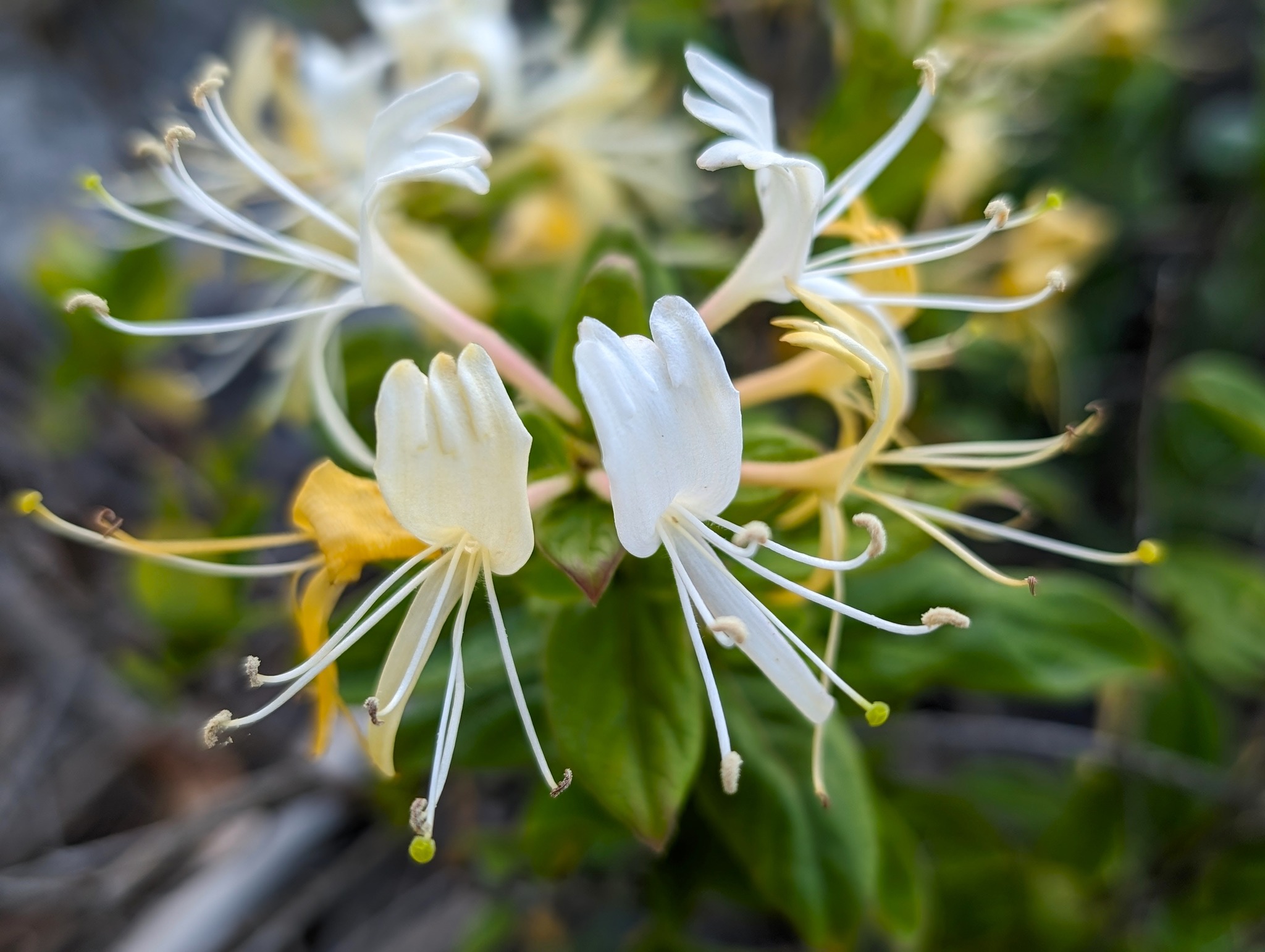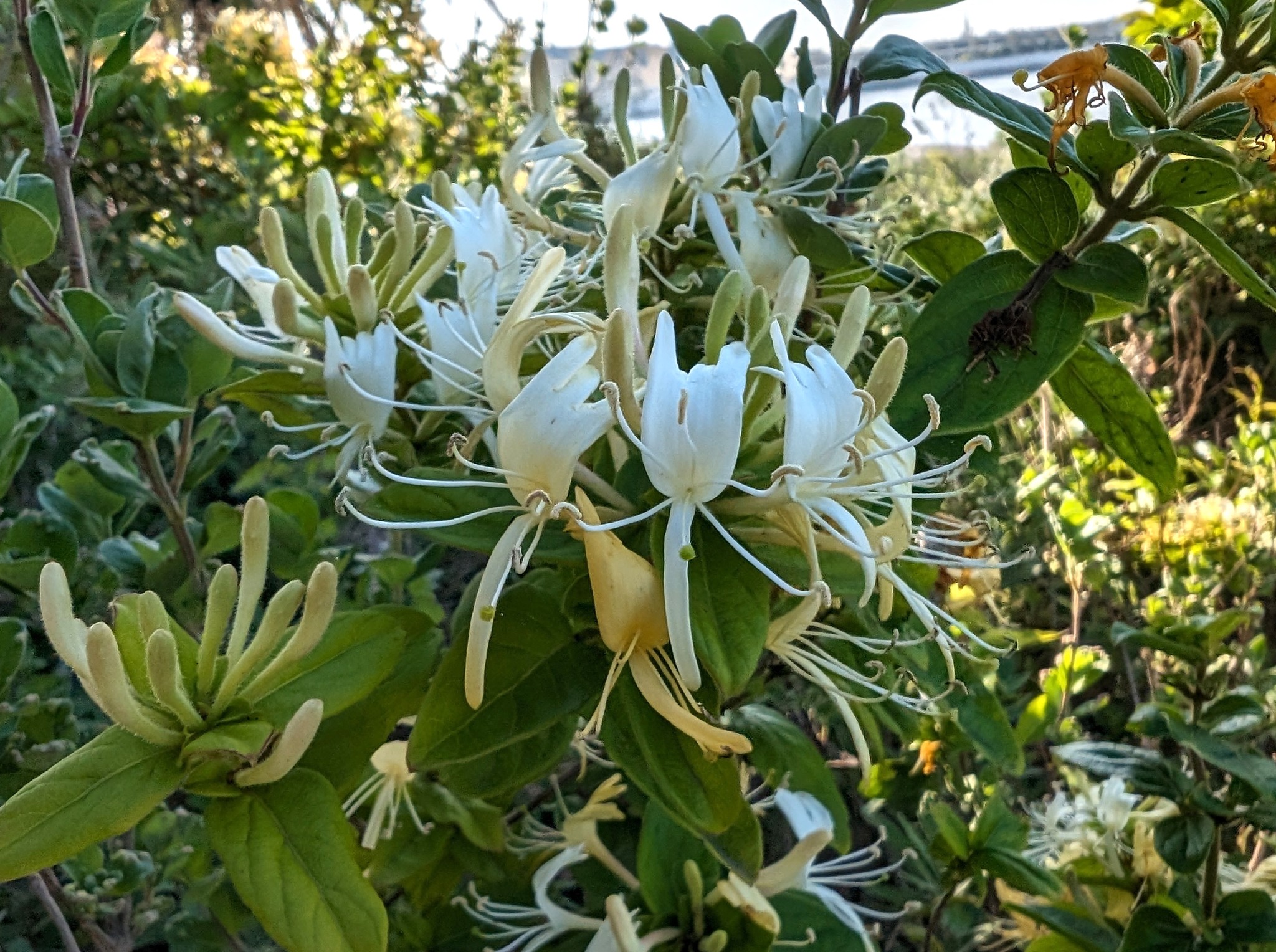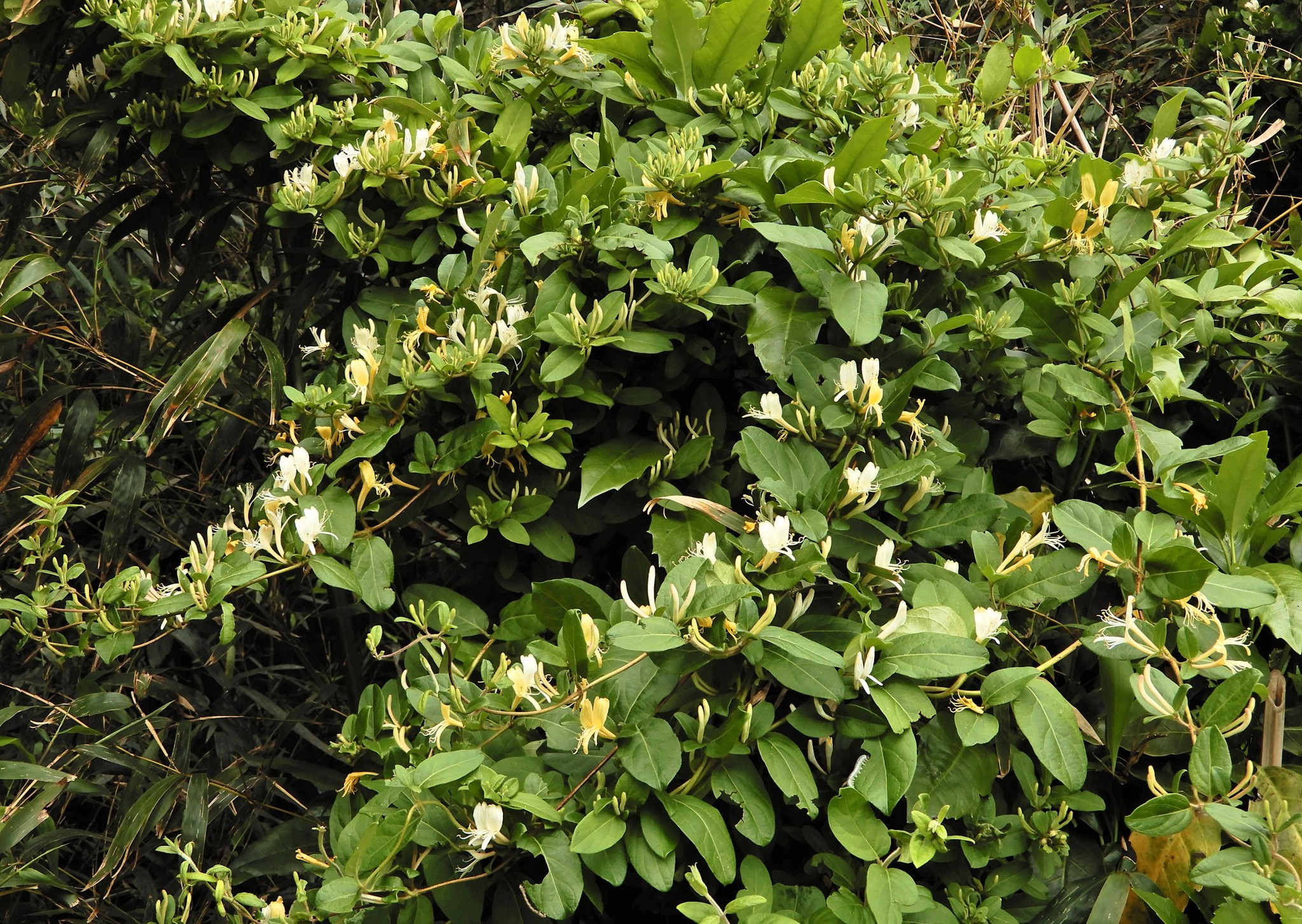 夕方、強い香りで存在をアピールするように白い花を咲かせます。花の蜜を吸って遊んだ経験のある方もいらっしゃるでしょうか。スイカズラ(吸い葛)の名前の由来と言われています。初め白色で咲く花は、後に黄色になります。キンギンカ(金銀花)の所以です。また、常緑で、冬を耐え忍んで葉をつけていることからニンドウ(忍冬)とも呼ばれます。