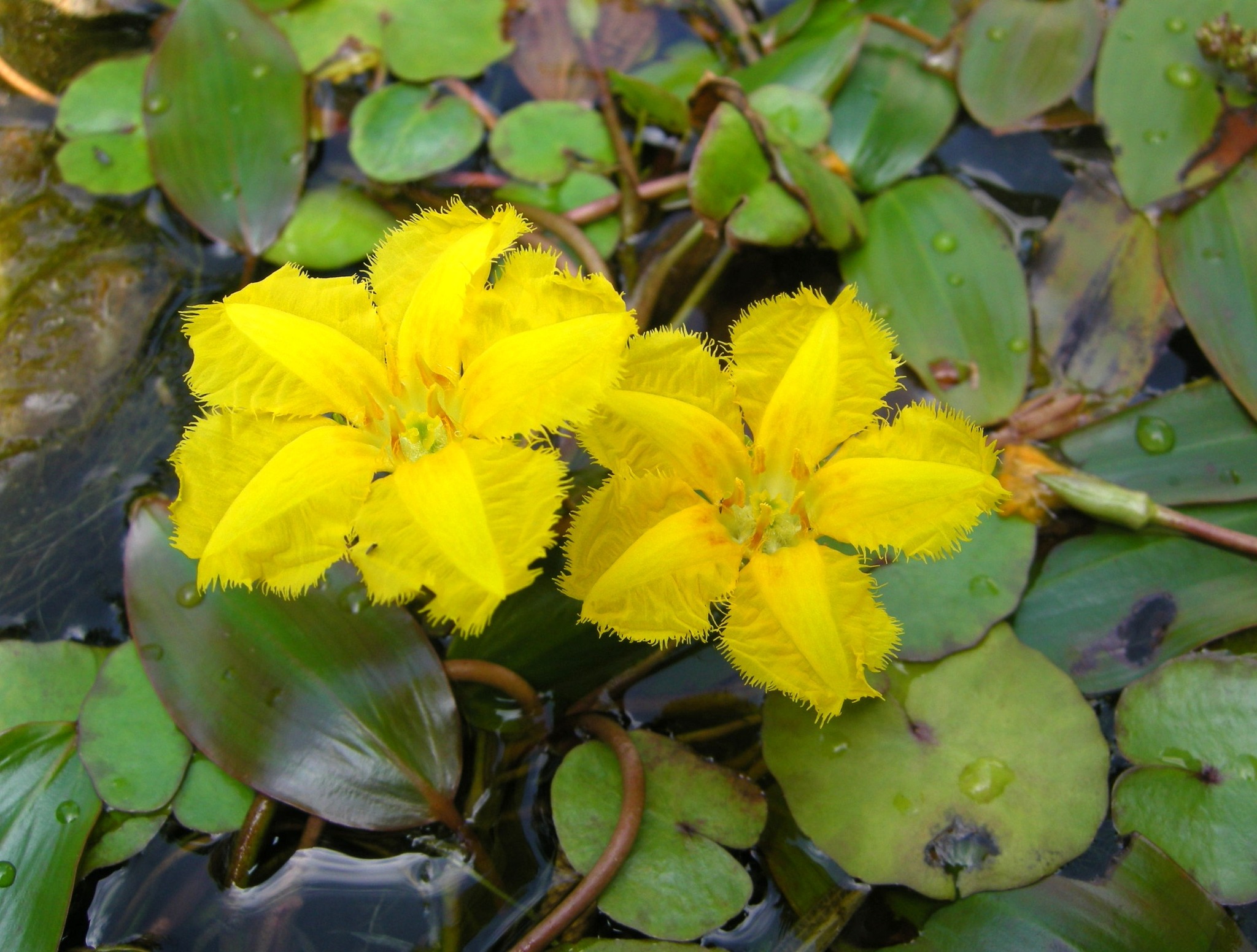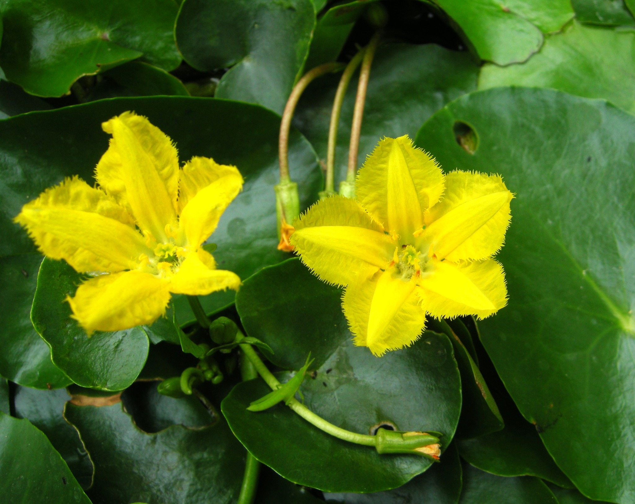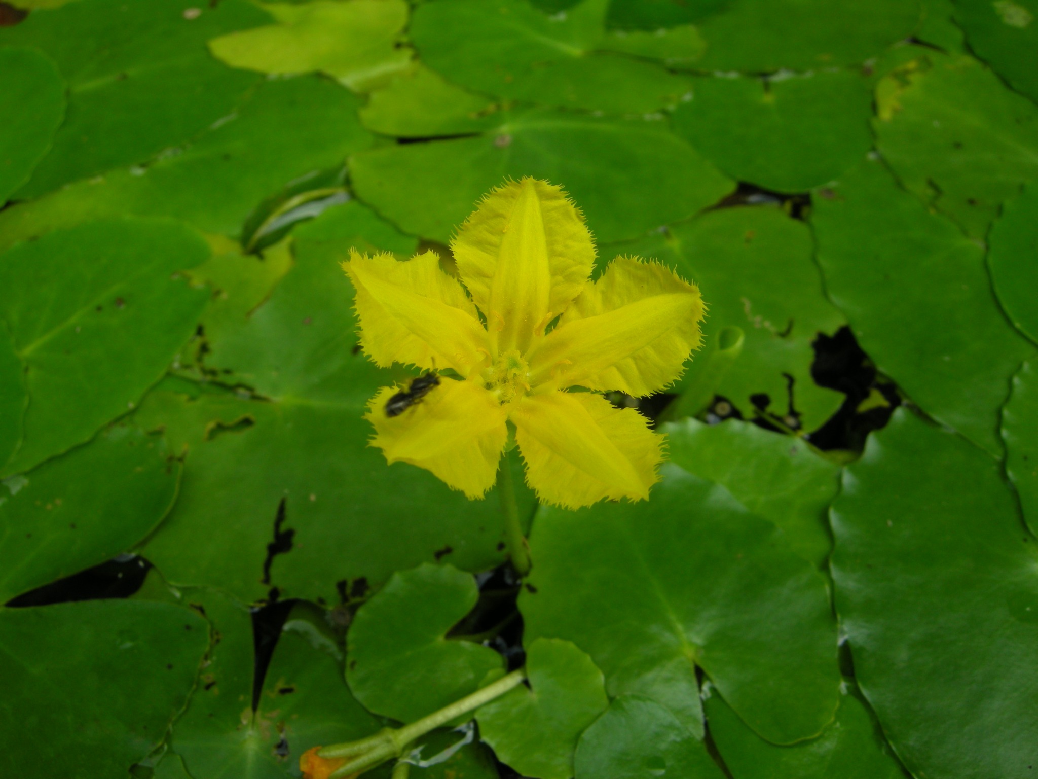 水に浮かぶ葉の間から、花柄を突き出すように黄色い花を咲かせます。雌しべが長くて雄しべが短いタイプの花を咲かせる株と、雌しべが短くて雄しべが長いタイプの花を咲かせる株があります。両方のタイプの株がないと、受粉、結実が正常に行われませんので、種子繁殖はできません。国内での種子繁殖は稀との報告があります。
