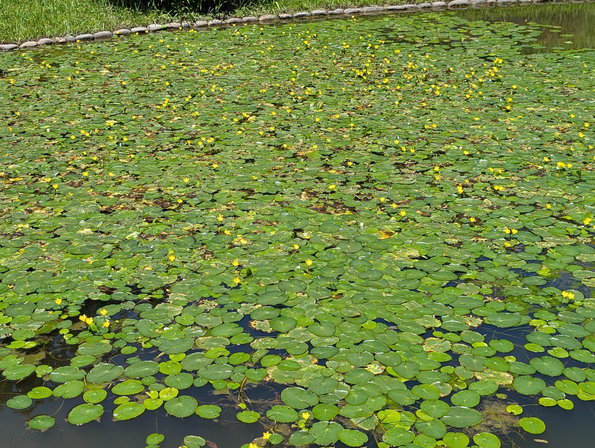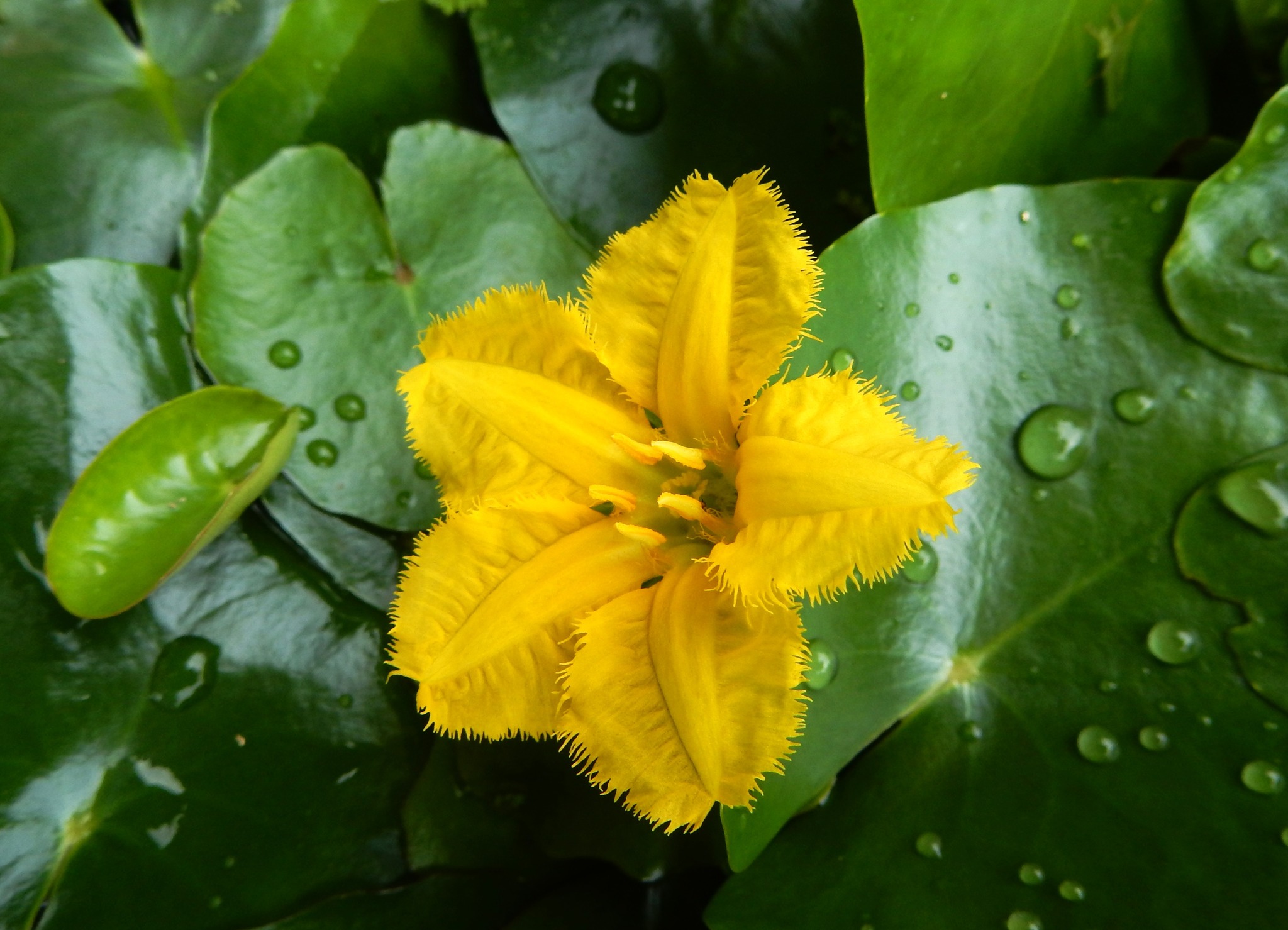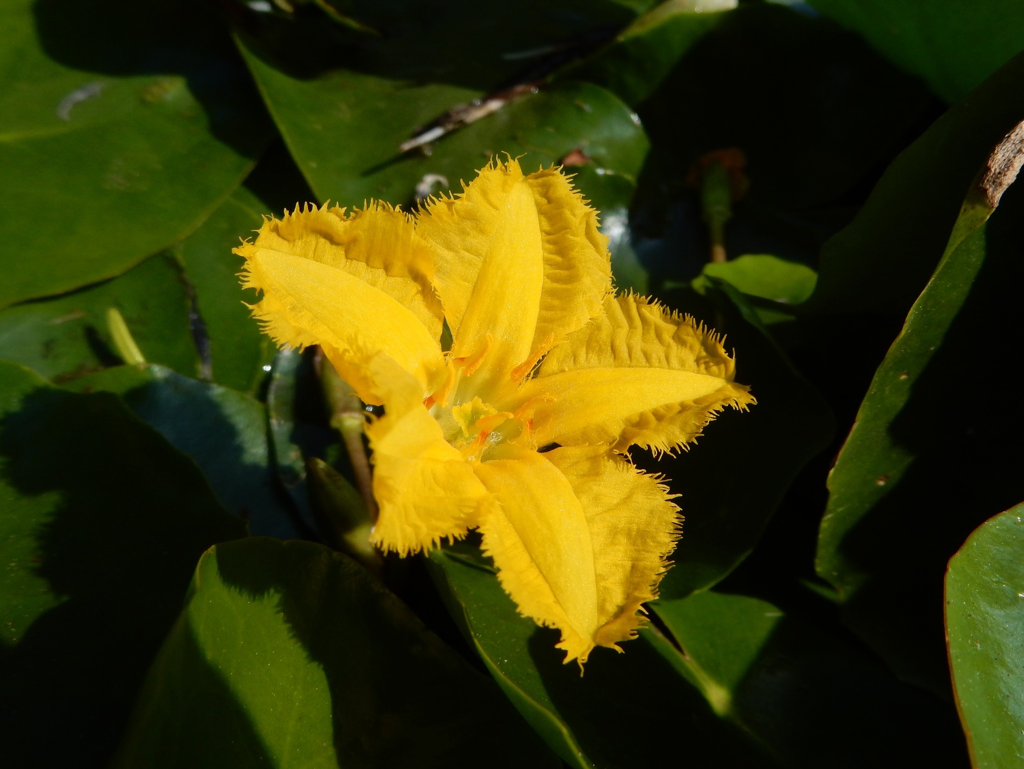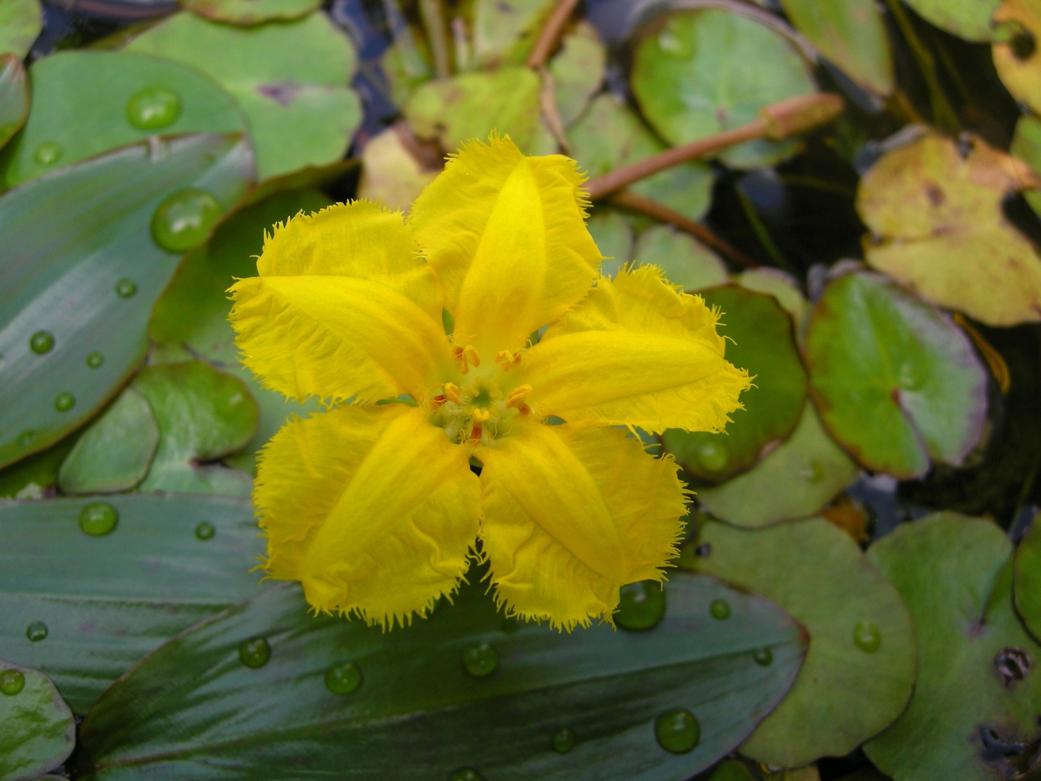 水に浮かぶ葉の間から、花柄を突き出すように黄色い花を咲かせます。雌しべが長くて雄しべが短いタイプの花を咲かせる株と、雌しべが短くて雄しべが長いタイプの花を咲かせる株があります。両方のタイプの株がないと、受粉、結実が正常に行われませんので、種子繁殖はできません。国内での種子繁殖は稀との報告があります。