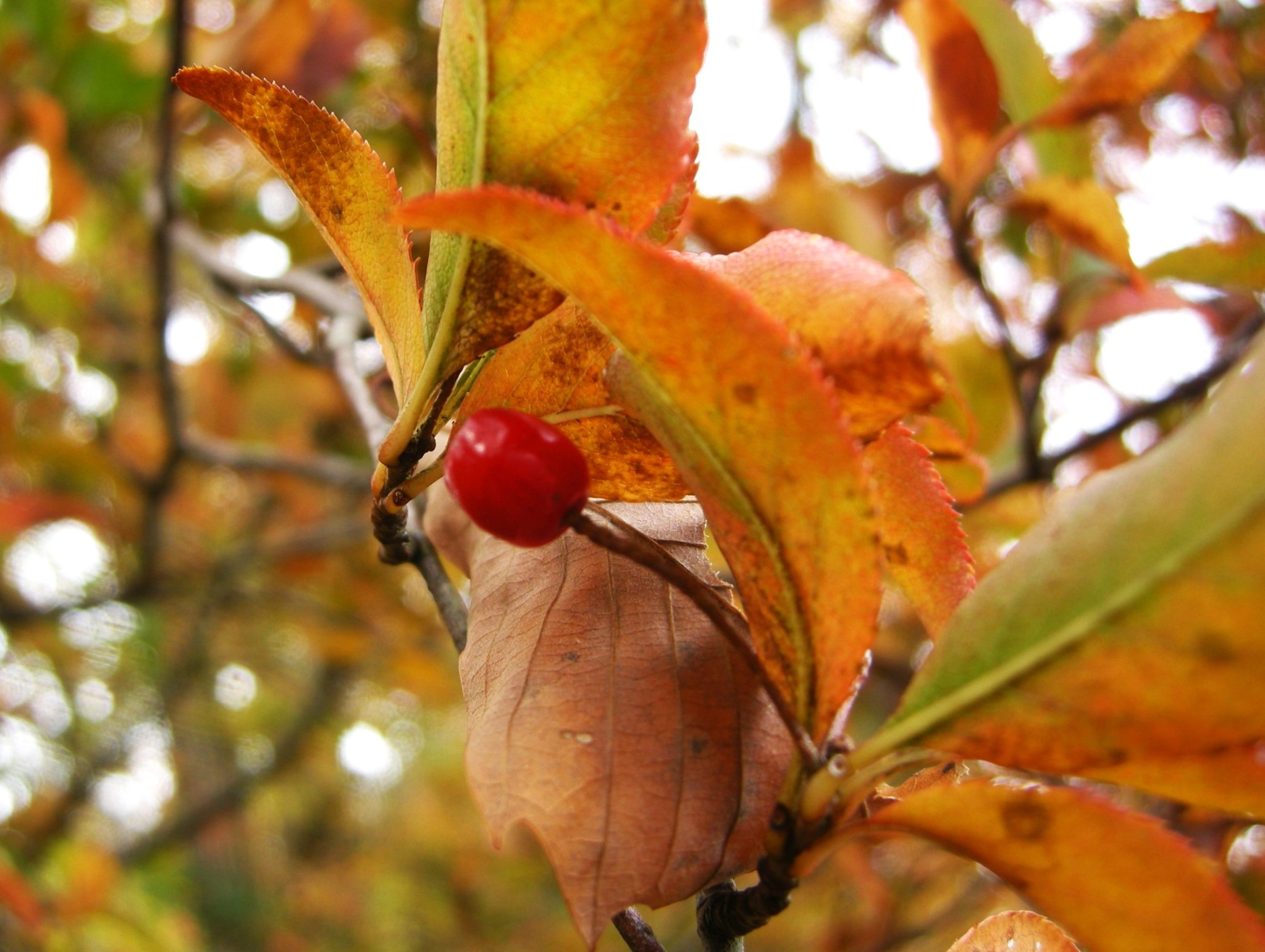 春に咲く白い花も可愛いのですが、黄葉した葉に映える赤い実は注目を集めます。まだ葉が緑色をしている9月には赤くなっている実もあるのですが、注目されるのは黄葉してからのようです。