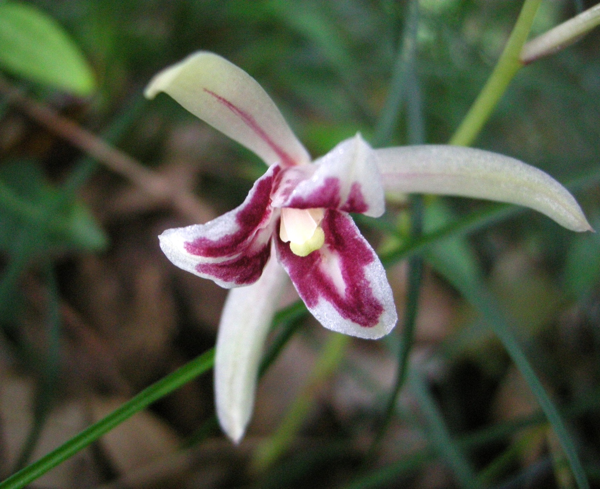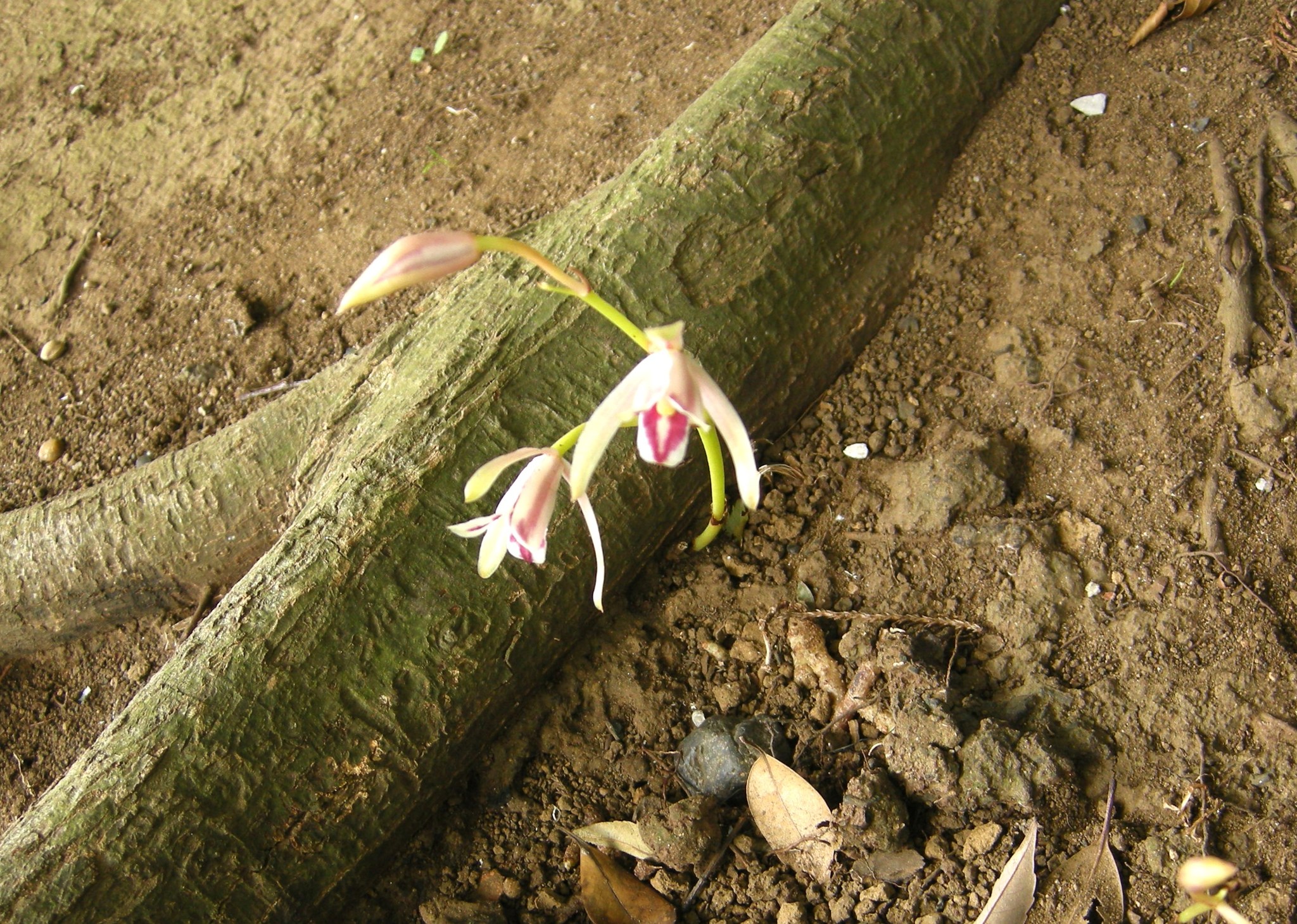 やや薄暗い樹林の林床に小さいシンビジウムの花が咲いている光景をイメージしてみて下さい。