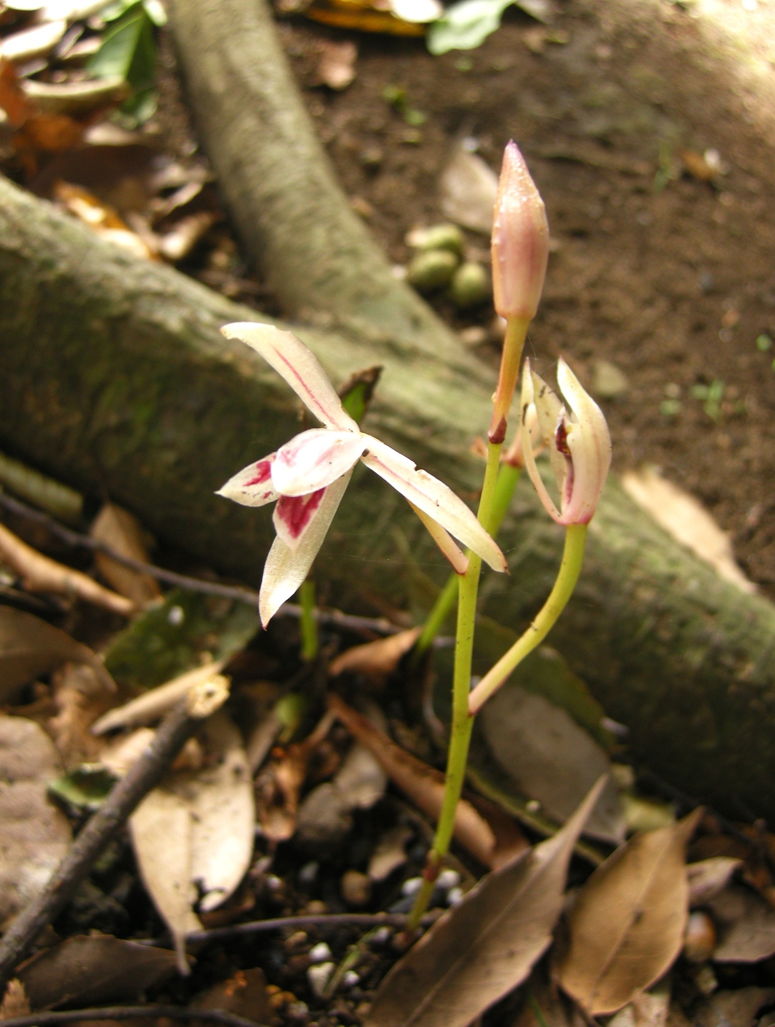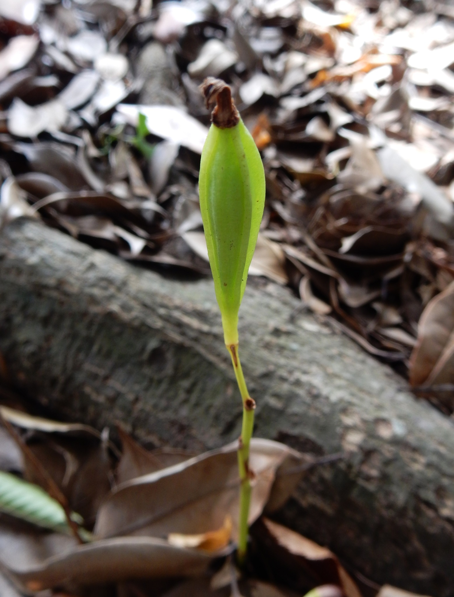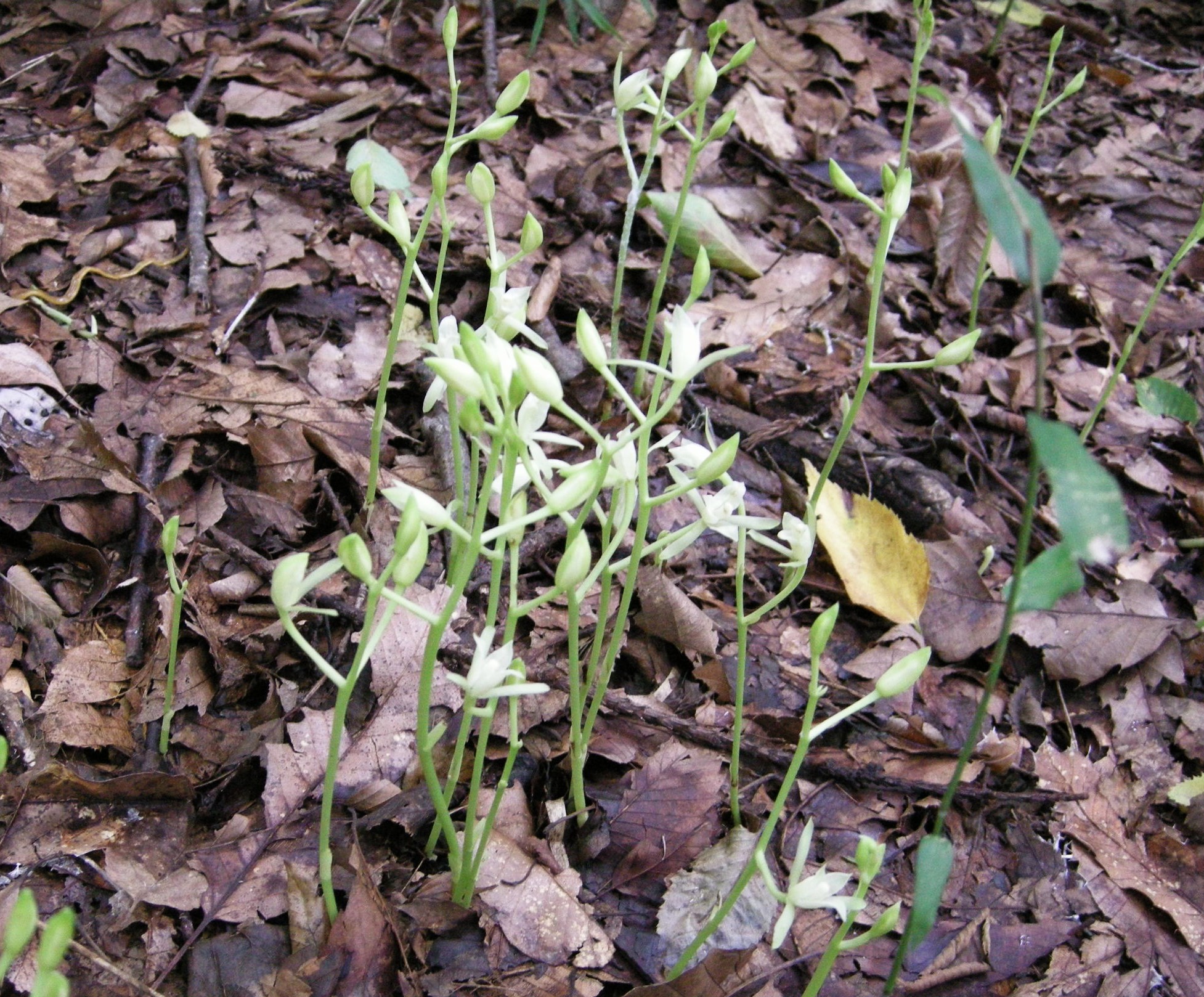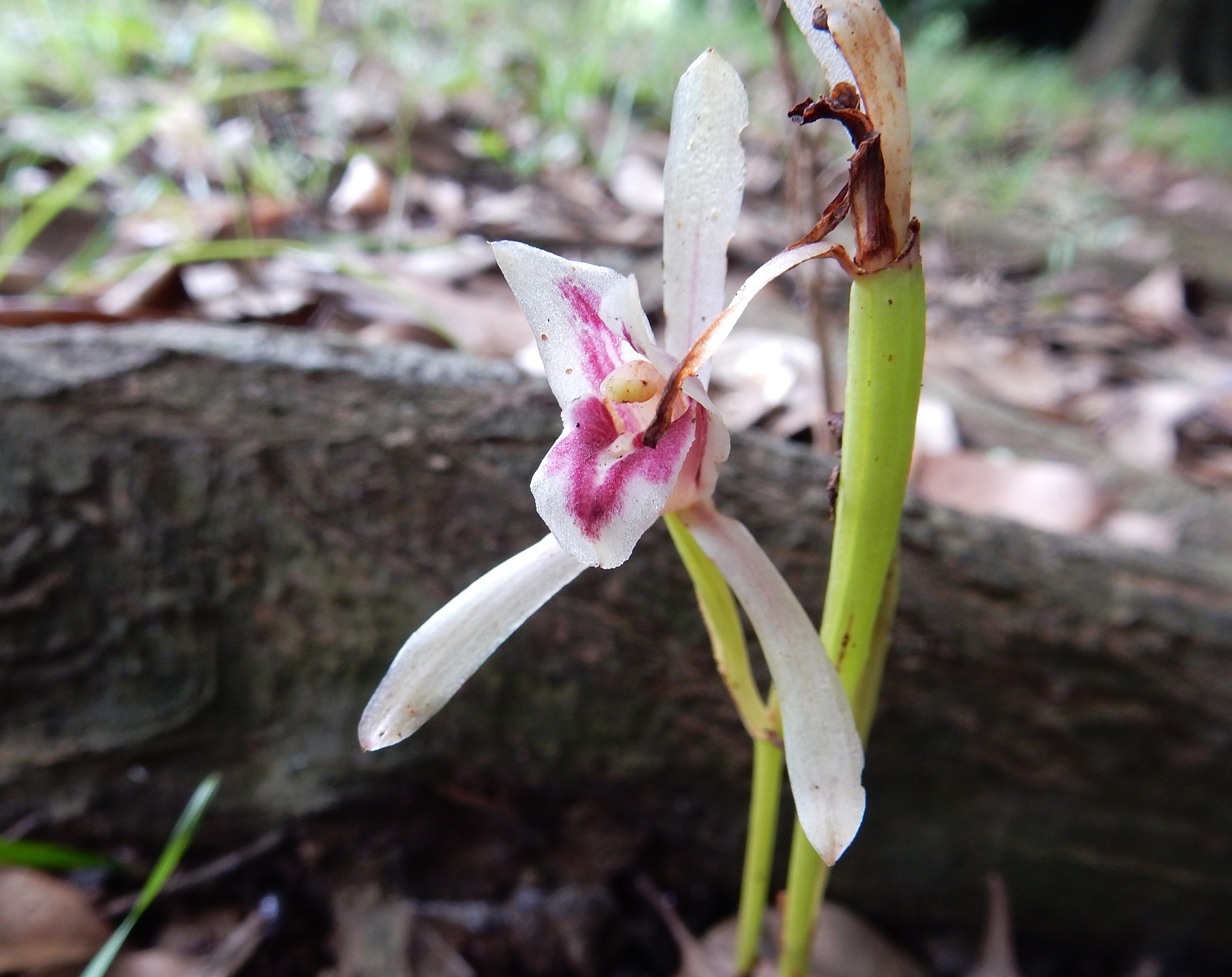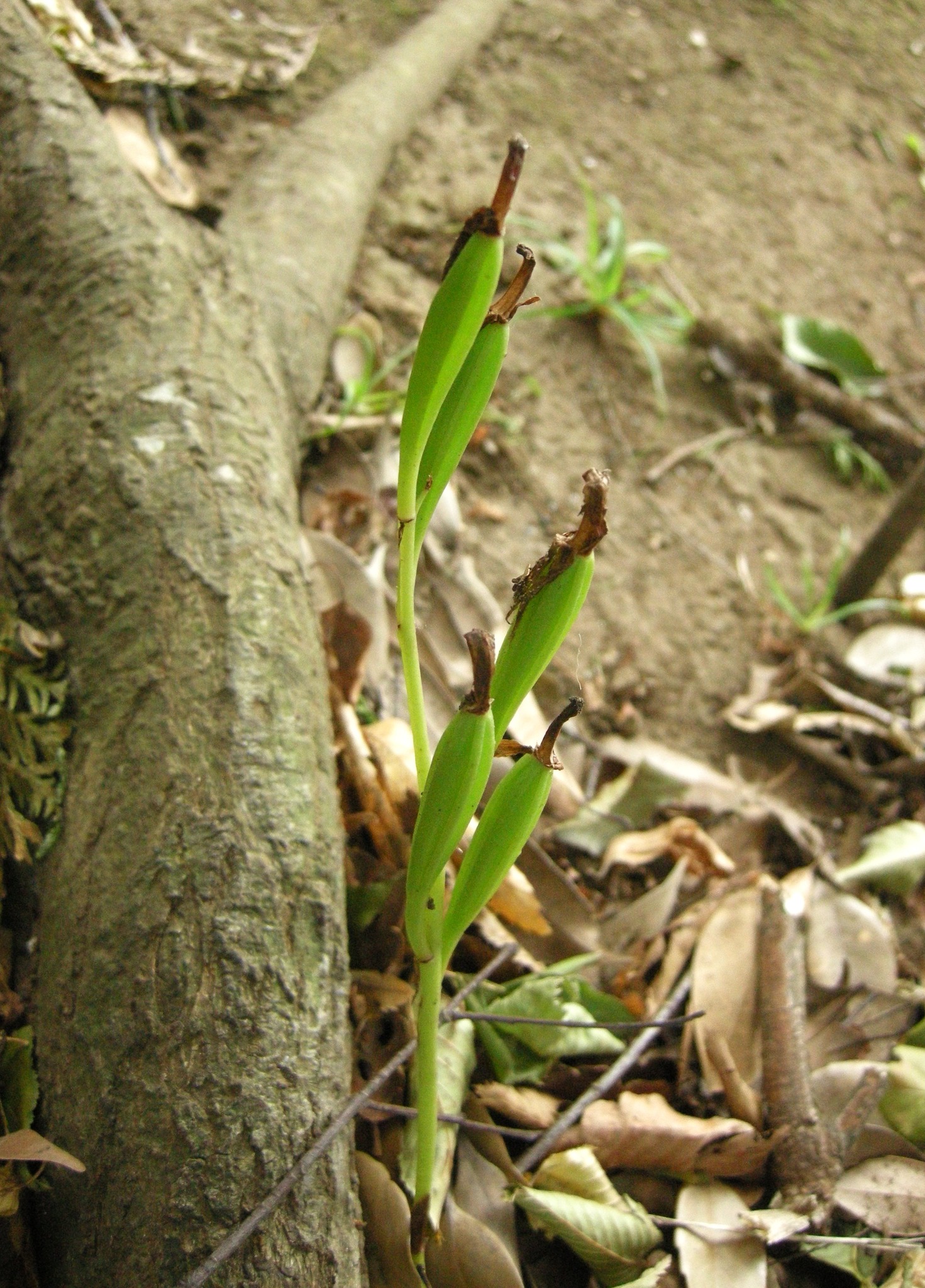 森の中に突然、花茎が現れます。結実もしますが、ラン科植物の種子は微細で、菌類の助けがないと発芽できませんので、種子繁殖は稀です。同じ場所で毎年確認できる保証はありません。