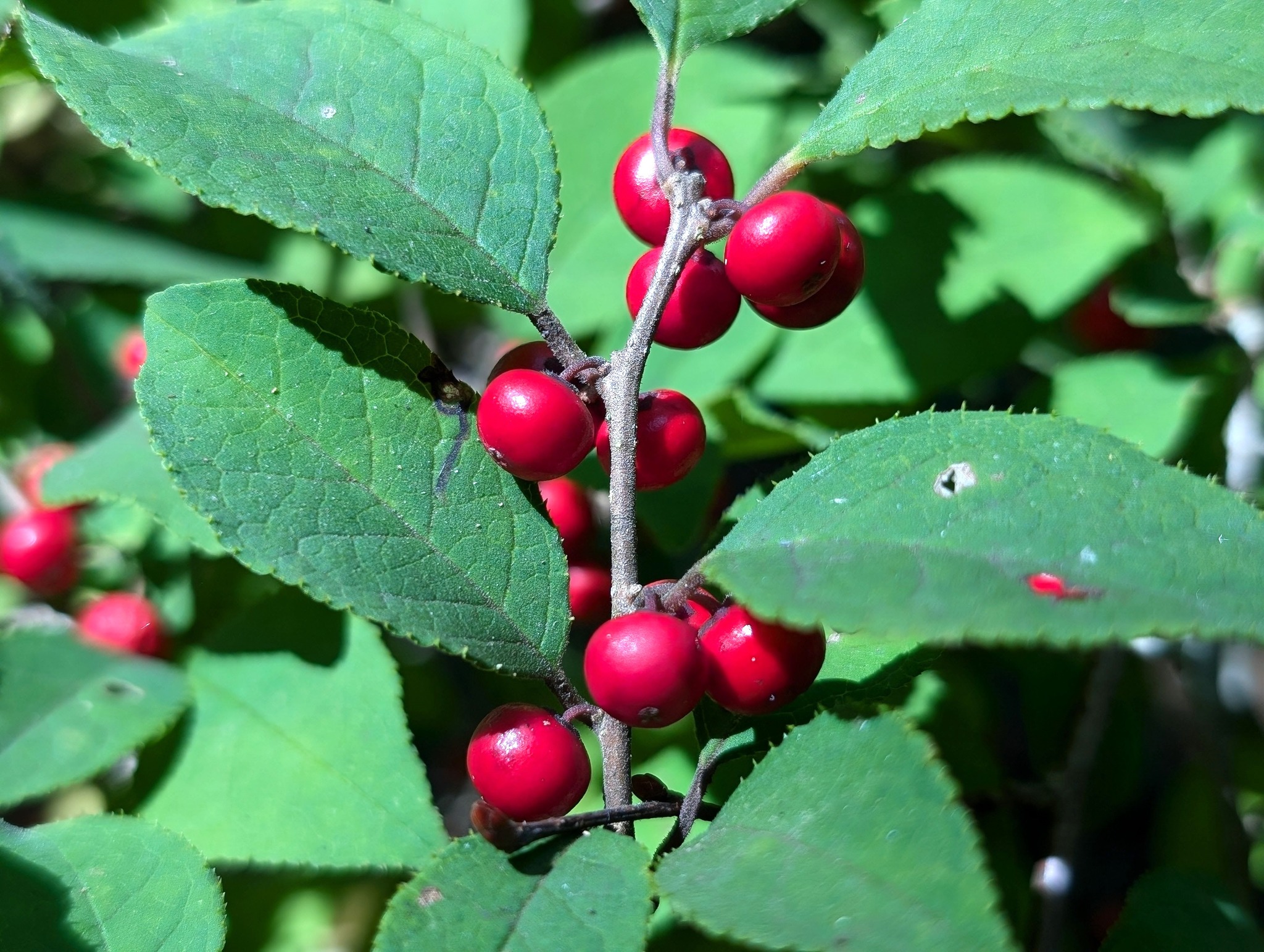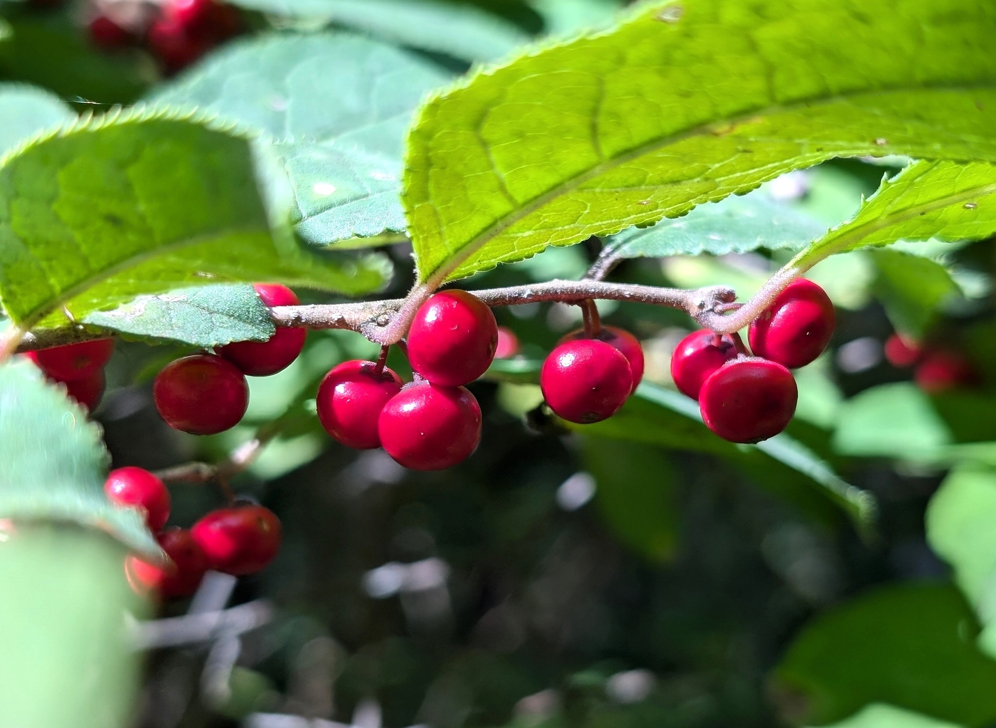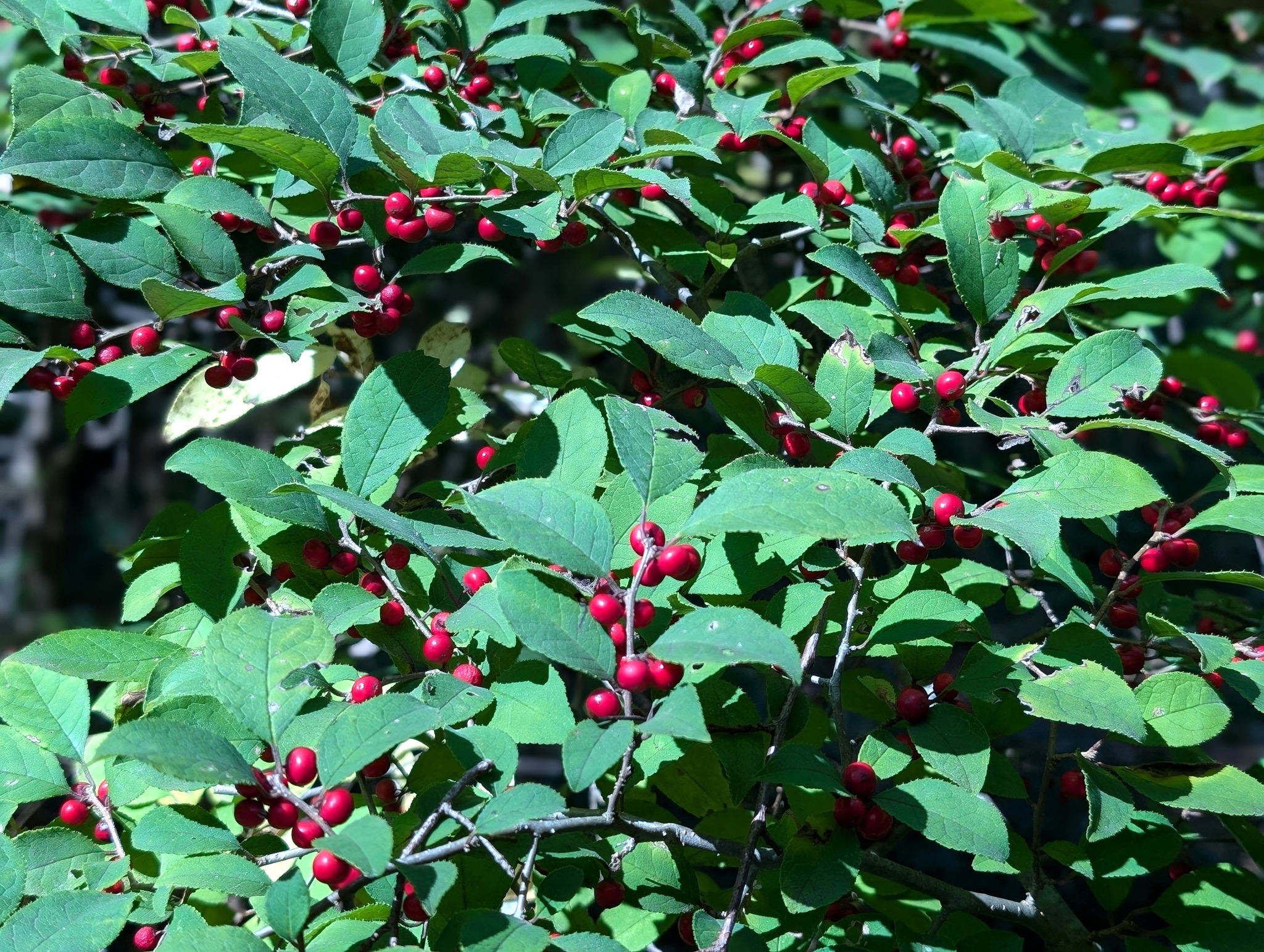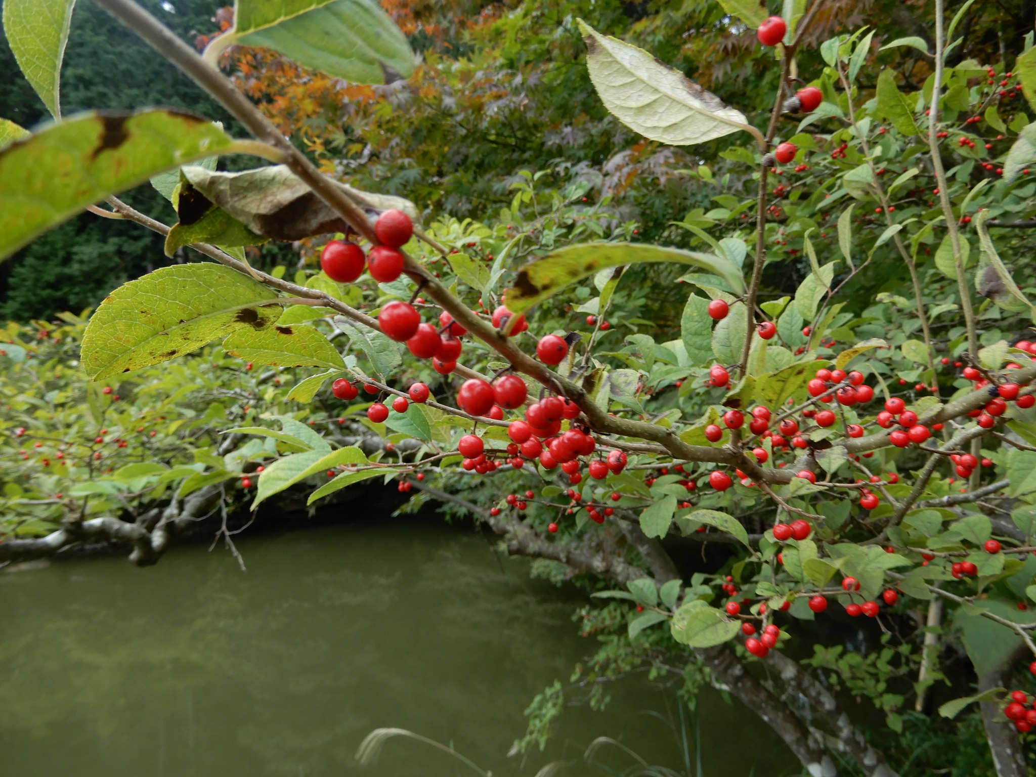 ウメモドキが赤い実をつけて注目を集めます。緑の葉が残る初秋から色づく果実は、一個ずつは小さいのですが、数が多いので綺麗だと人気です。