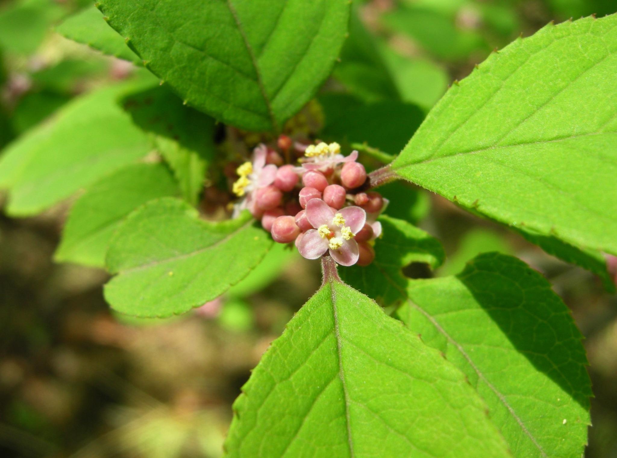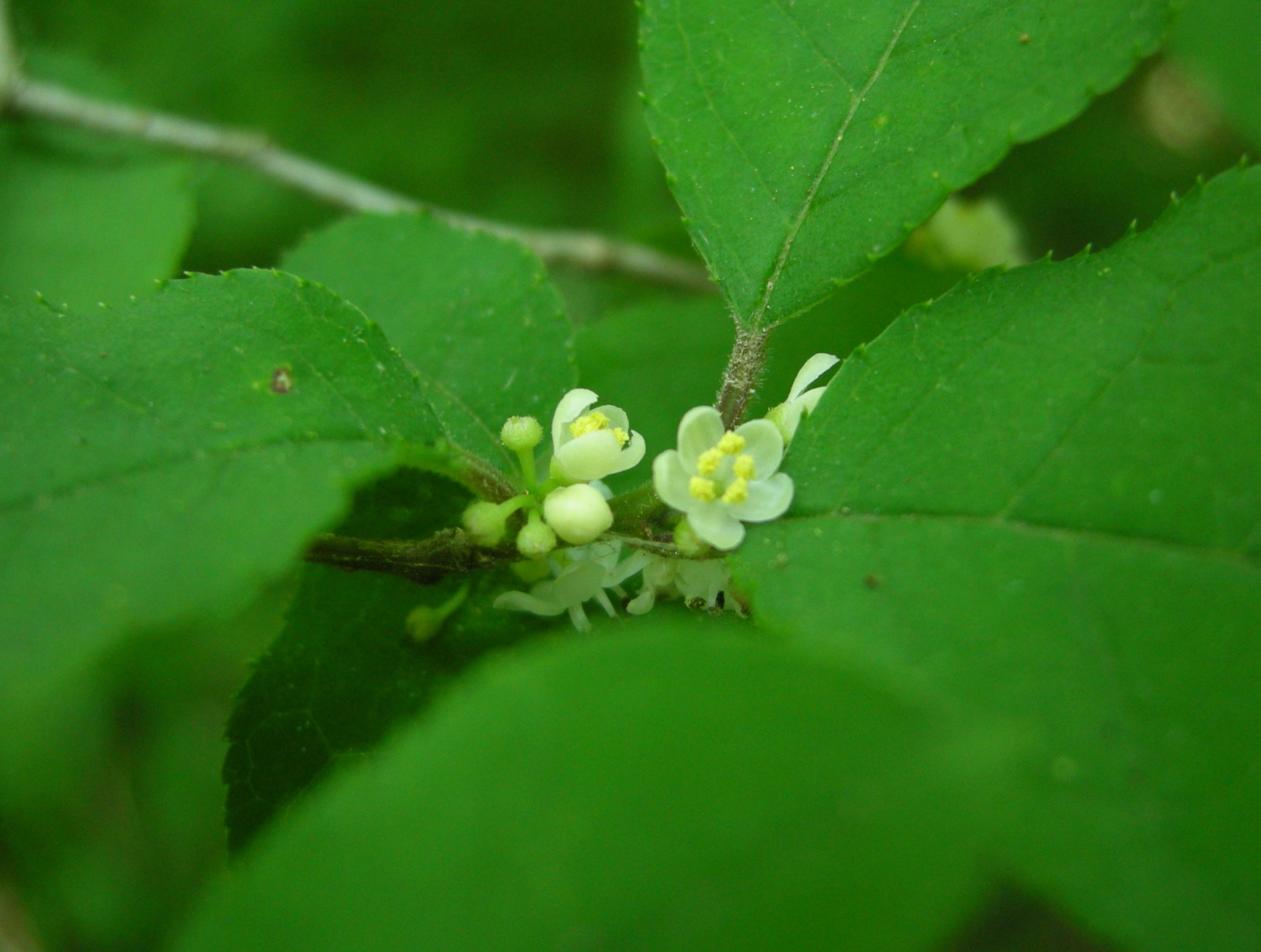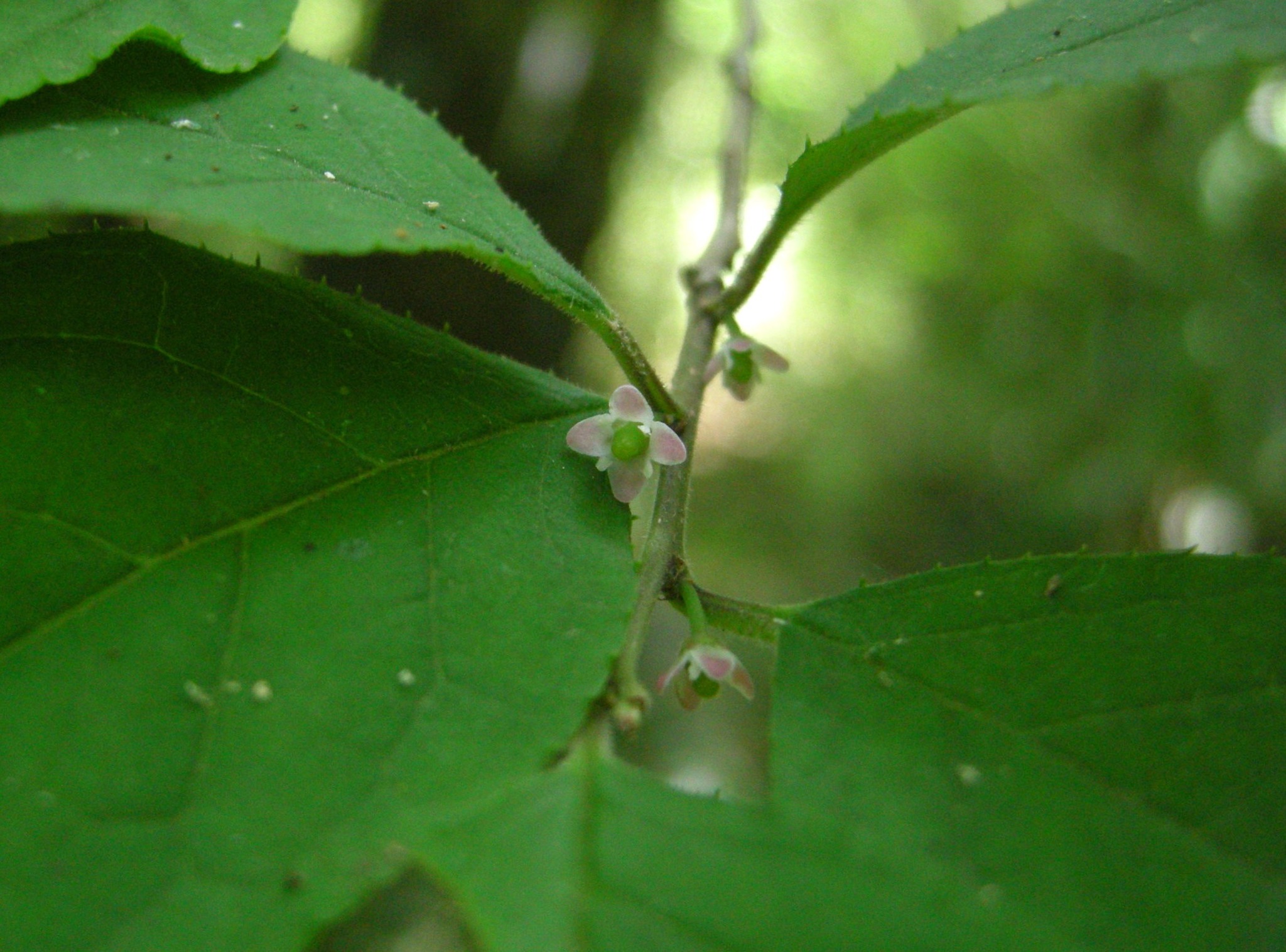 雌雄異株です。6月頃に咲く花は淡い紫色で小さいので、あまり注目されることはないようです。機会がありましたら、ちょっと覗いてみて下さい。雌花は中央に雌しべがあり、周りを退化した雄しべが囲みます。雄花は中央に退化した雌しべがあり、周りを雄しべが囲みます。稀に白花があります。果実も黄実、白実のものも見られます。