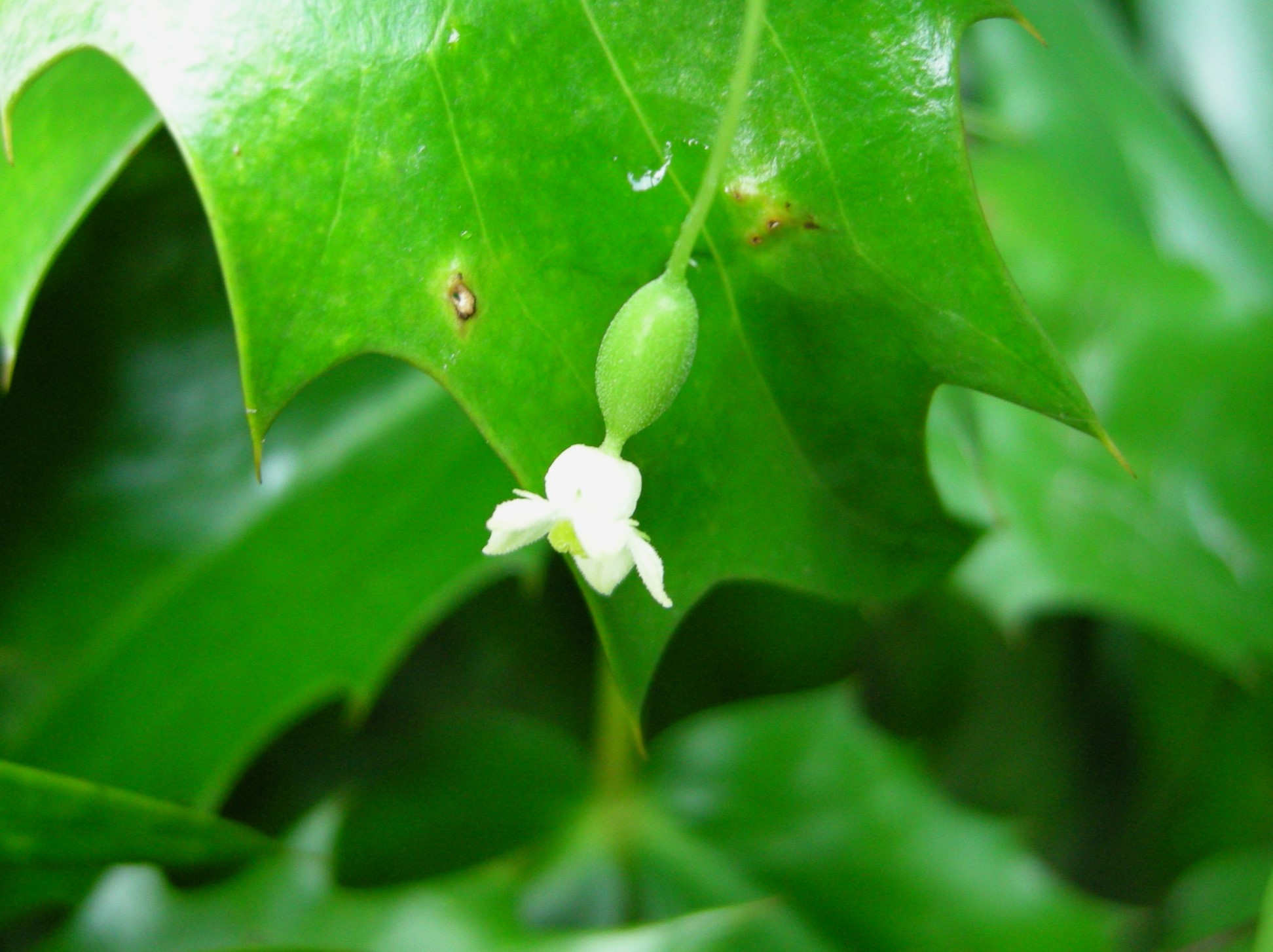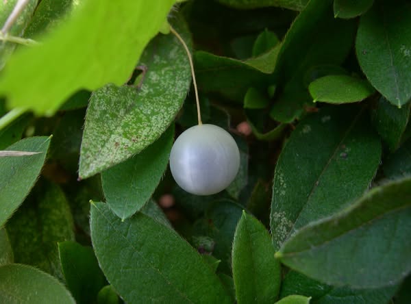 雌雄同株ですが、雄花と雌花が別々に咲きます。花後、球形の果実は緑色から白色に熟します。「真珠のネックレスみたい!」と歓声があがることも度々で、人気です。