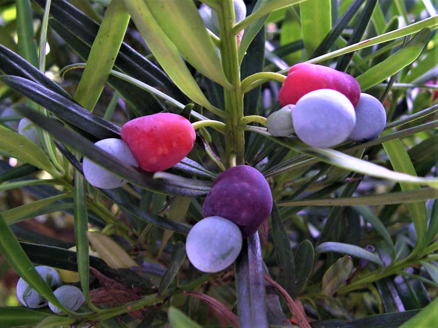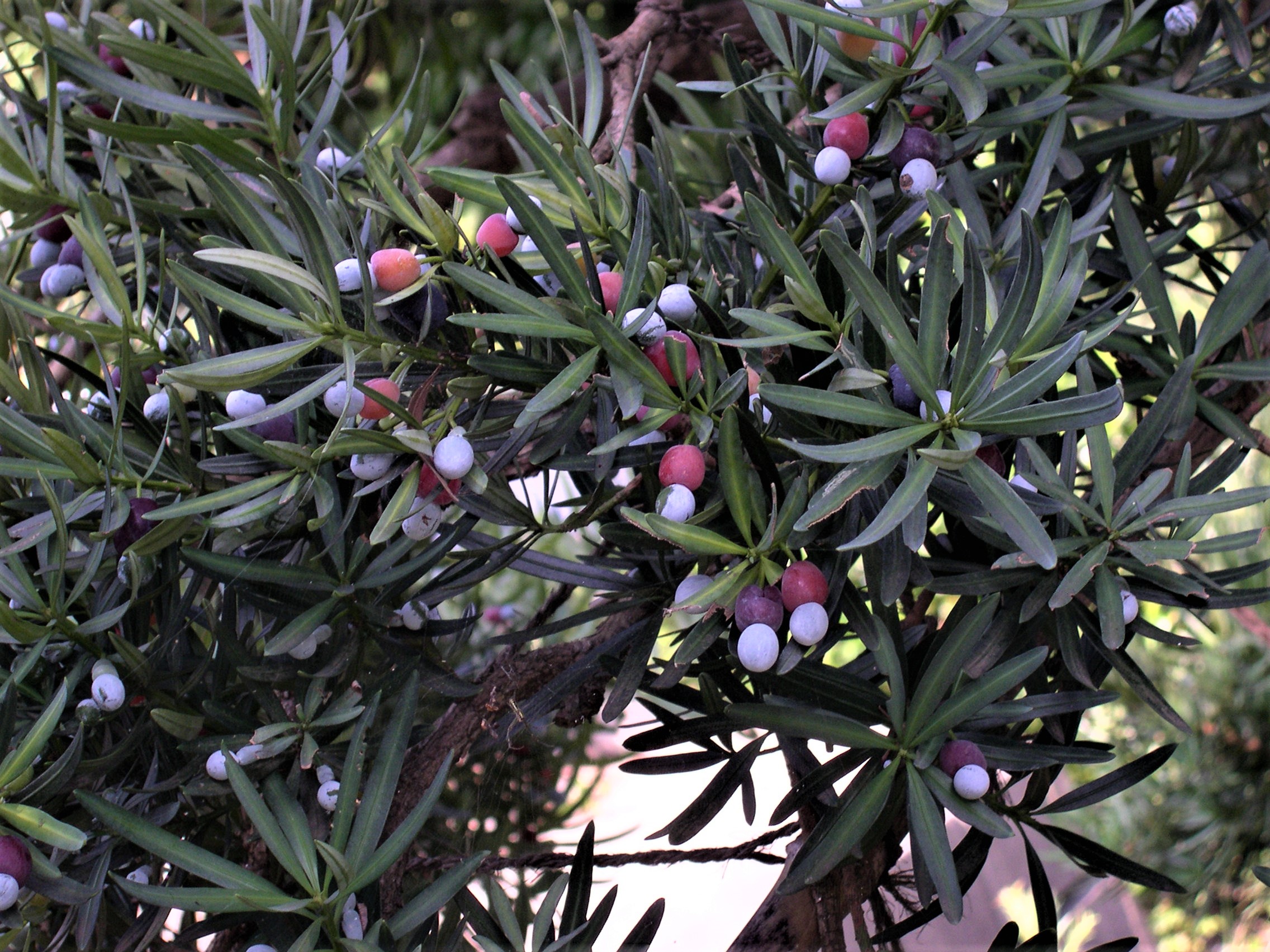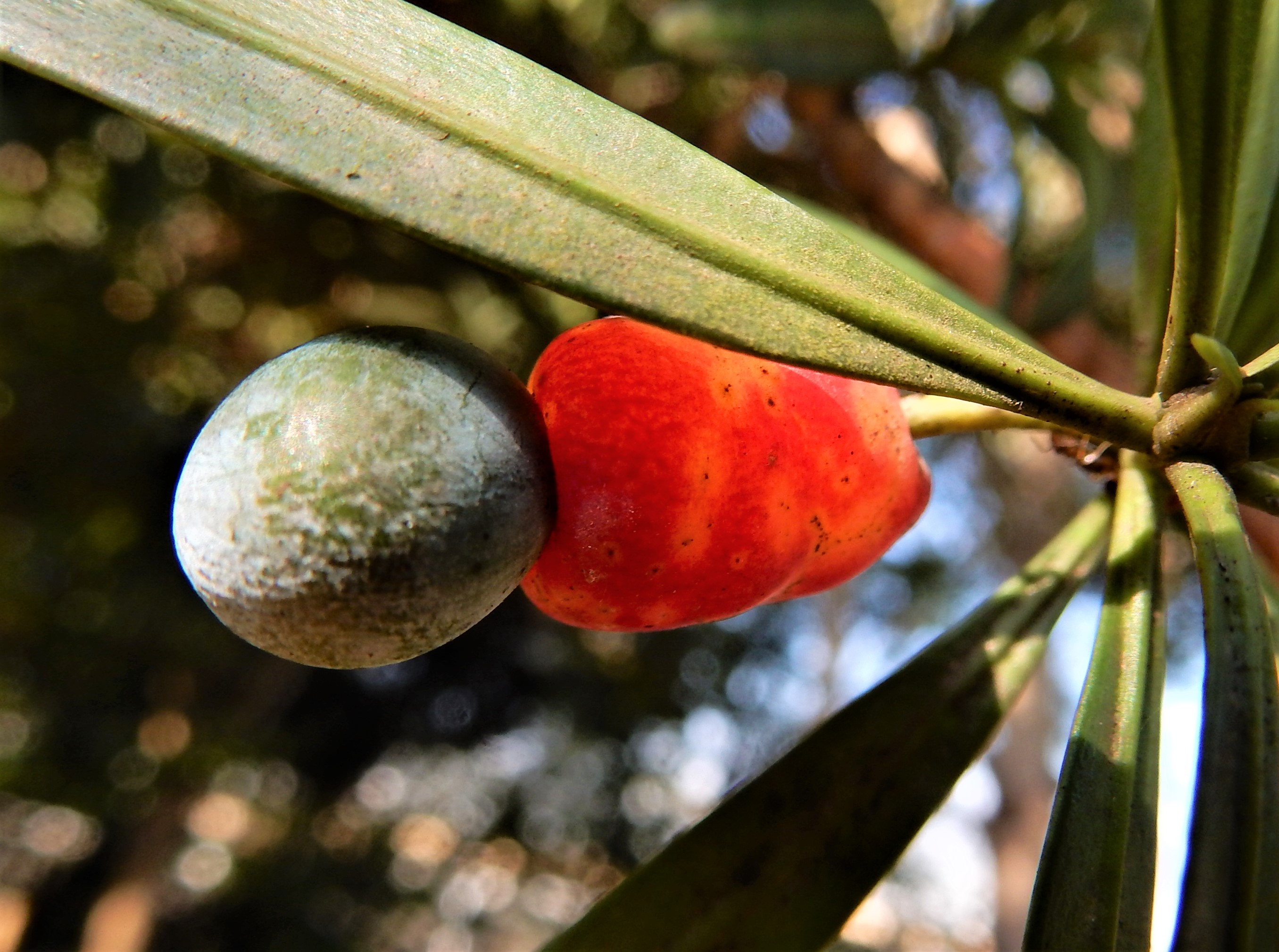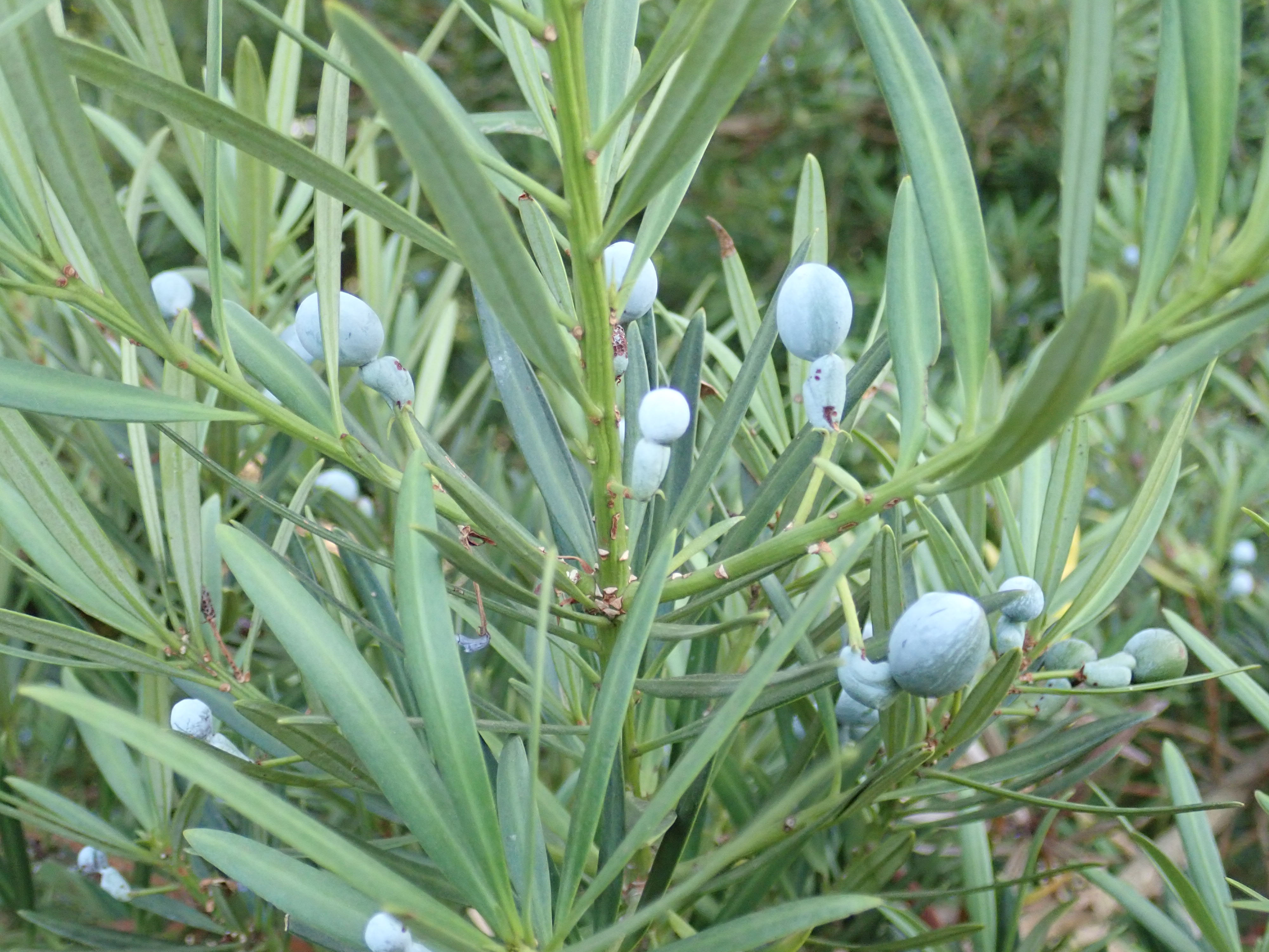 裸子植物ですので、種子が剝き出しになっており、その下の花床(かしょう)と言われる部分が赤く熟します。赤い色を認識できる鳥がこの部分を食べるためには、その先についている種子を一緒に食べる必要があります。鳥による種子散布の仕組みと解説されます。赤く熟した花床はちょっと甘くて食べられるのですが、種子は有毒ですから要注意です。