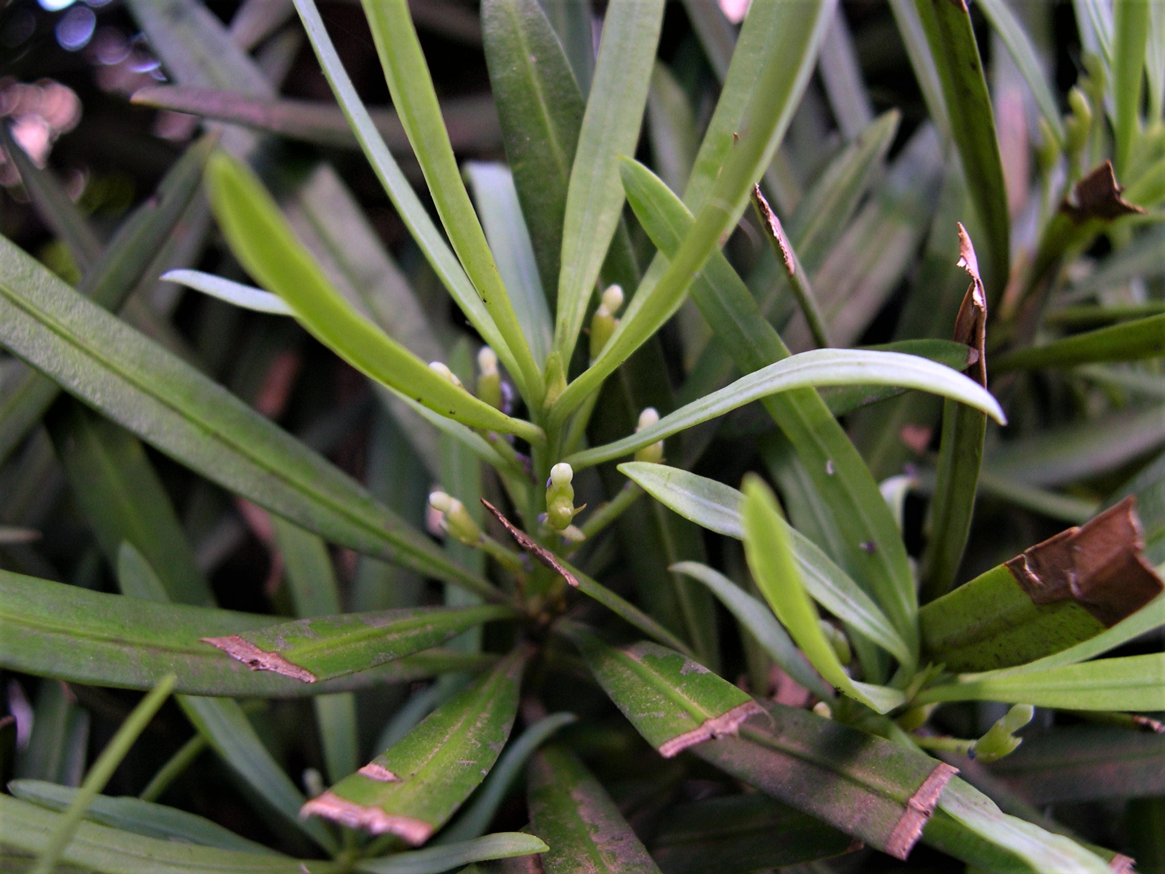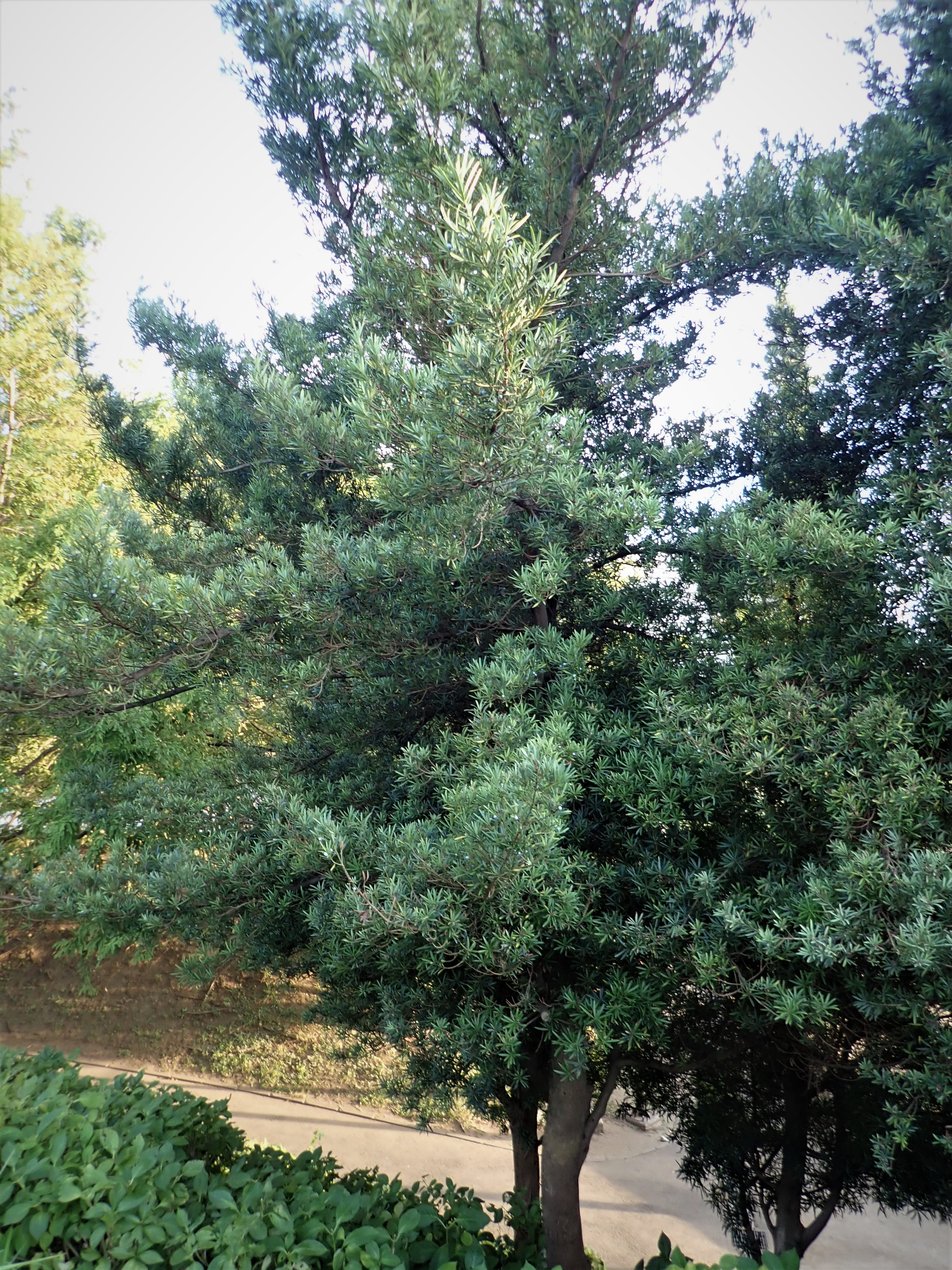 葉の幅は広いのですが、針葉樹(裸子植物)で、雌雄異株です。白い雄花は目立ちます。
