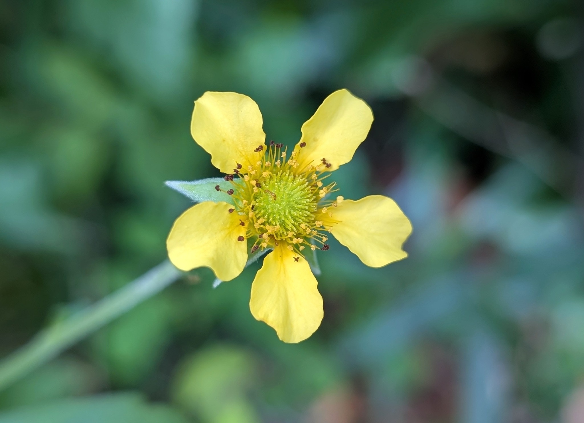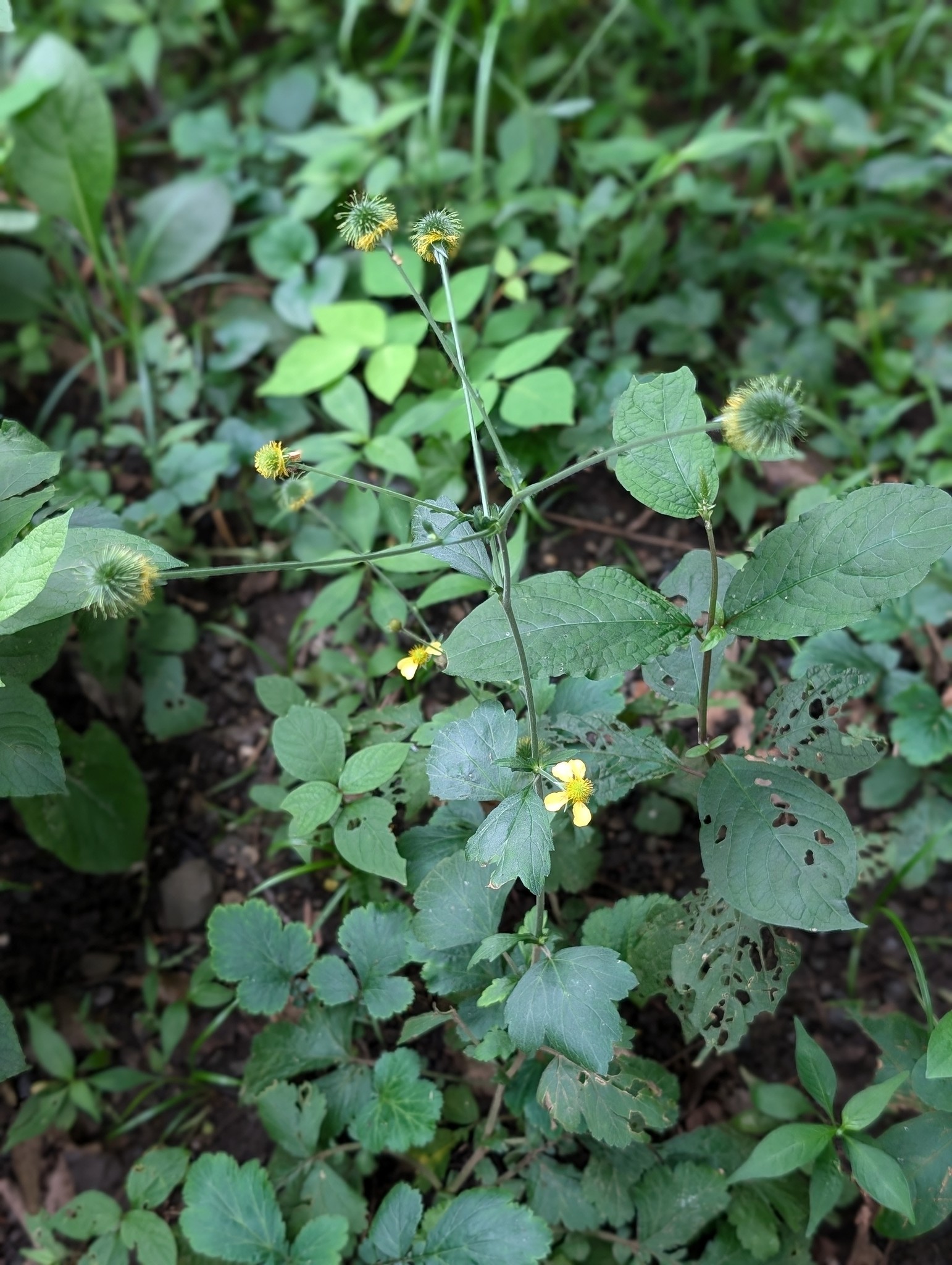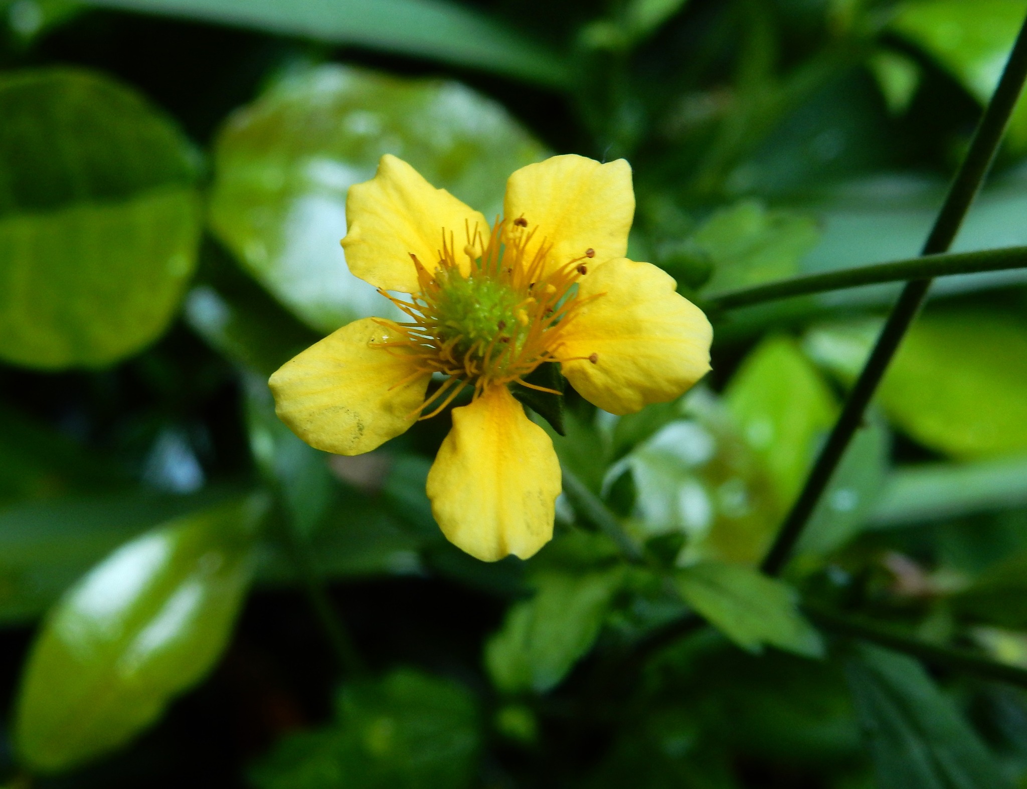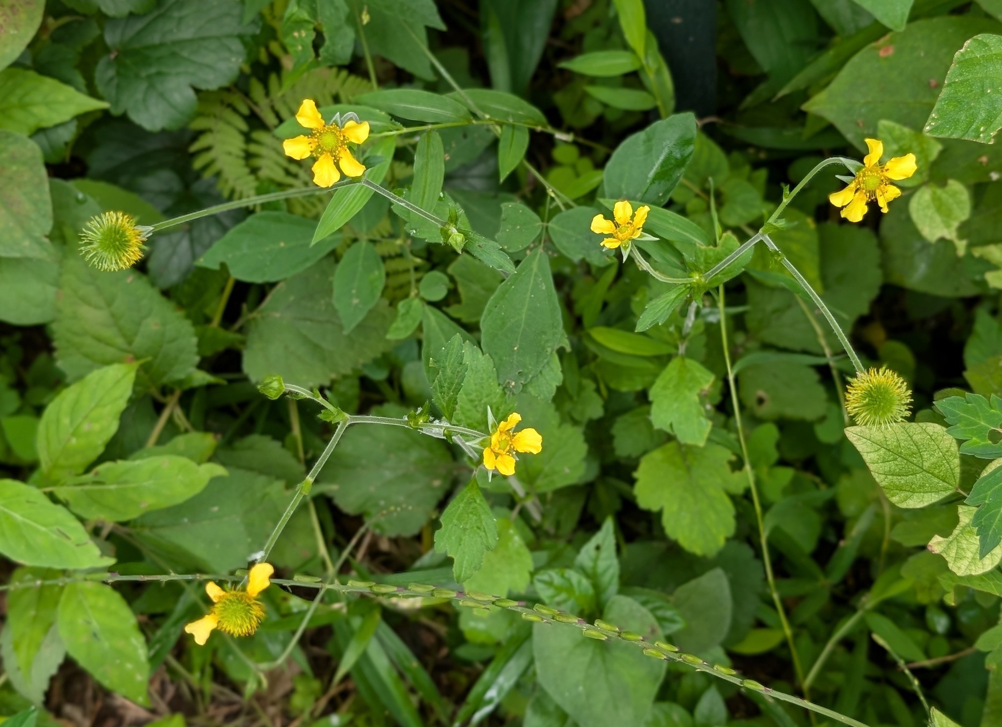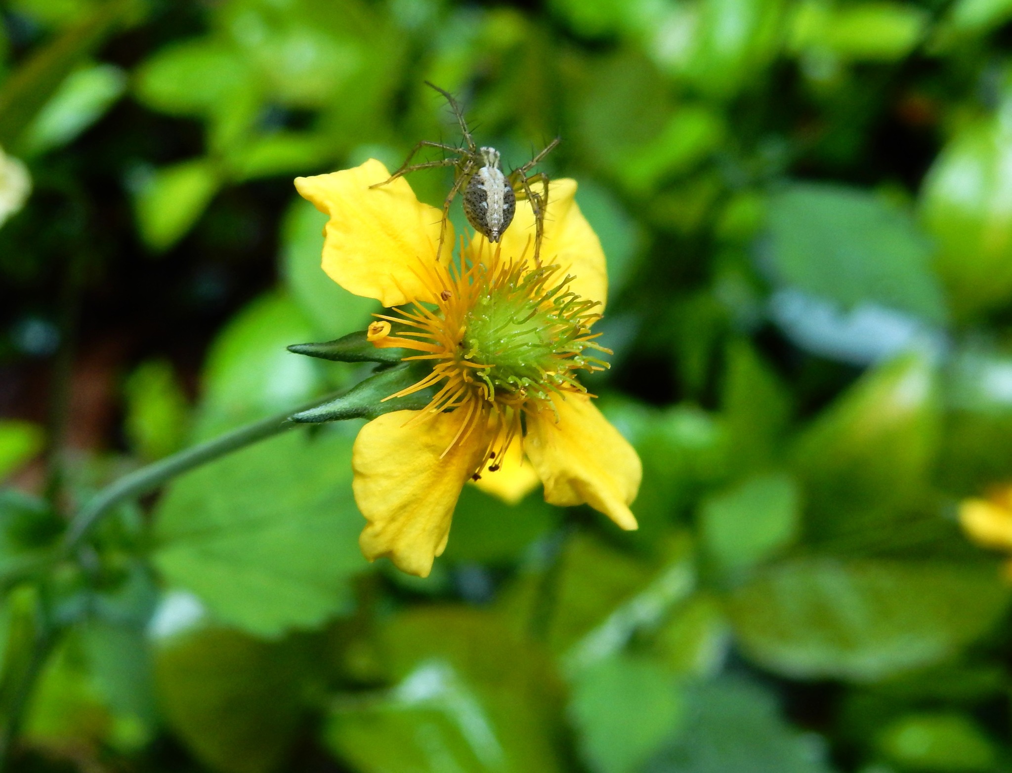 夏ころから秋まで咲く黄色い花は、中央に雄しべ、雌しべが沢山集まっています。クモの仲間や小さい昆虫が訪花しているのを見かけます。