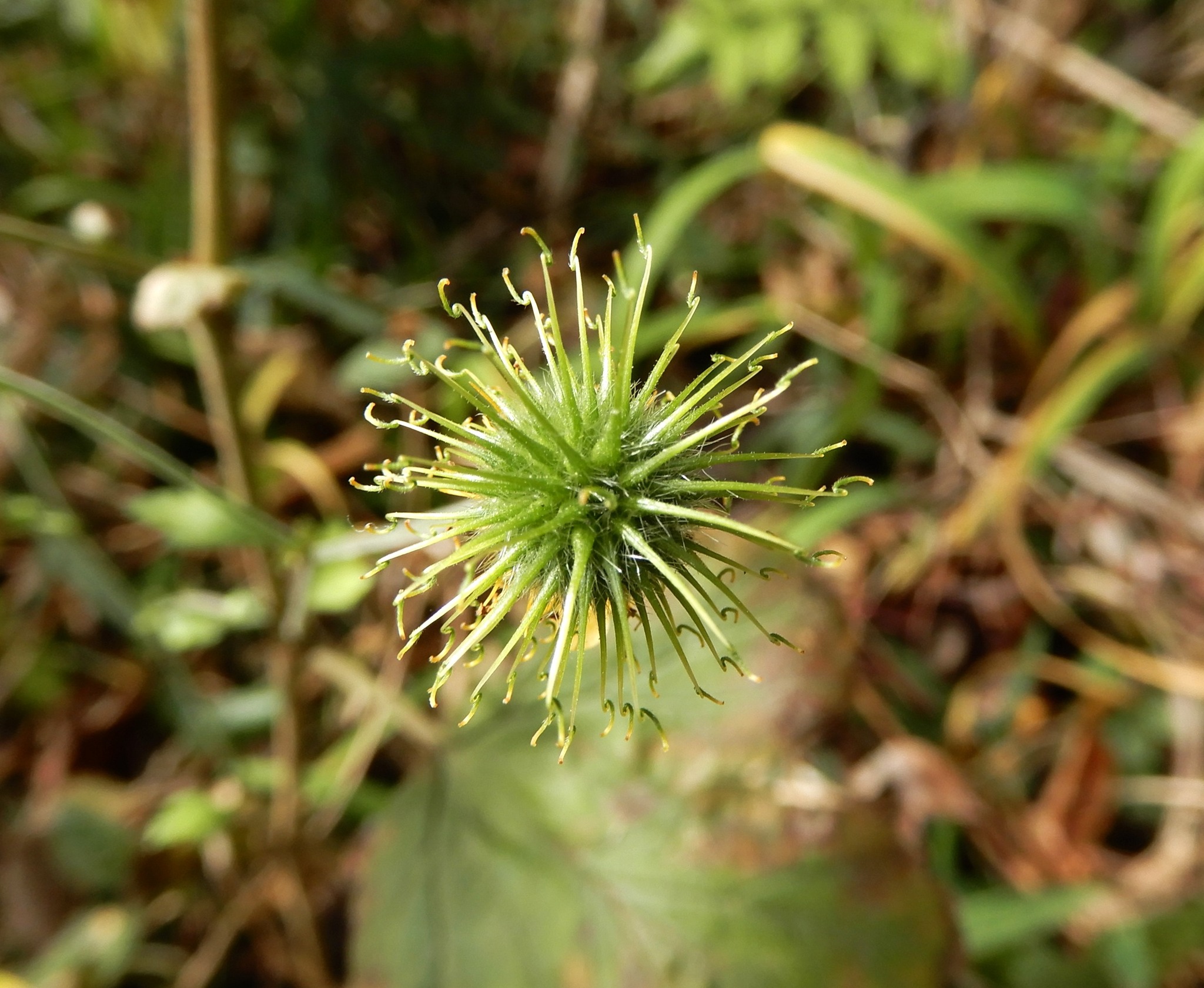 受粉後、雌しべは先端はがかぎ状に曲がって尖ります。この尖った部分が動物や衣類に刺さり、運ばれて行きます。ひっつきむしと呼ばれる種子散布の手法の一つです。