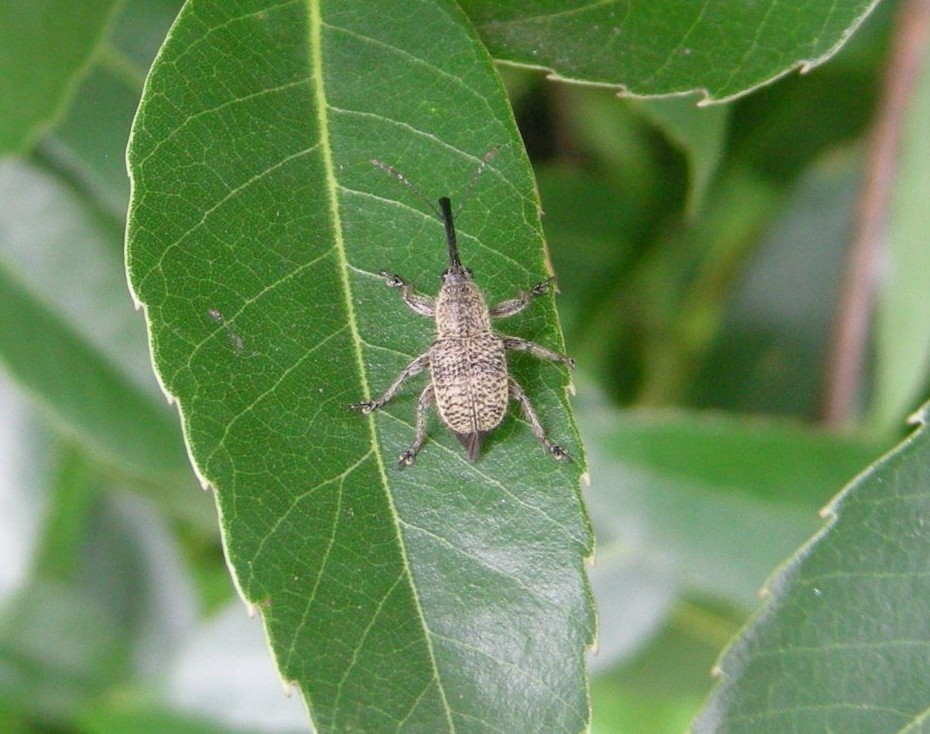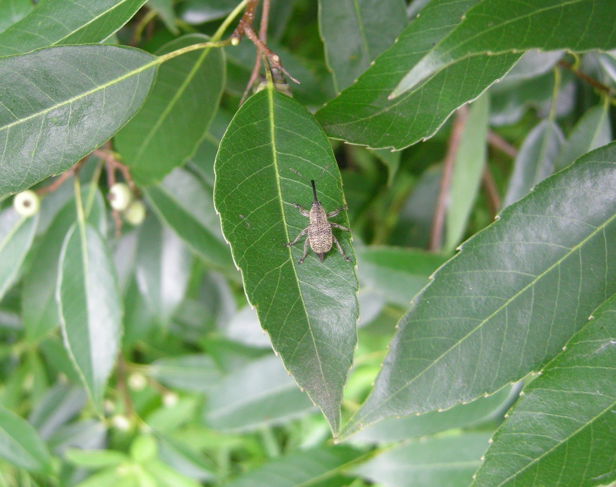 ハイイロチョッキリと言う名の1㎝にも満たない甲虫が卵を産み付けて、葉を数枚つけた枝を切り落とします。ドングリの殻斗に穴を開けた痕跡があります。(この作業はメスのみが行います。)ドングリの中で孵化した幼虫は、ドングリの中身を食べて成長します。成長した幼虫は、秋になるとドングリから脱出し、土中で越冬し、翌年の初夏、蛹化した後、羽化します。