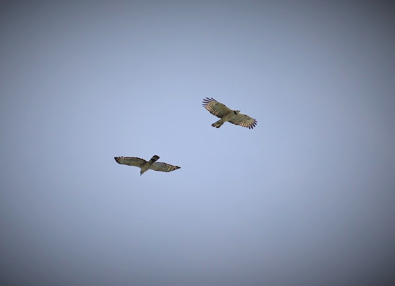 ハチクマはサシバと並んで大群が渡る姿が観察できることで有名です。長野県白樺峠、愛知県伊良湖岬、長崎県福江島などでは秋の渡りの時期に数千羽の渡りが観察されます。青空を背景に上昇気流を利用して何十羽ものハチクマが輪を描いて昇っていき、やがてスーと横に流れて飛び去っていく様は、野鳥観察の醍醐味です。