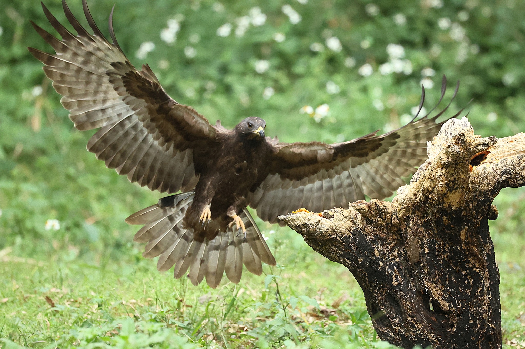 ちょっと珍しい名前ですが、蜂を好んで食べ、姿かたちがクマタカ(角鷹)に似ていることが由来です。普段は鳥類、爬虫類、両生類なども食べますが、子育ての時はミツバチやスズメバチなどの盤状の巣を地下から掘り出し、巣そのものと巣に入っている卵、幼虫、蜜をヒナに与えます。スズメバチの巣まで襲うのですからハチの攻撃に対する幾重もの防御機能を持っています。顔の皮膚は厚くて柔軟で針が刺さりにくく、全身の羽毛は密に重なって針を通しにくくなっています。また、ハチの毒に対する耐性を持っている、ハチの嫌う匂いを出してハチを遠ざけているという説も有ります。