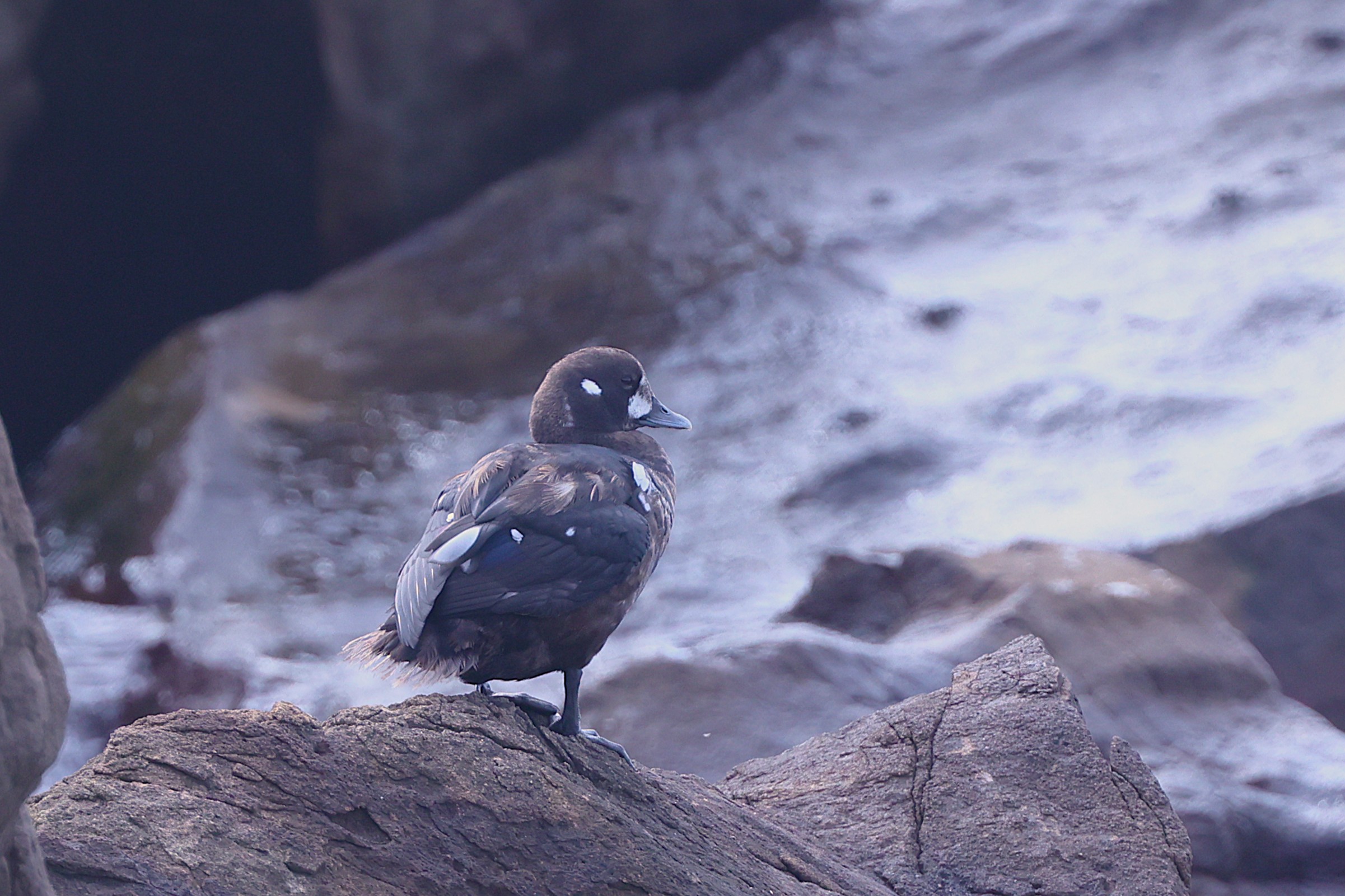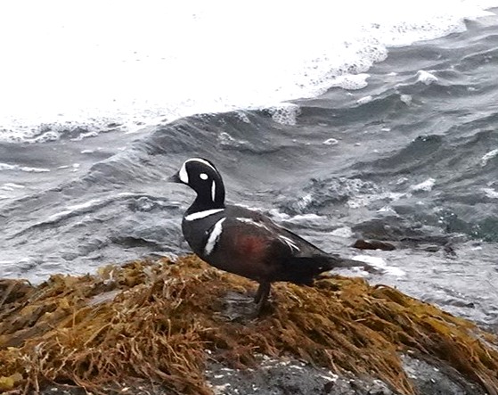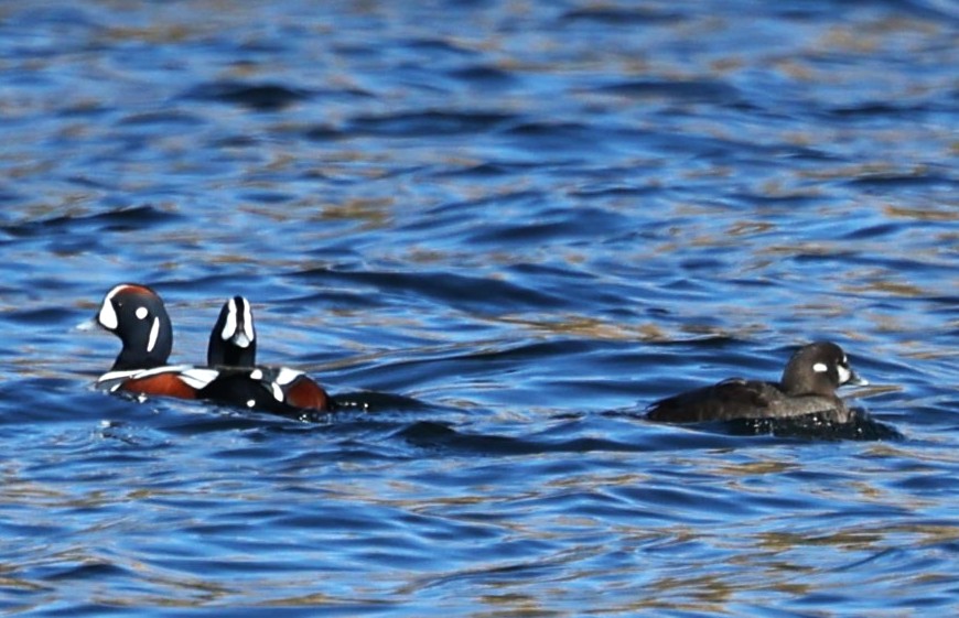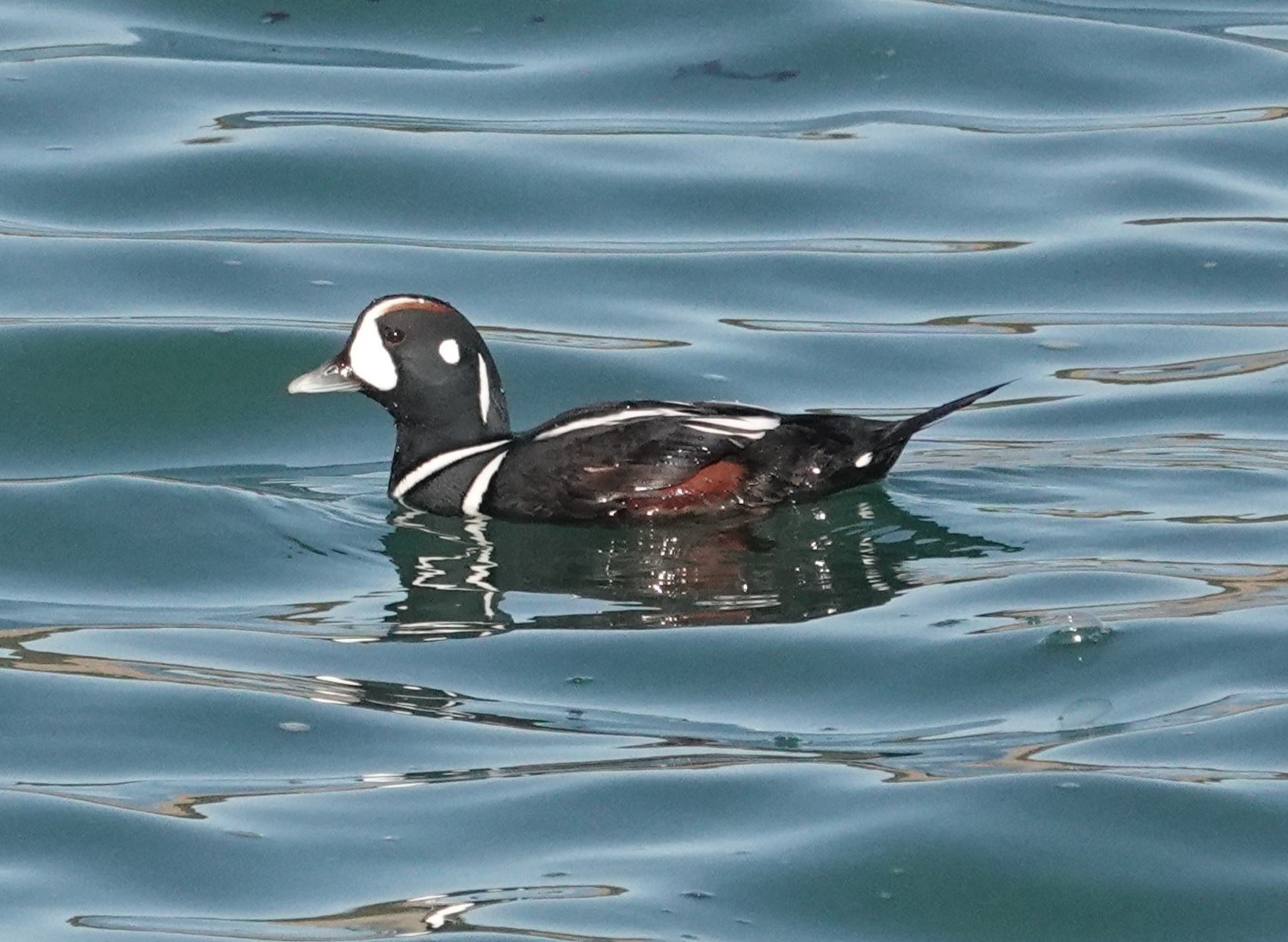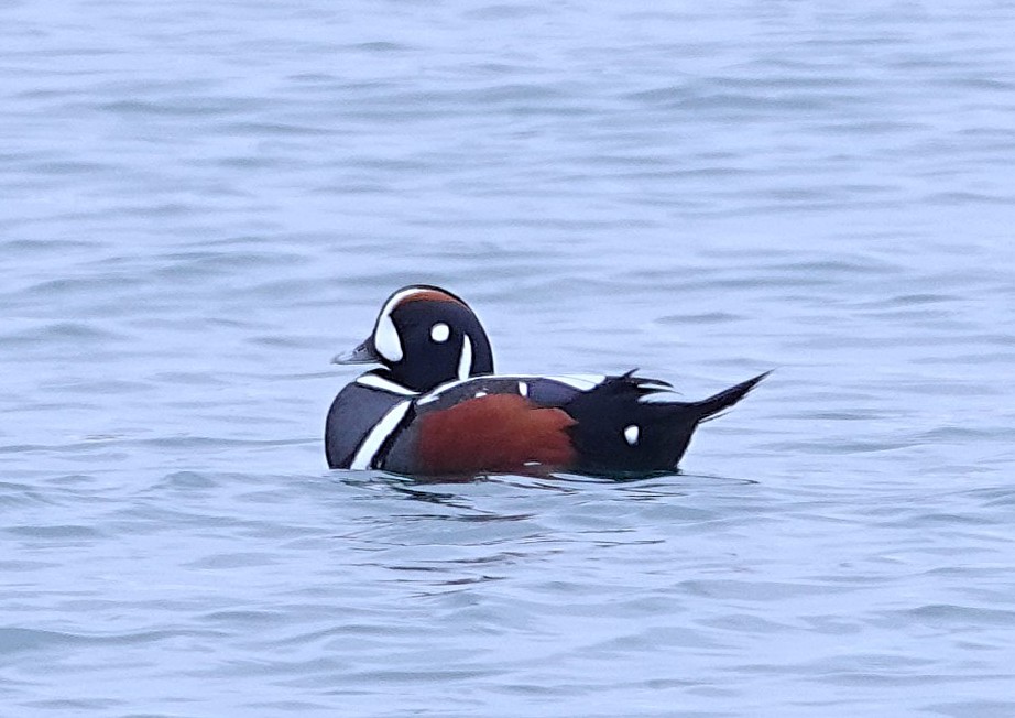 おどけたようなユーモラスな顔のカモです。英名はHarlequin duckで、Harlequinは道化師と言う意味とまだら模様という意味が有り、まさにその通りの顔つきです。