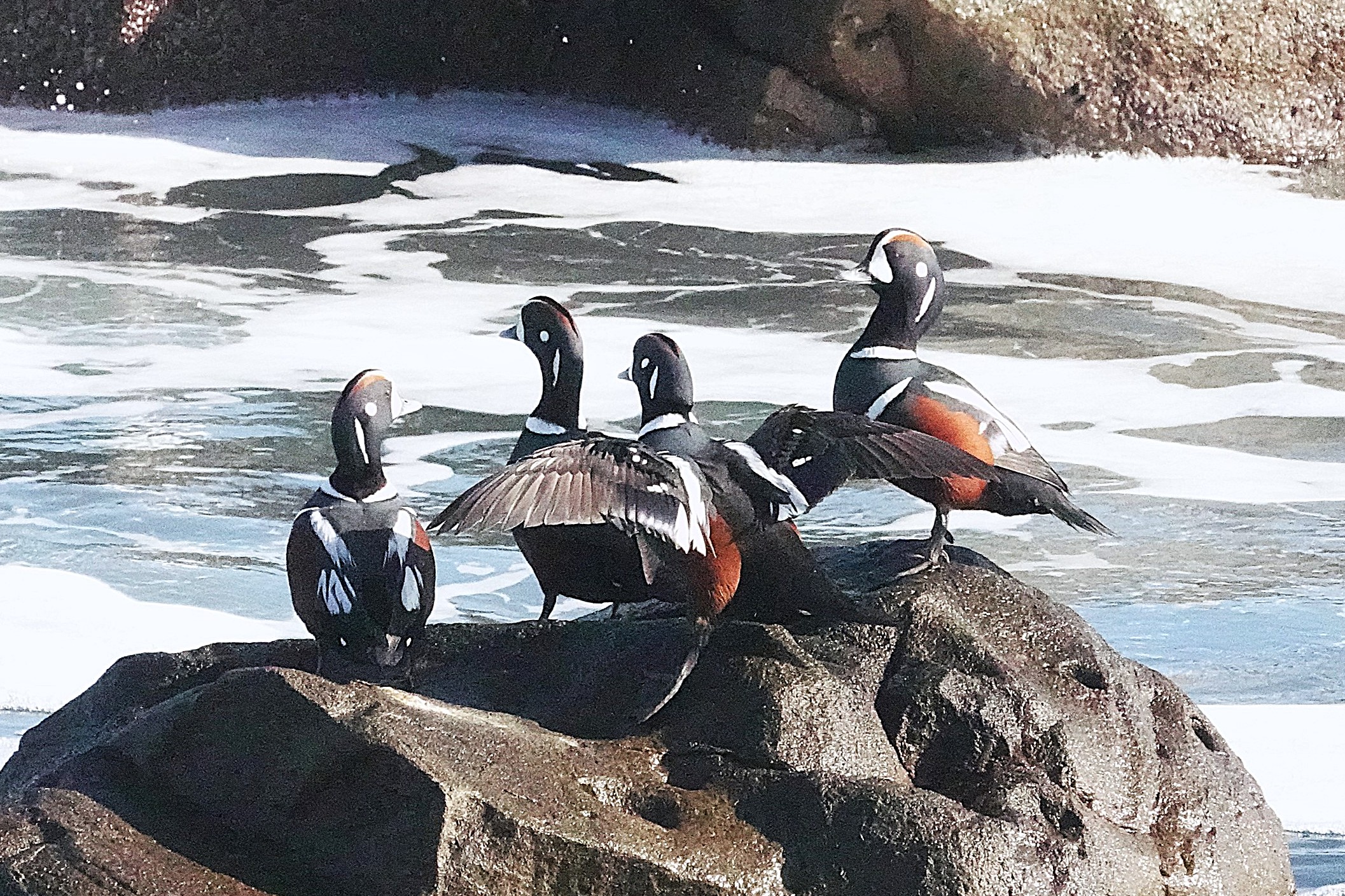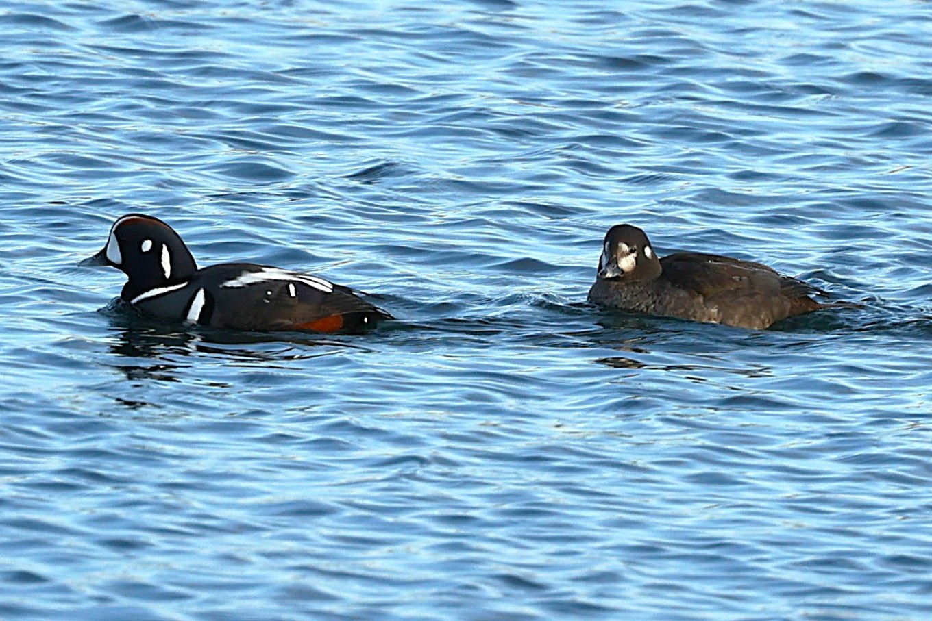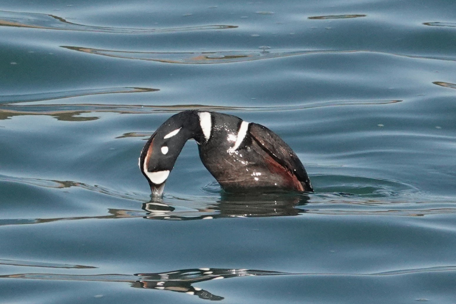 おどけたようなユーモラスな顔のカモです。英名はHarlequin duckで、Harlequinは道化師と言う意味とまだら模様という意味が有り、まさにその通りの顔つきです。