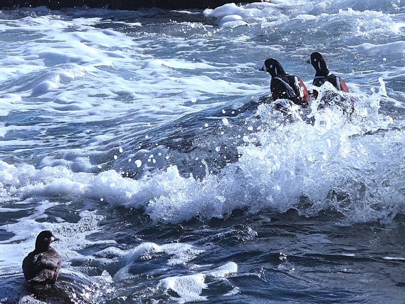 夏冬とも水の動きの激しい所に棲む泳ぎの上手いカモです。