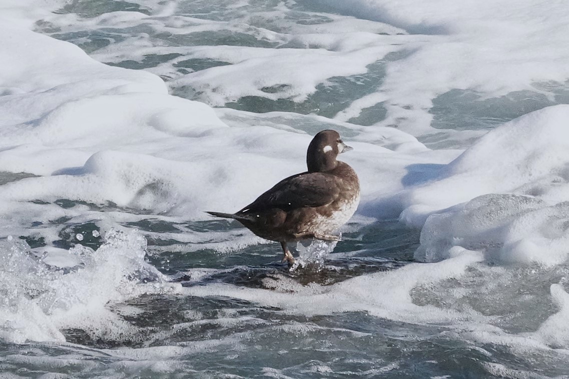 冬は岩礁の有る波の荒い海岸や、消波ブロック近くなどでよく見られます。巧みに波に乗って移動し、頻繁に潜っては貝類を食べます。