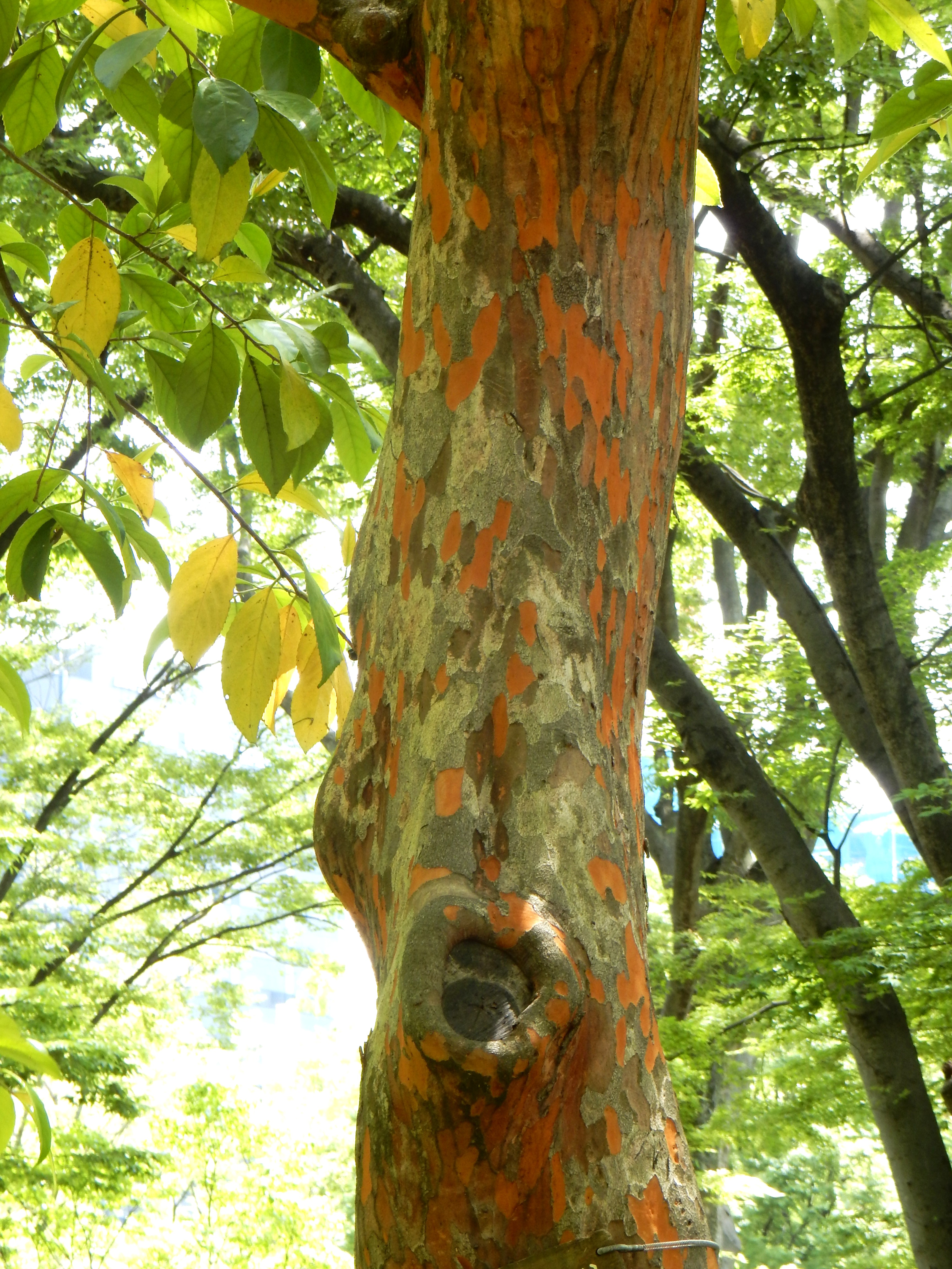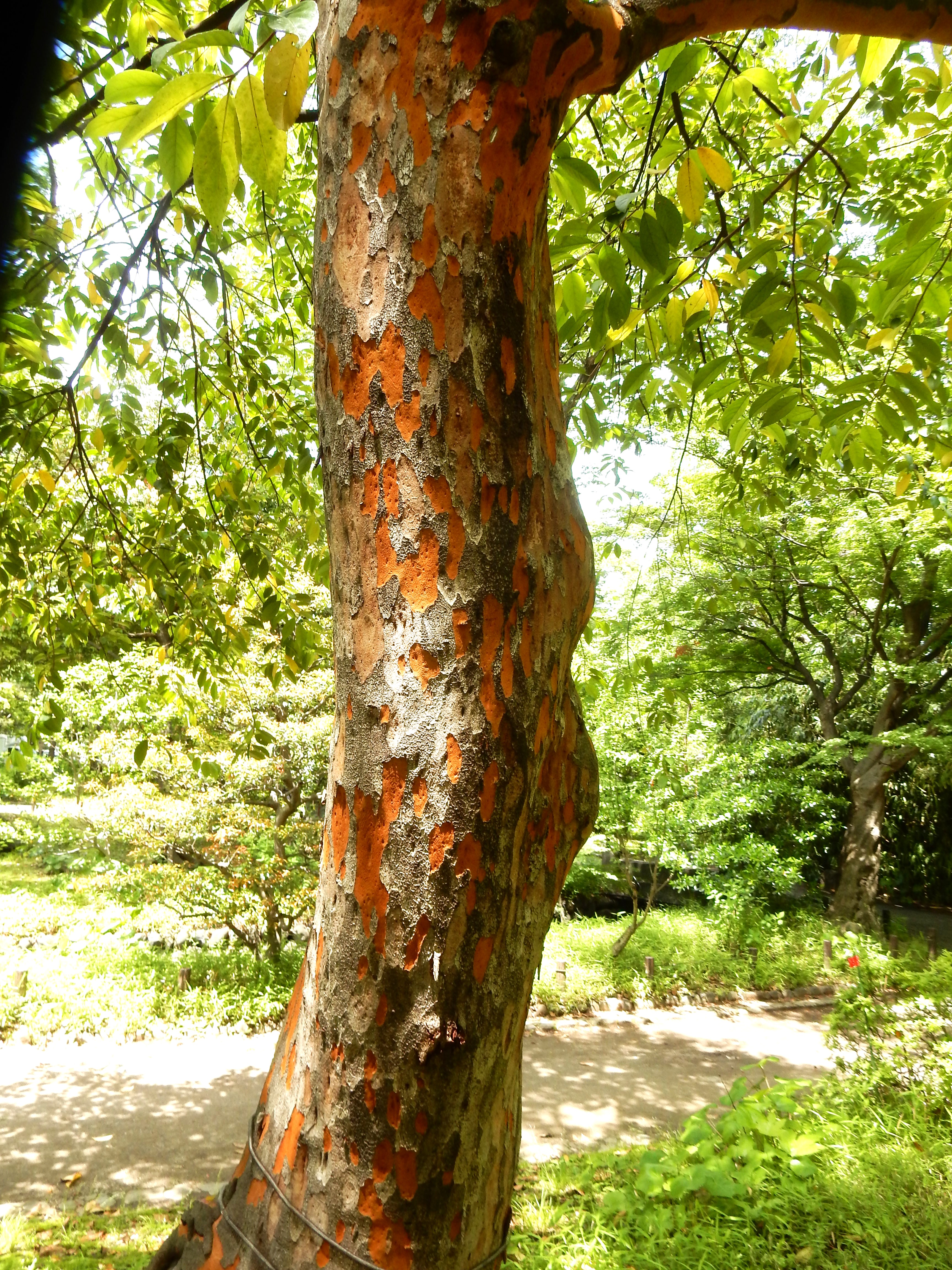 樹齢を重ねるとともに剥がれるようになる樹皮が特徴で、注目されます。秋から春に樹皮が剥がれ落ちると、その跡が紅黄色のまだら模様になります。