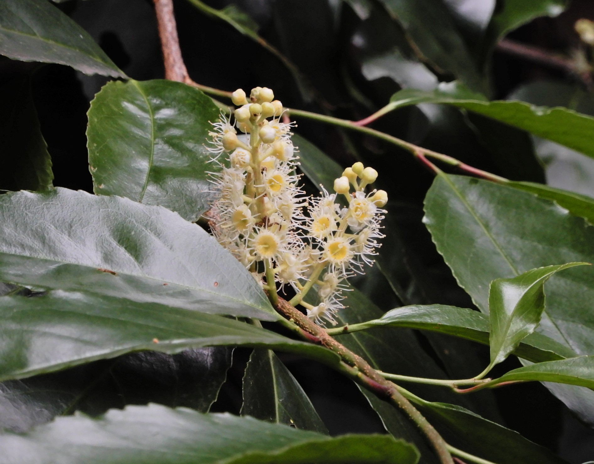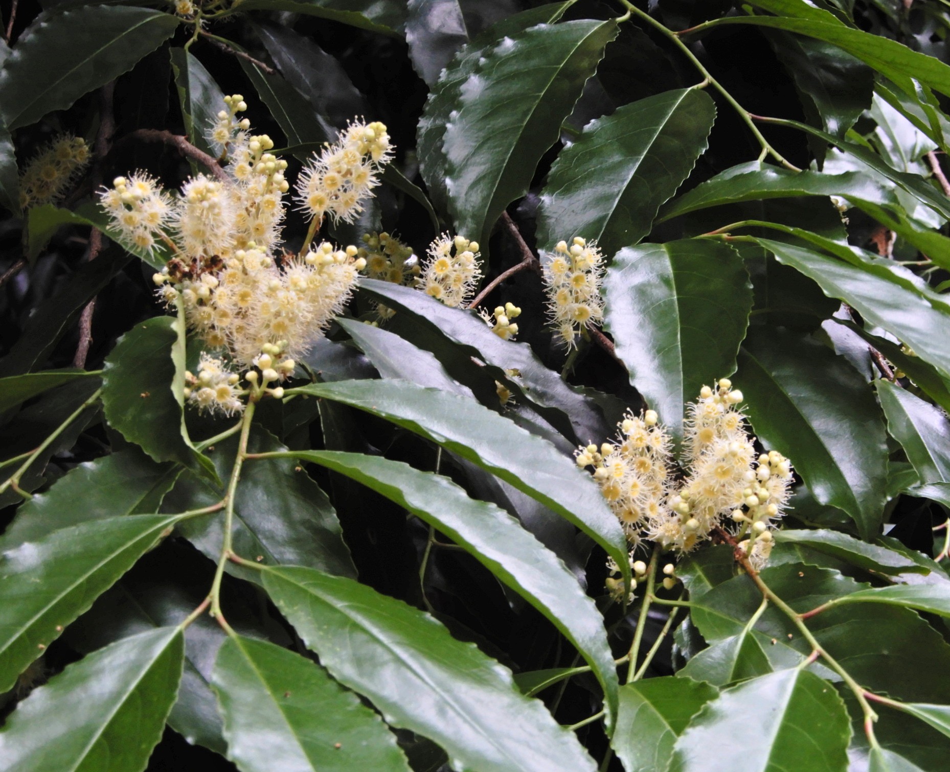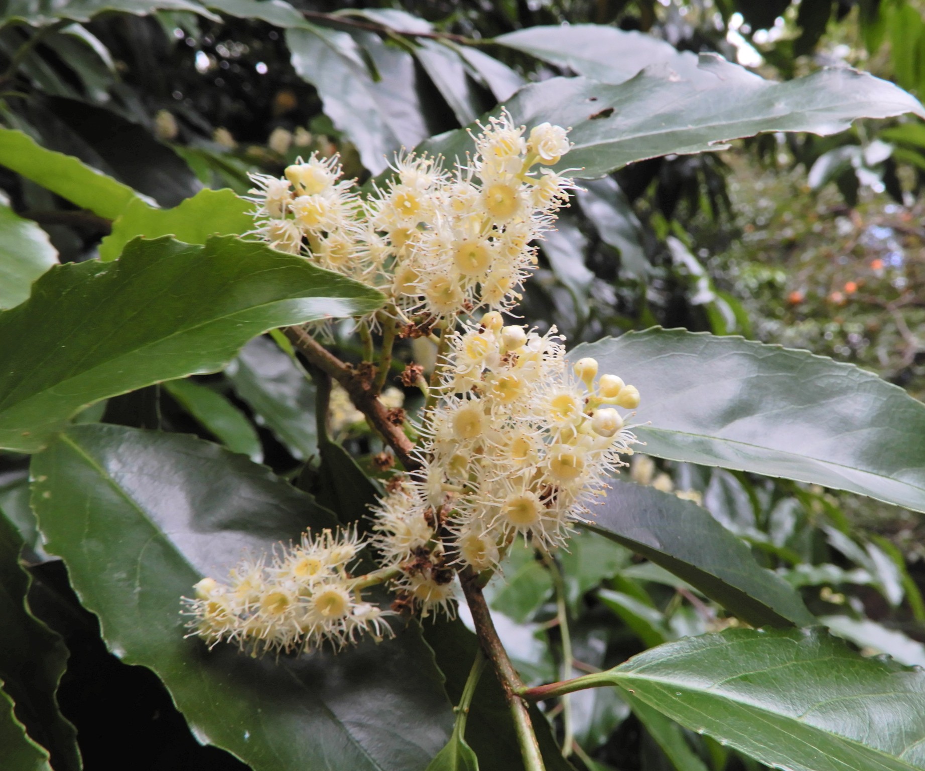 春に咲くウワミズザクラ、イヌザクラなどと同じ仲間ですが、これらが落葉樹で、春に開花するのに対して、バクチノキは常緑樹で、秋に開花します。