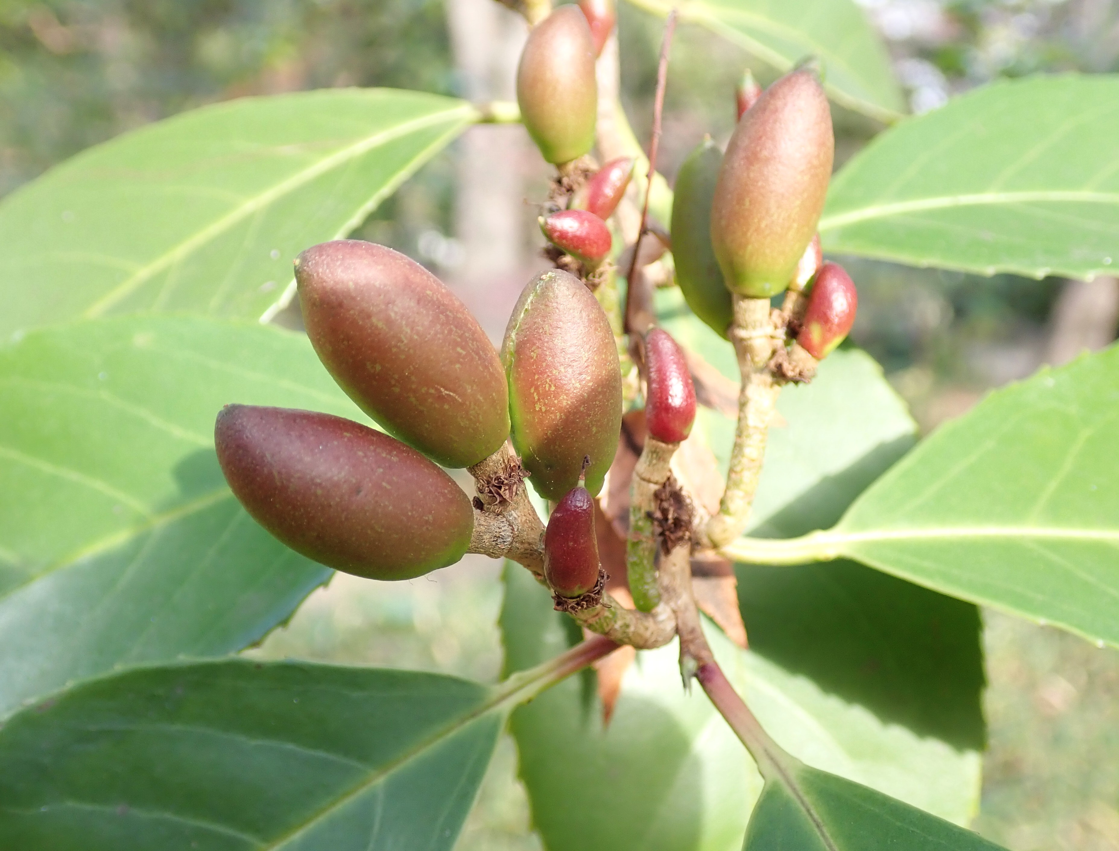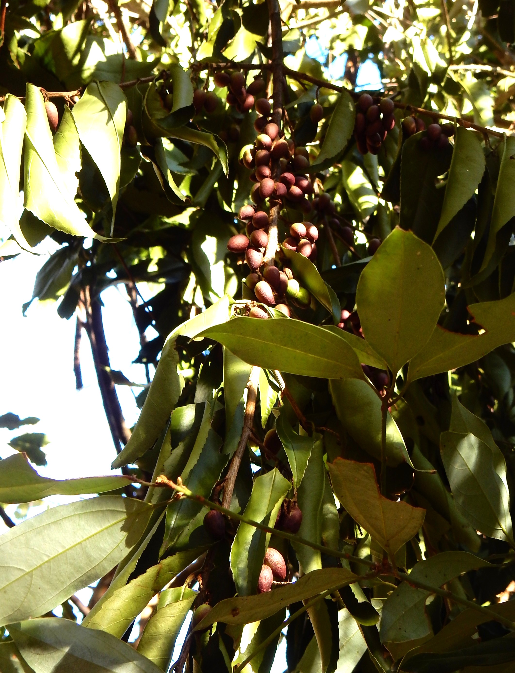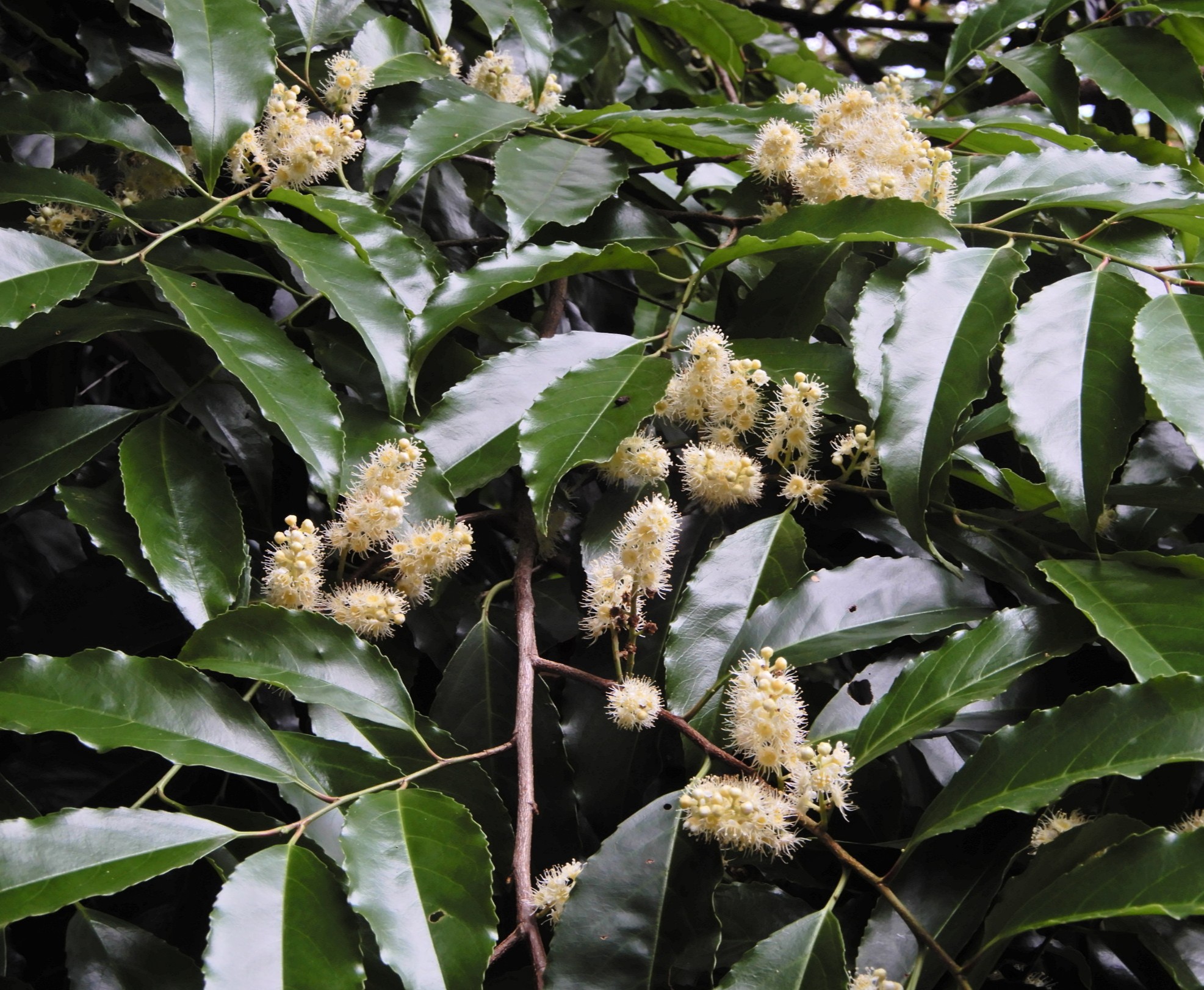春に咲くウワミズザクラ、イヌザクラなどと同じ仲間ですが、これらが落葉樹で、春に開花するのに対して、バクチノキは常緑樹で、秋に開花します。