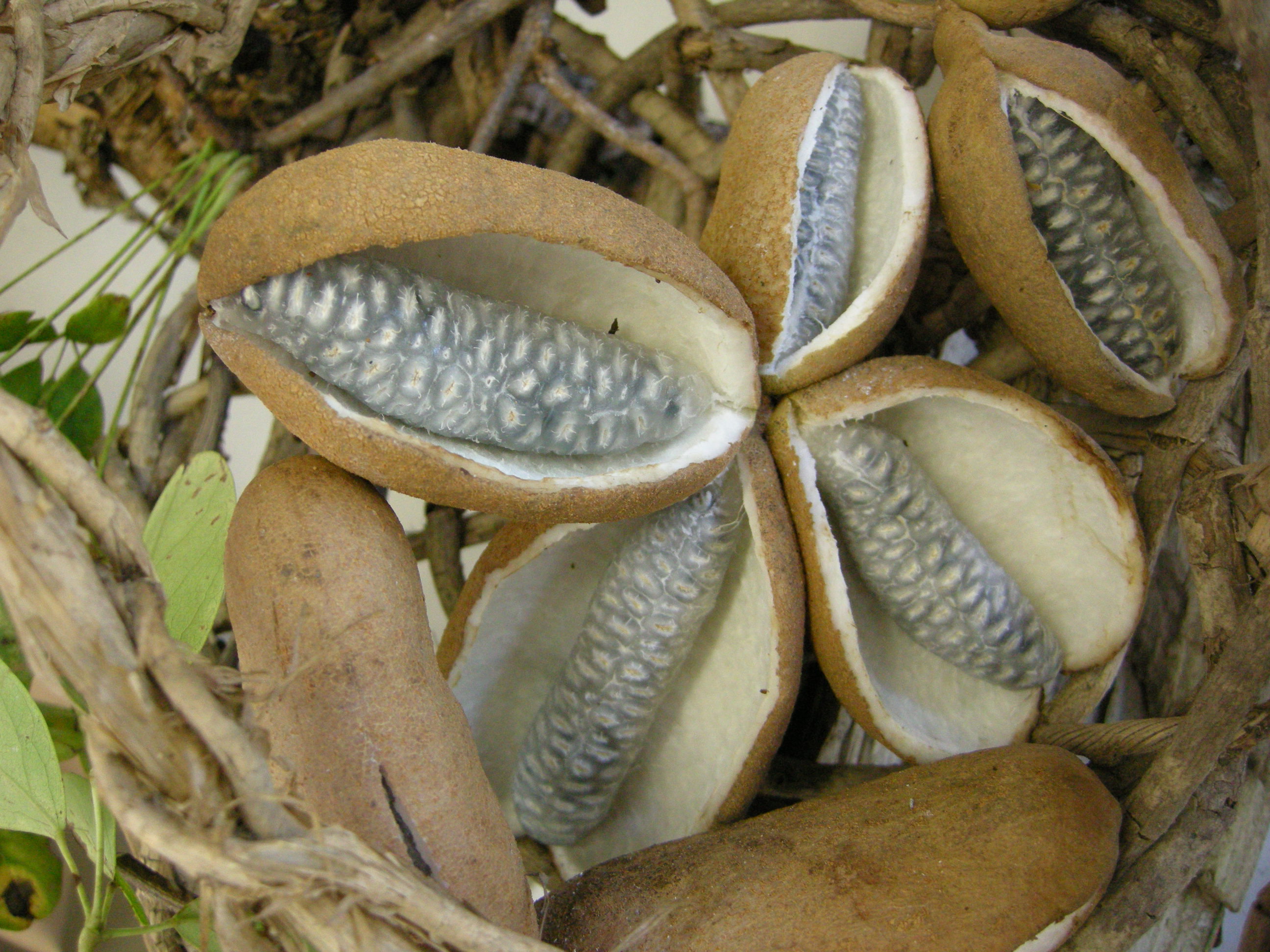 アケビの実が熟す季節になりました。熟した果実は縦に割れます。中には白くて甘い果肉に包まれた種子があります。この様子からアケビという名は「開け実(あけみ)」を意味すると言われています。白いゼリー状の果肉を種ごと口に含んで、種を吹き出すようにして食べた経験のあるかたもいらっしゃるでしょうか。