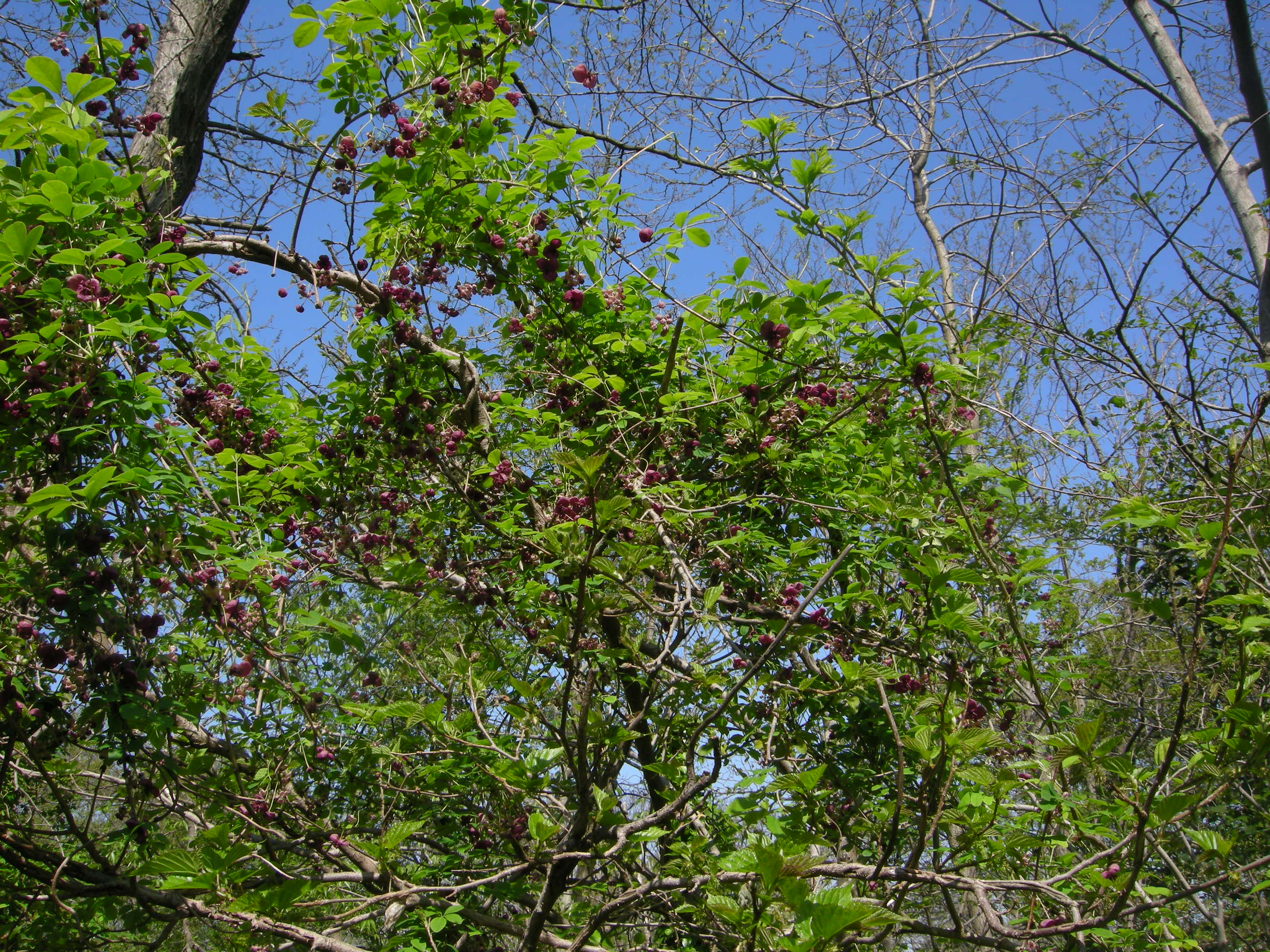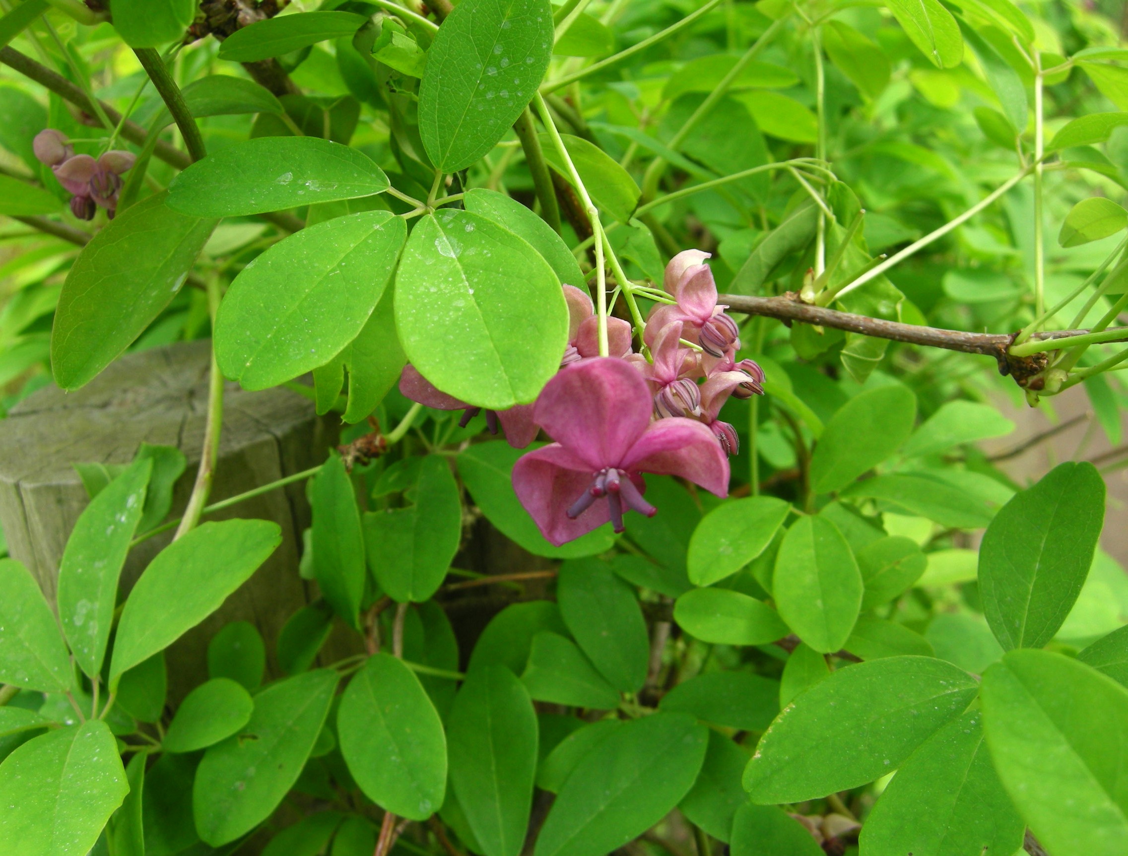 一般に「アケビ」と呼ばれている植物は、アケビ、ミツバアケビ、ゴヨウアケビの三種類が混ざっています。アケビの仲間は3枚か5枚の小葉が集まって1枚の葉を構成しています。鋸歯のない小葉5枚がアケビ、鋸歯のある小葉3枚がミツバアケビ、この両者の交雑種で、鋸歯のある小葉5枚がゴヨウアケビです。花の色も各々、微妙に違っています。