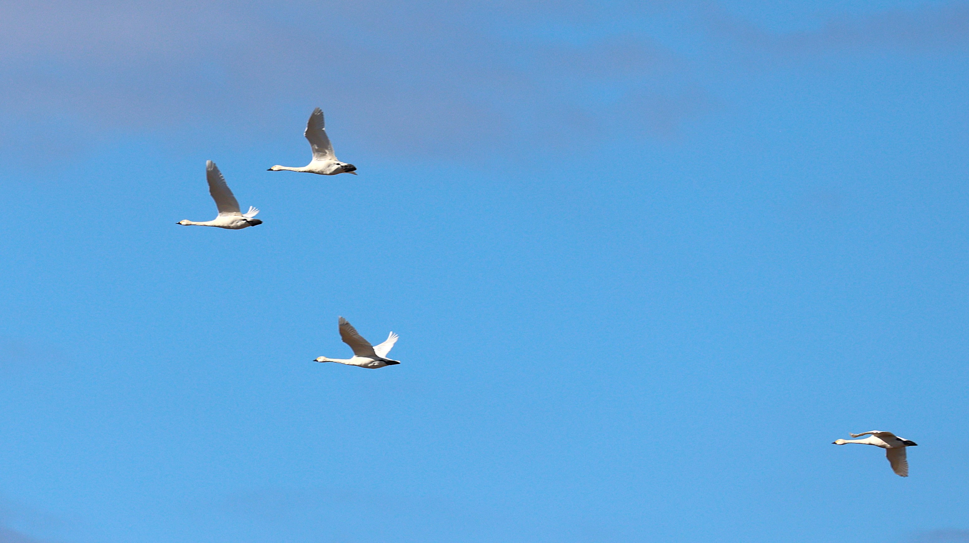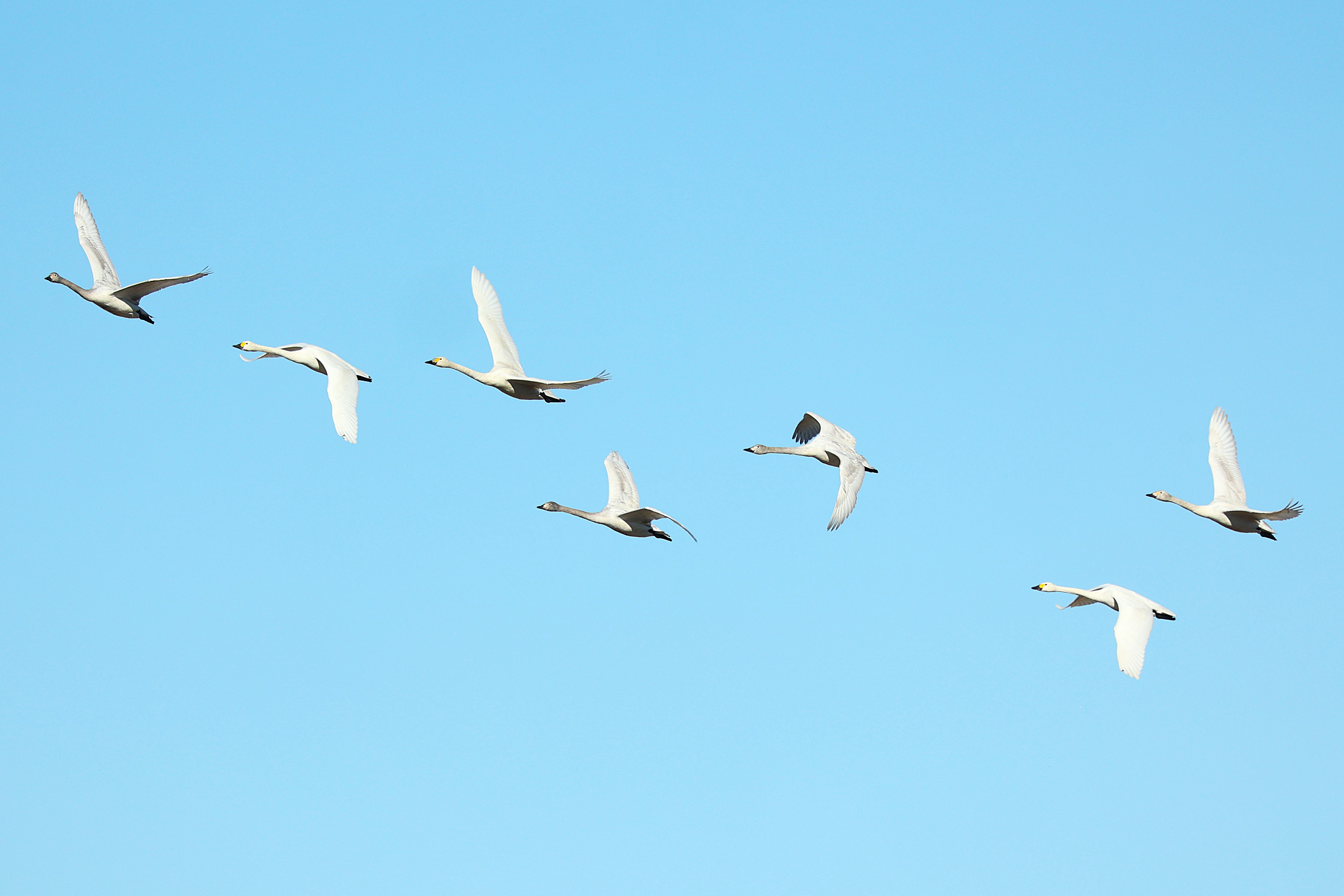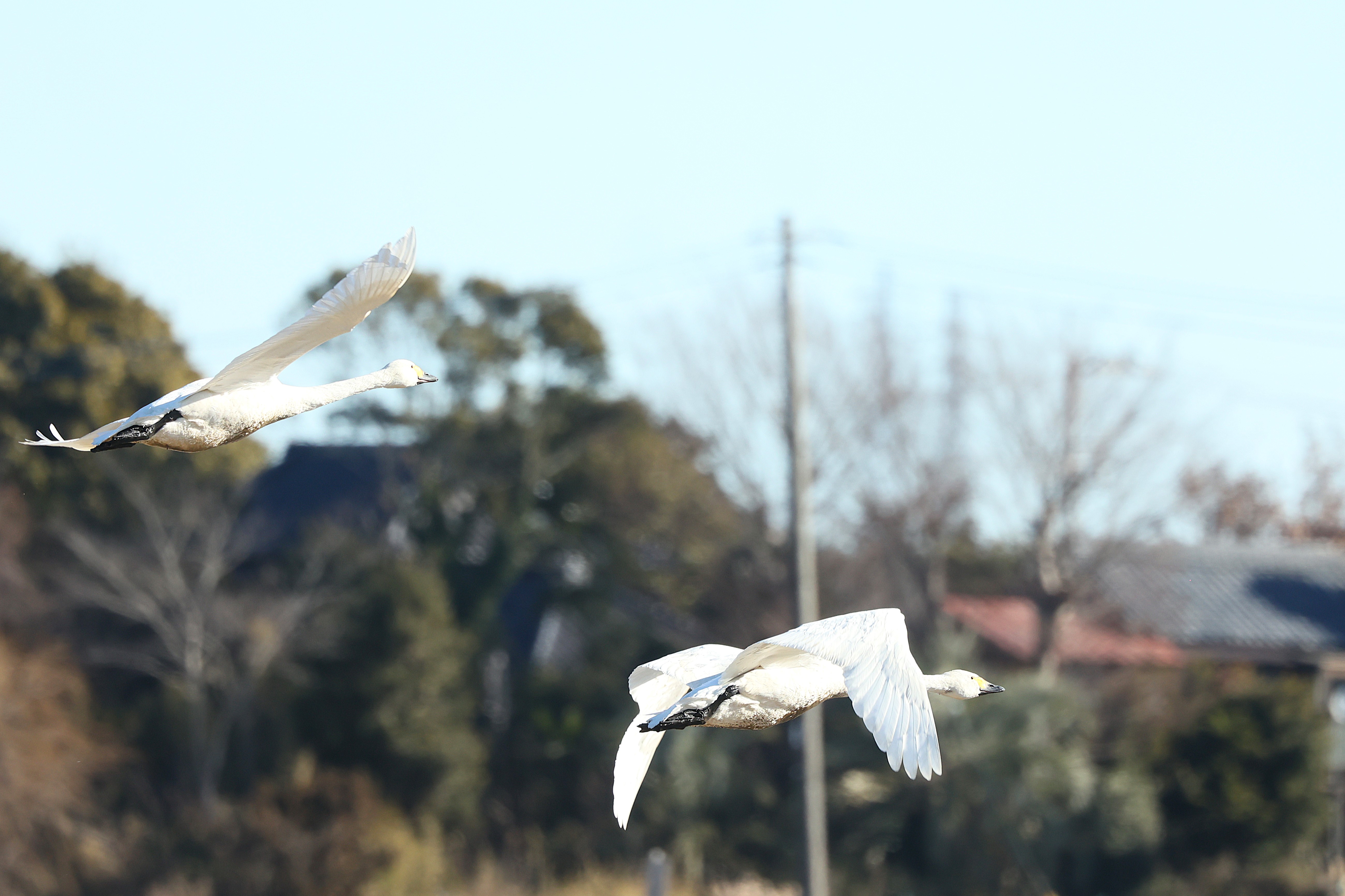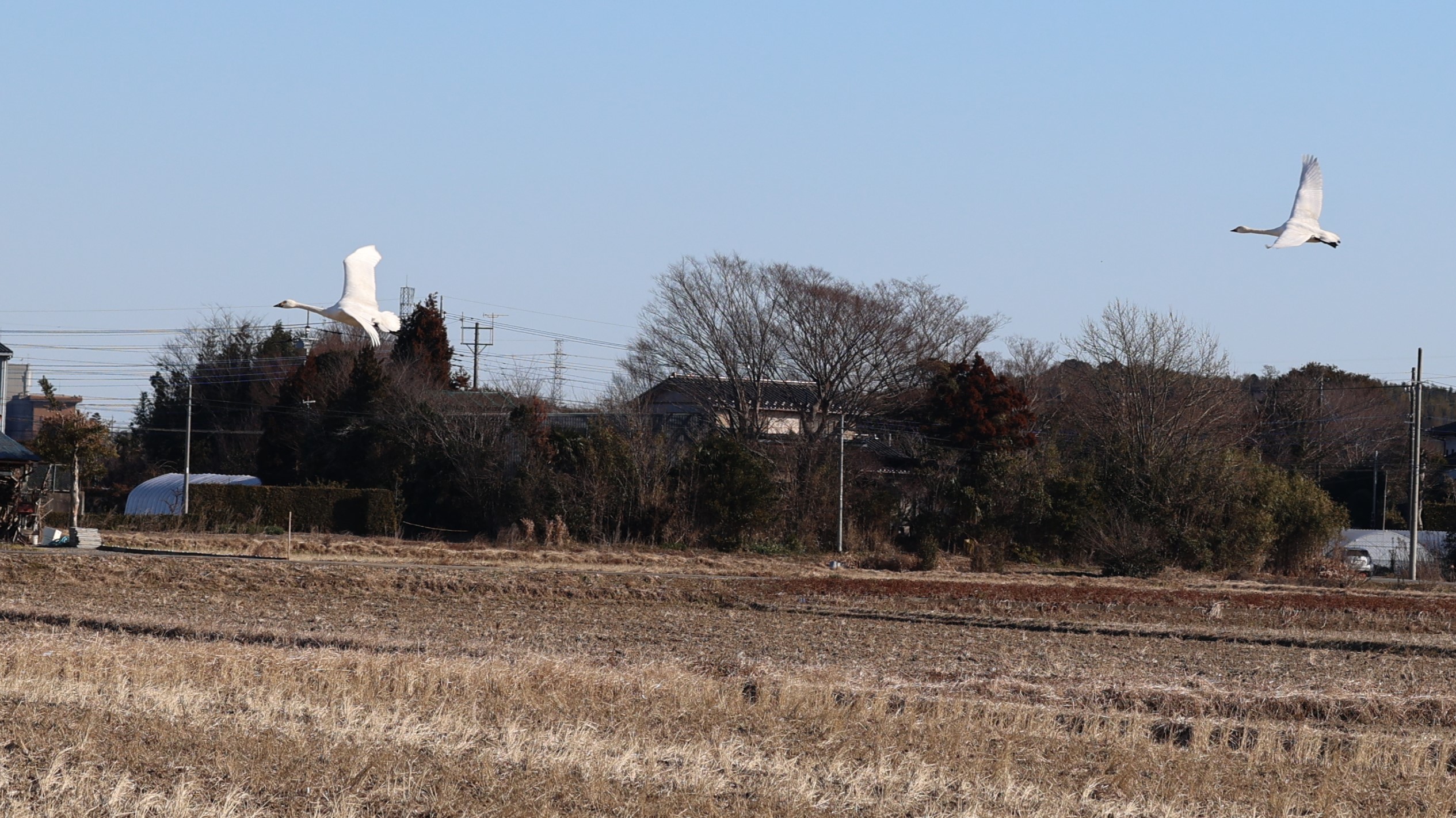 宮城県の伊豆沼・蕪栗沼周辺や千葉県印西市本埜の白鳥の郷周辺の田園地帯など歩いていると、頭上近くを白鳥家族が飛ぶことが有り、ユッサユッサと羽ばたく大きな音も聞こえます。田園地帯を白鳥の群れが三々五々飛び交う風景を見ると、懐かしい日本の原風景を見ているような満ち足りた気持ちになります。