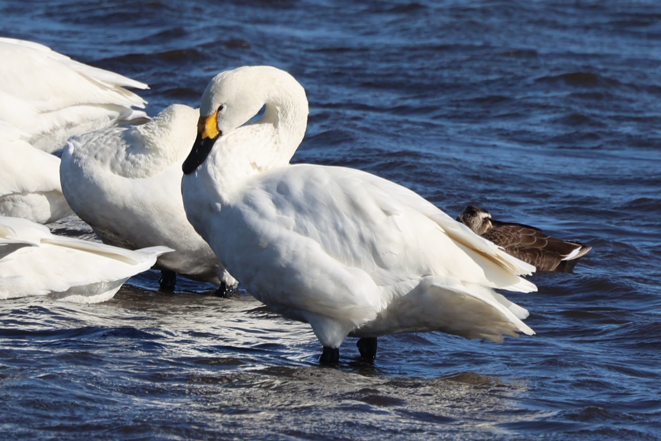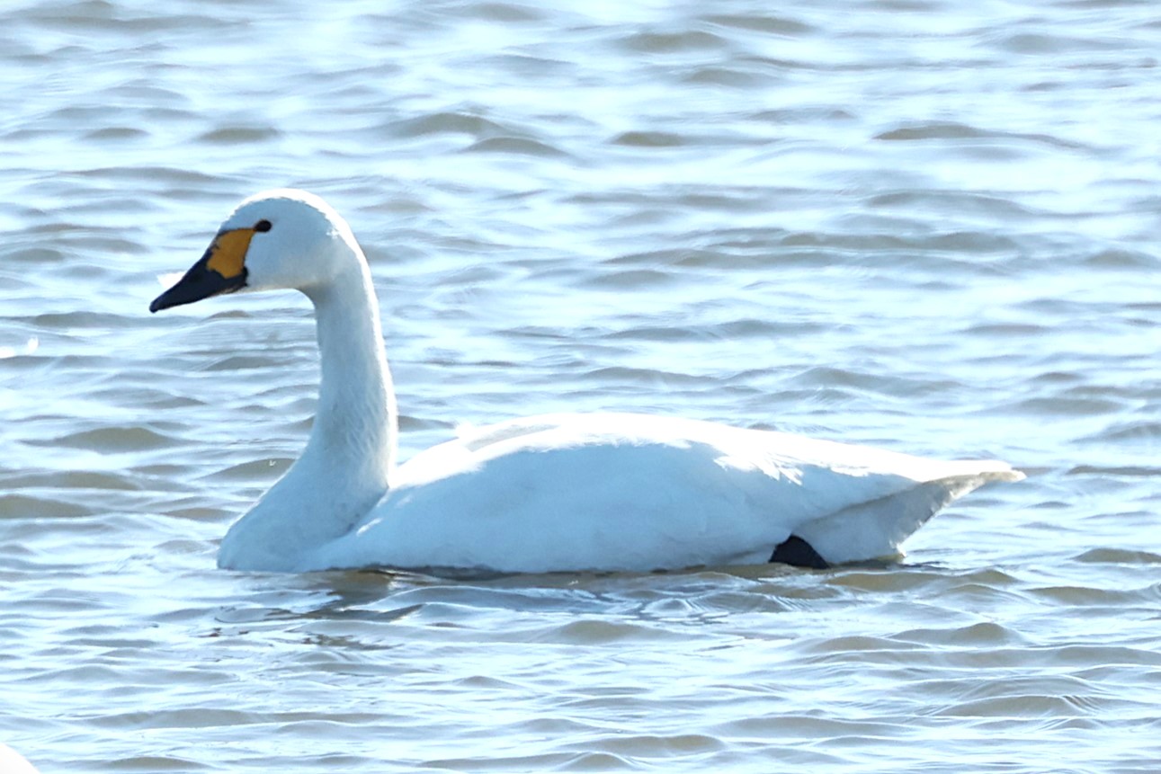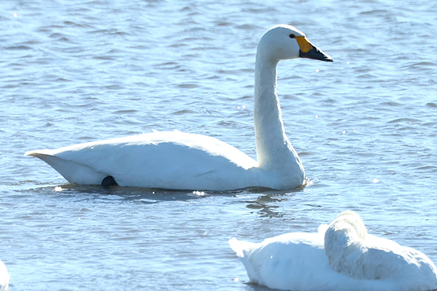 オオハクチョウとコハクチョウの見分け方は、嘴の黄色い部分に着目します。黄色い部分が大きくて先が尖っていればオオハクチョウ、小さくて嘴の半分以下の大きさで先が尖っていなければコハクチョウです。亜種アメリカコハクチョウは黄色い部分がごく小さくなっています。