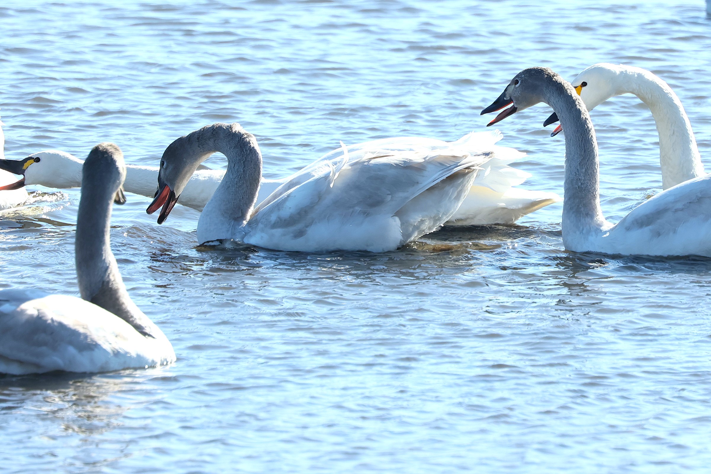 コハクチョウの繁殖地は北極海沿岸のツンドラ地帯で、冬鳥として越冬のために日本にやってきます。ハクチョウは家族の絆が強く、親子が一緒に行動します。一家族4~7羽ぐらいで、当年生まれの子と、時には前年生まれの子が一緒に行動することも有ります。当年生まれの子は全体が灰色っぽい色をしているのですぐ分かります。