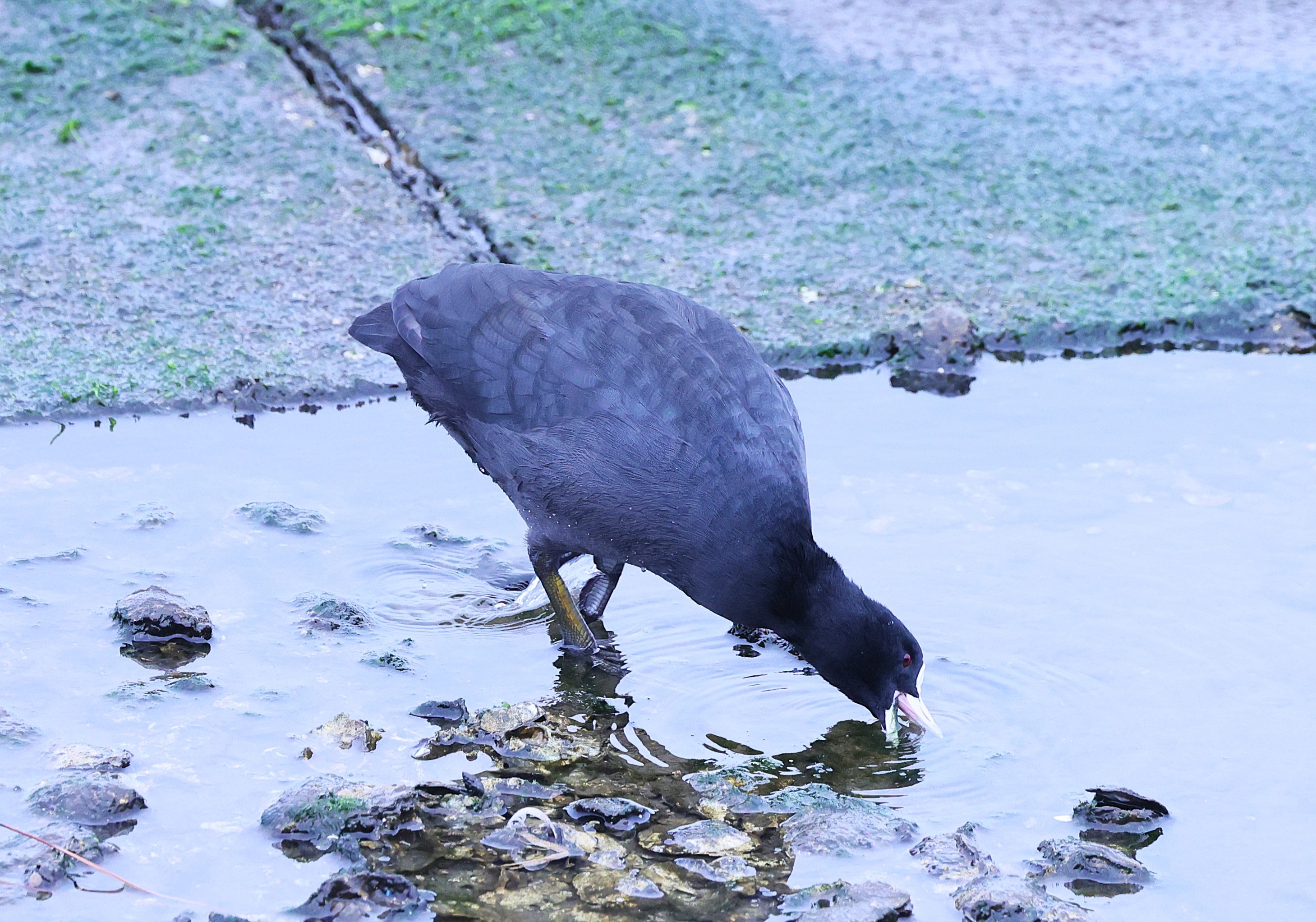 オオバンはコクガンのこうした行為を嫌がって逃げるか、と言うと素人目にはそんなふうには見えません。コクガンも手荒に奪っているかというと、これものんびりした感じで至って平和的に見えます、なんとも不思議な関係です。