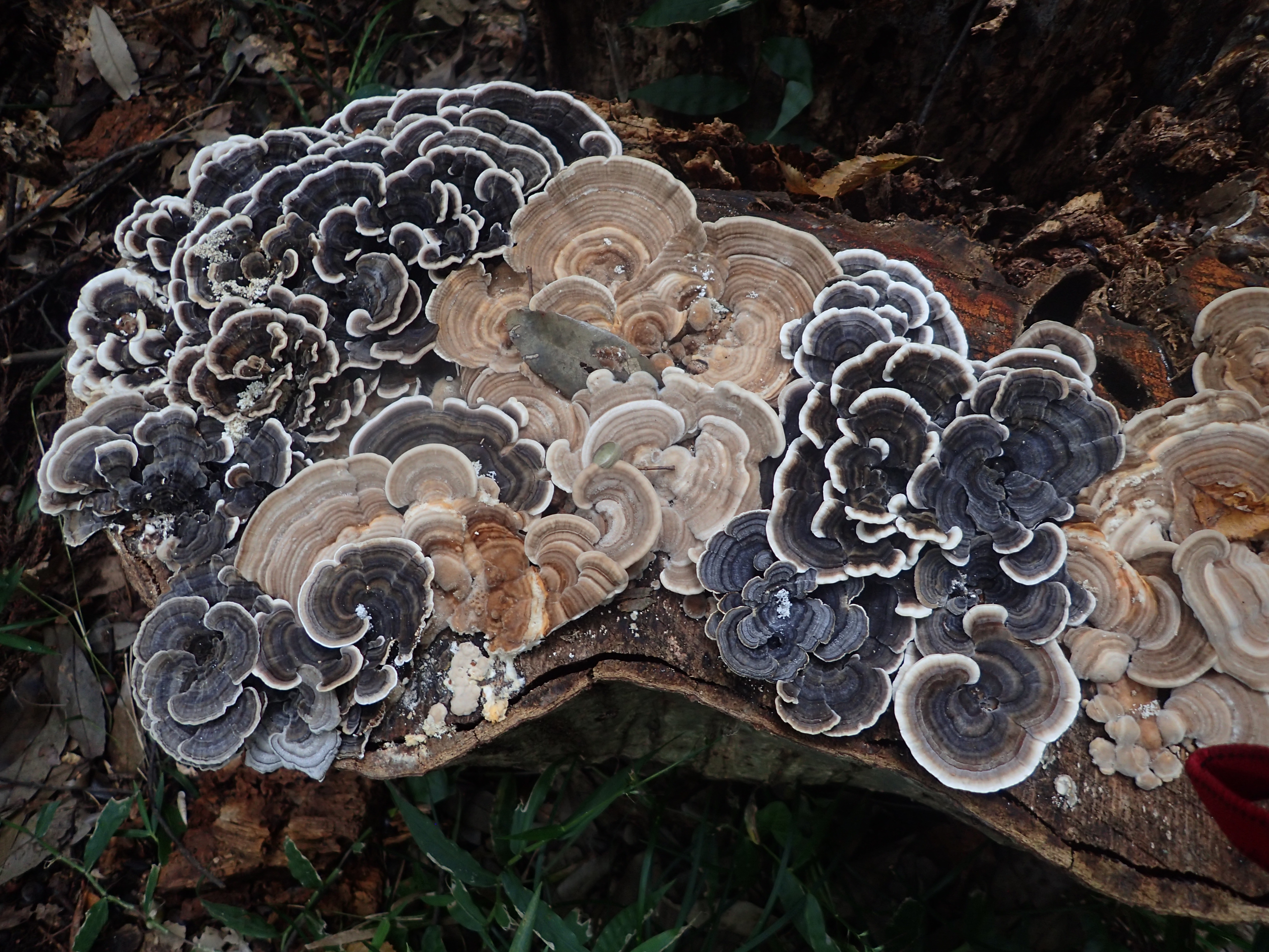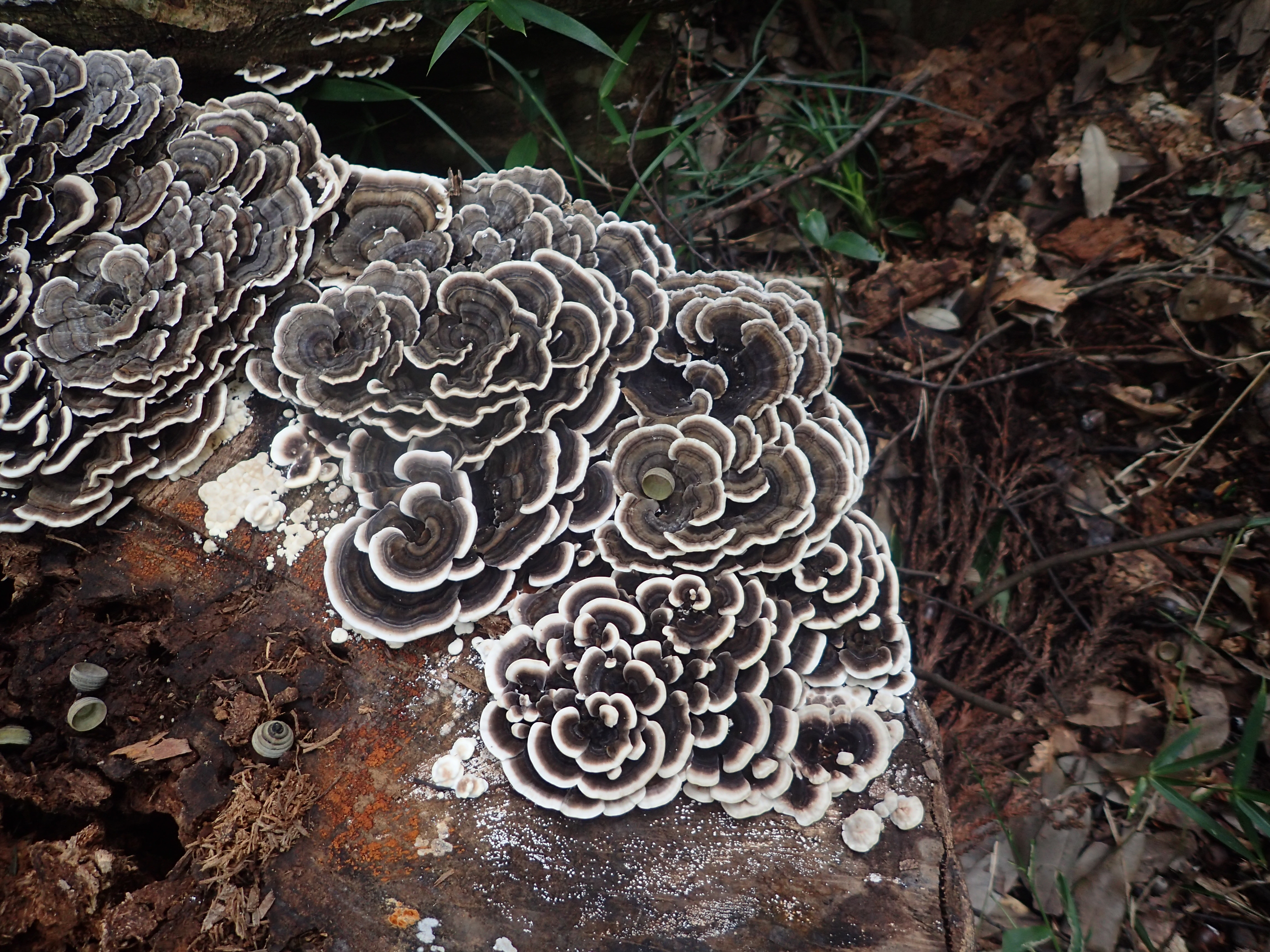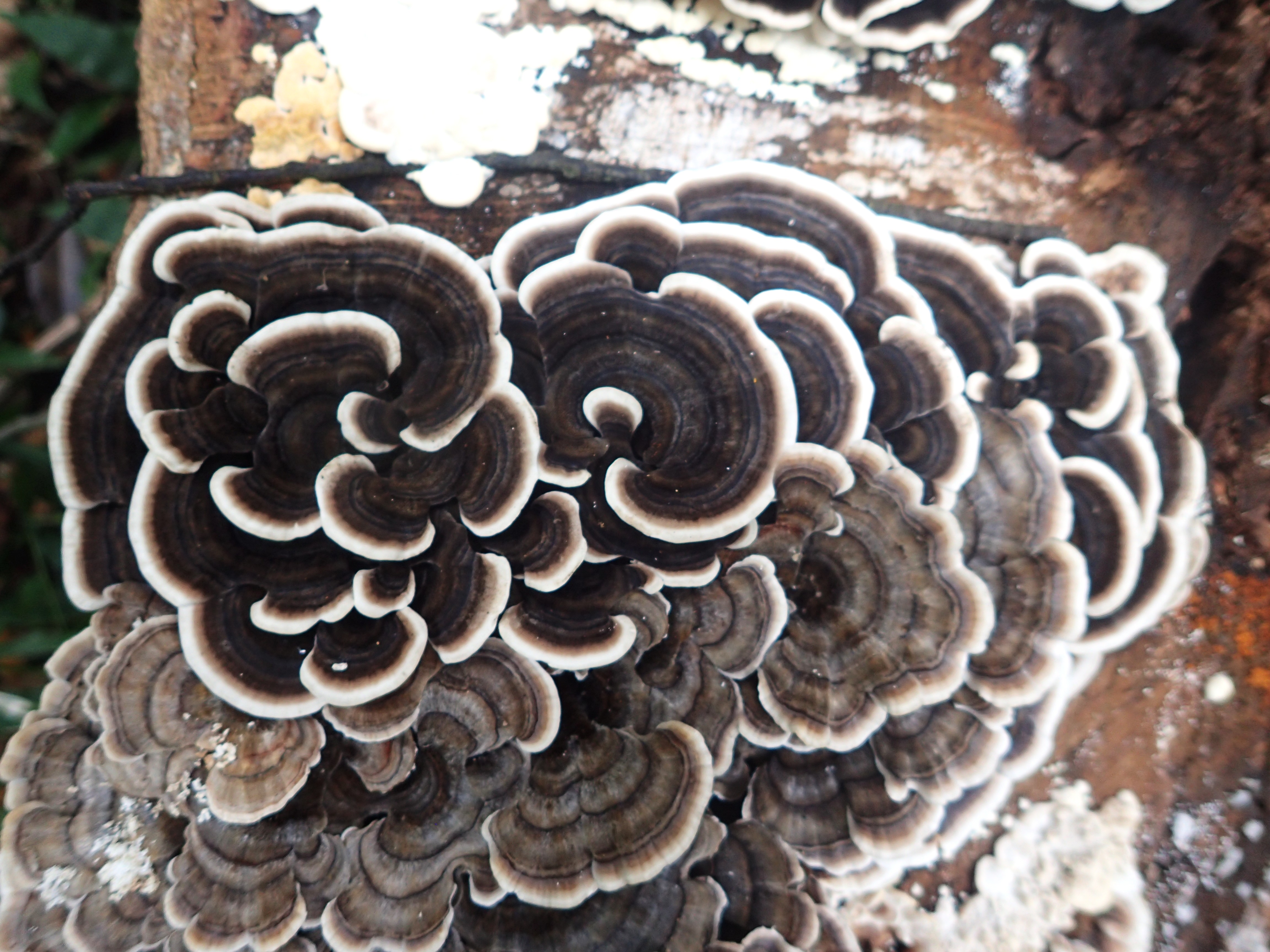 カワラタケは系3~5cmの扇型、半円形の黒っぽいキノコが重なり合って生え、屋根瓦のように見えるところから付けられた名前です。一年中、最も普通に見られる木材分解菌です。色は変化に富み、黄褐色や灰褐色から黒色でやや青味を帯びることが多いです。表面は短い毛が環状の模様となり、生長している外側周辺は白っぽく、丸く群生すると花が咲いているようにも見えます。