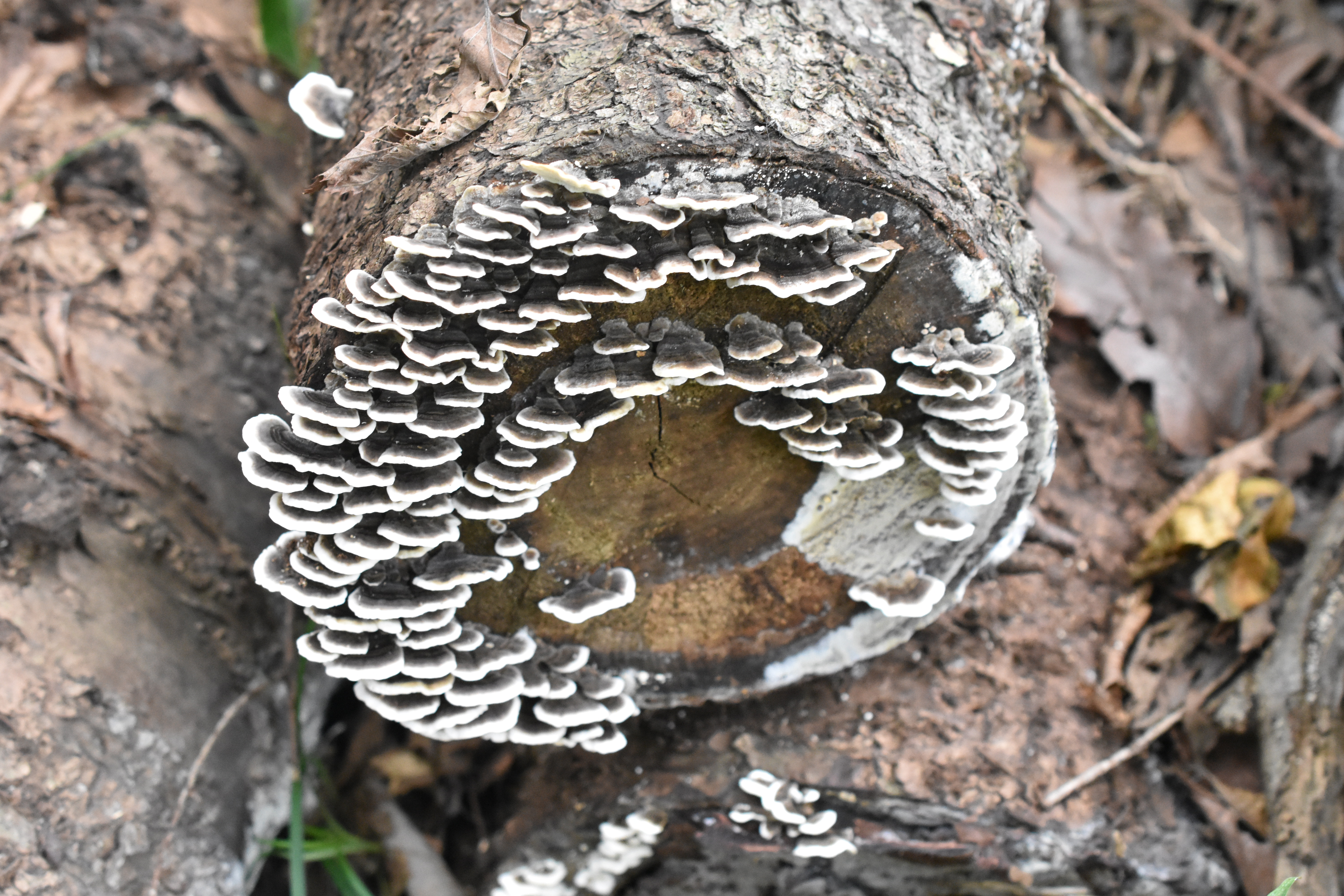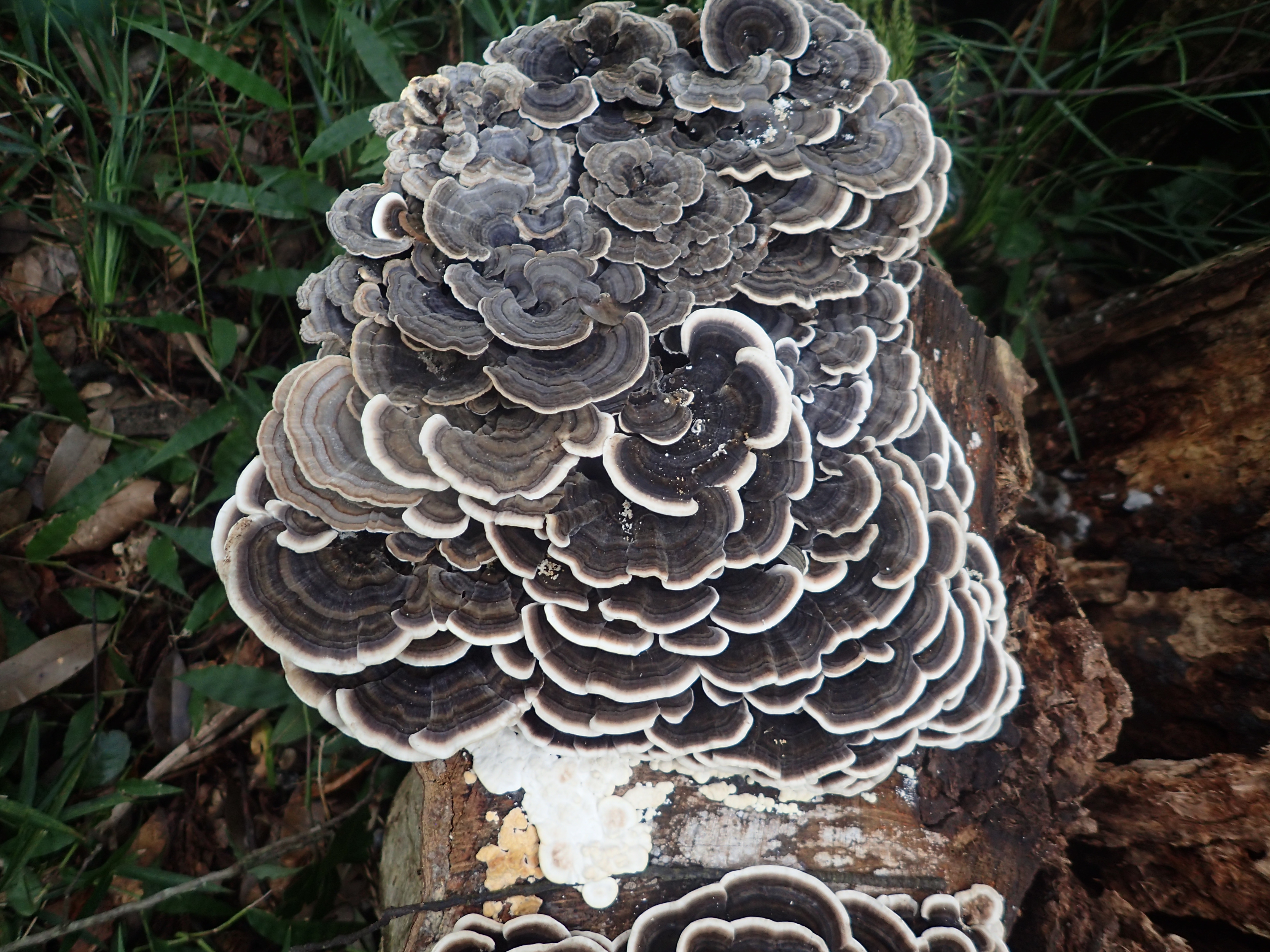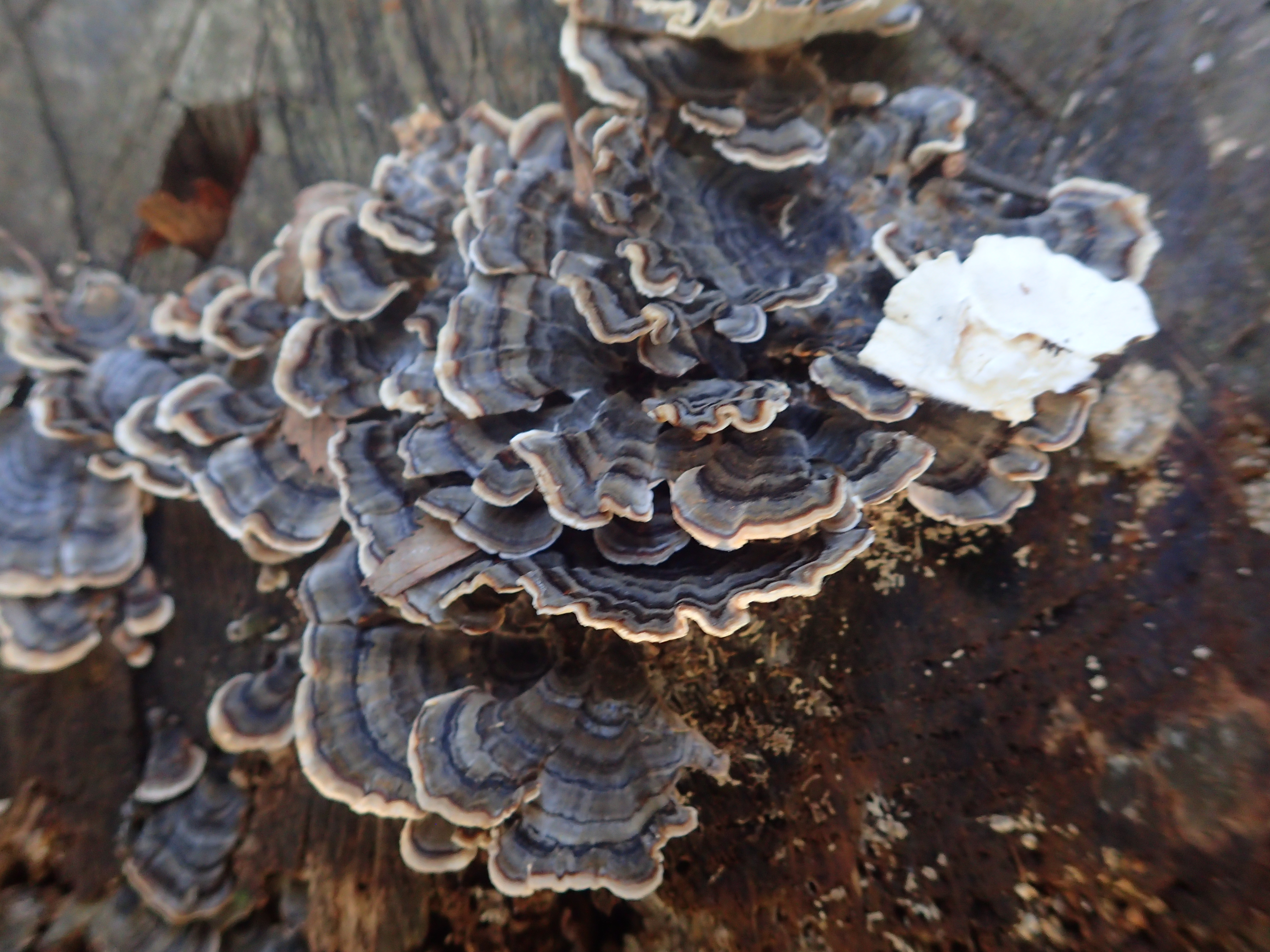 カワラタケは系3~5cmの扇型、半円形の黒っぽいキノコが重なり合って生え、屋根瓦のように見えるところから付けられた名前です。一年中、最も普通に見られる木材分解菌です。色は変化に富み、黄褐色や灰褐色から黒色でやや青味を帯びることが多いです。表面は短い毛が環状の模様となり、生長している外側周辺は白っぽく、丸く群生すると花が咲いているようにも見えます。