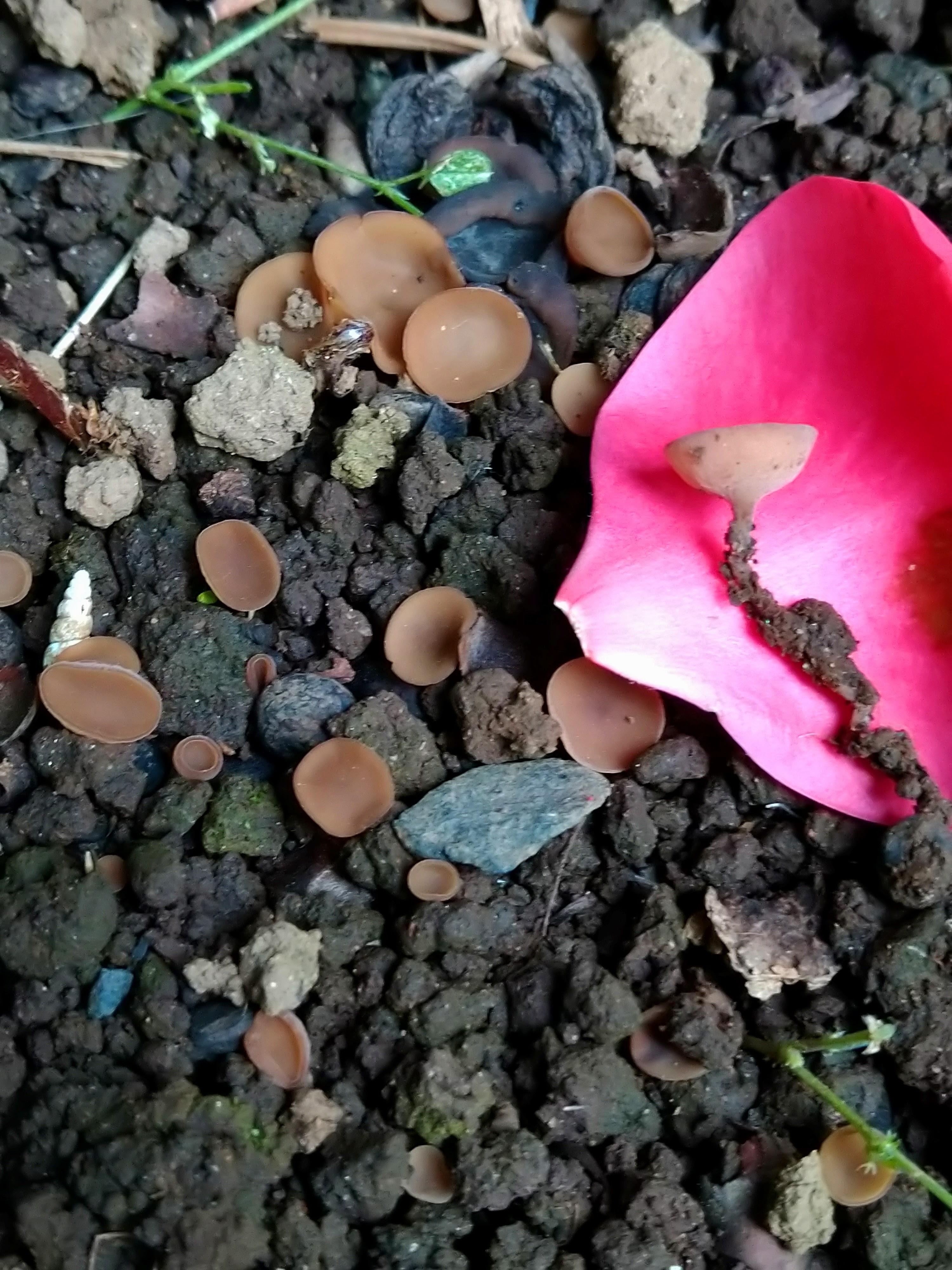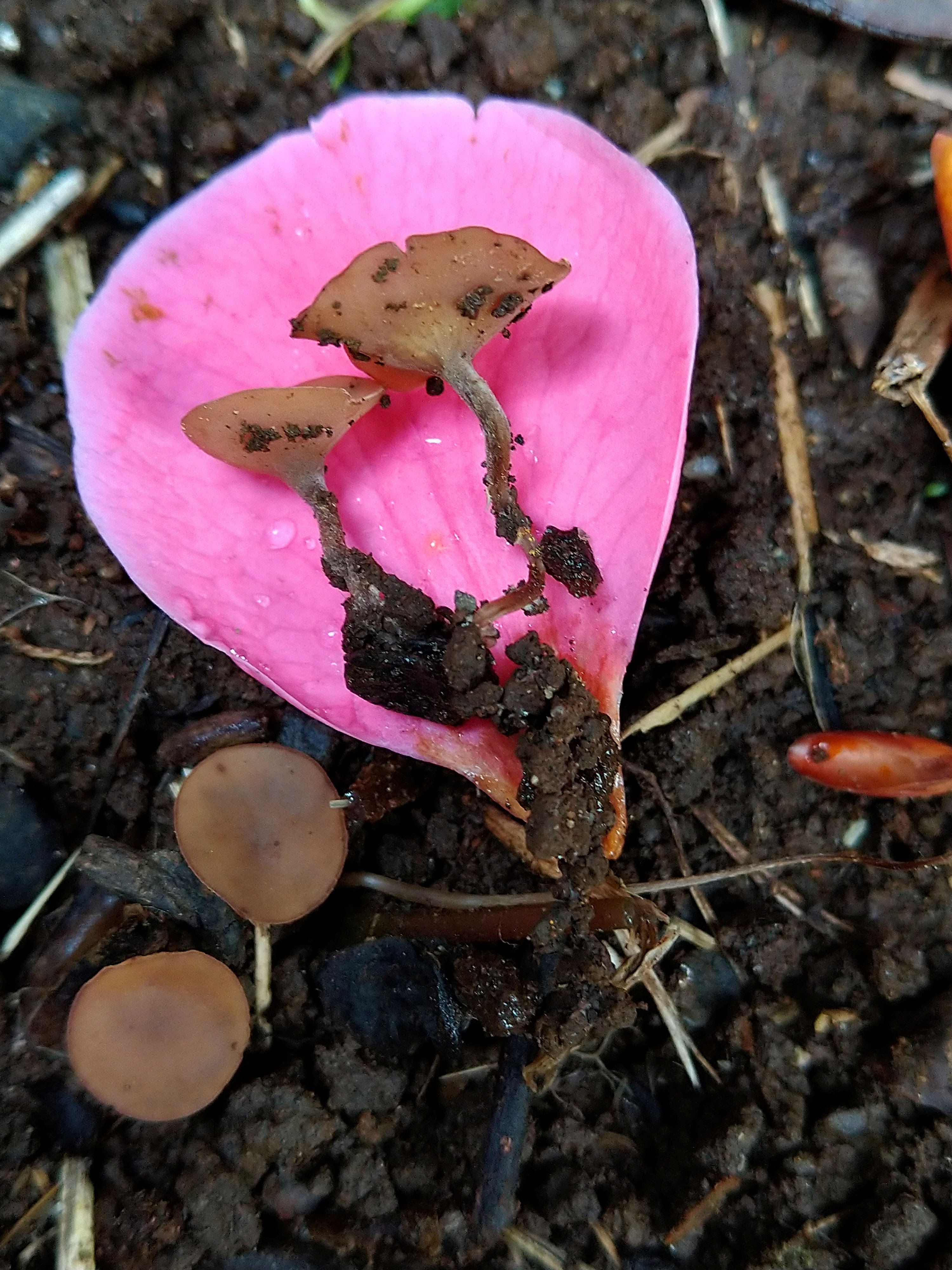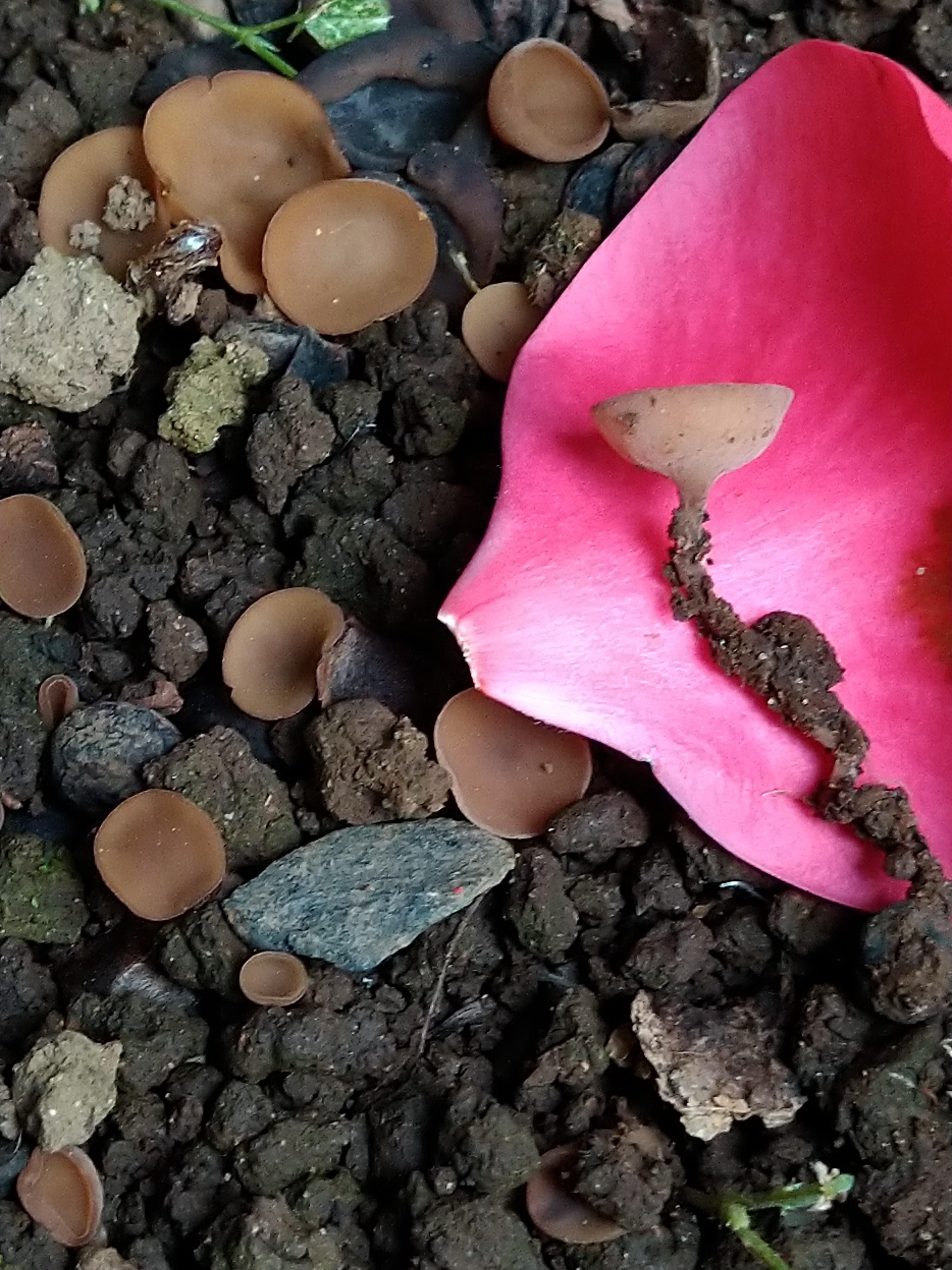 早春の2~3月にツバキの樹の下に見られる小さなお椀型のキノコです。前年に落花して朽ちた花弁やガク片に作られていた菌核という黒っぽい菌糸の塊から柄を伸ばし、お椀型のキノコを作ります。生長するとお椀は浅くなり茶碗とういうよりお皿のようになります。