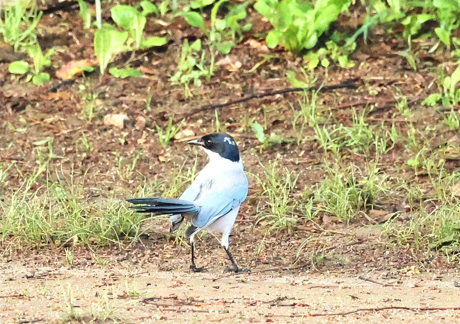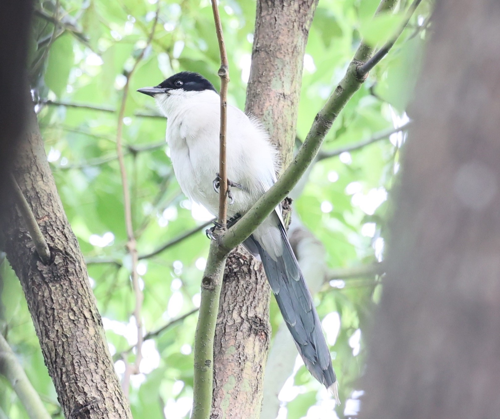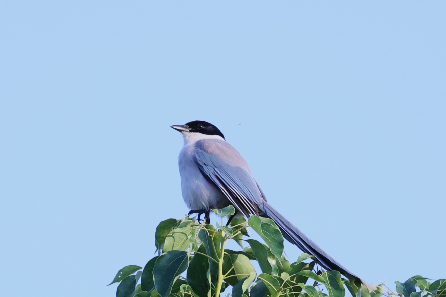 名前の由来になっている青灰色の長い尾、ベレー帽をかぶったようなお洒落な黒い頭、喉から胸にかけては白く、体型もスマートですっきりしています。