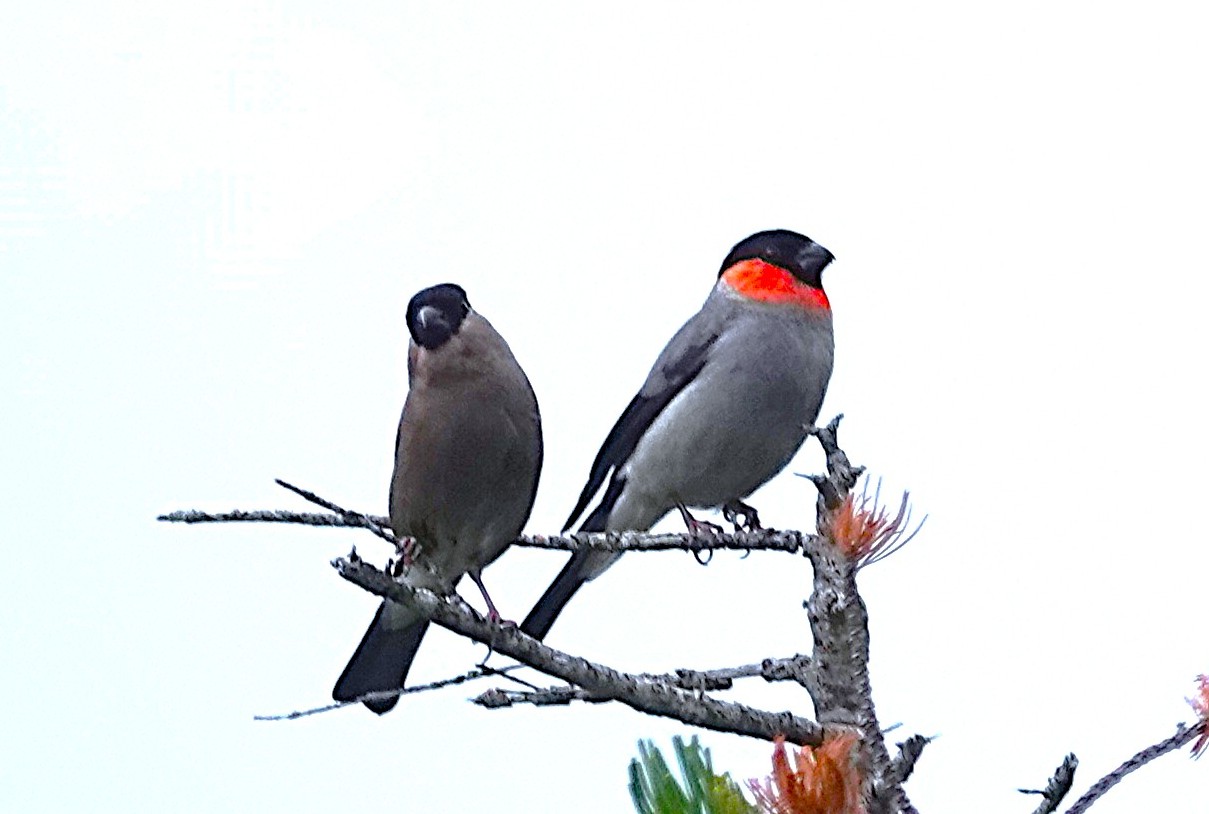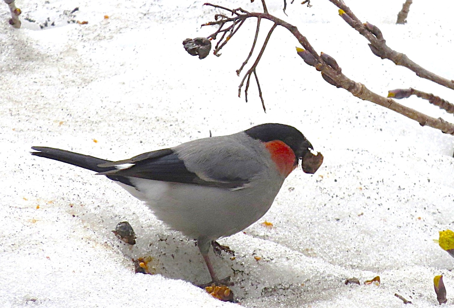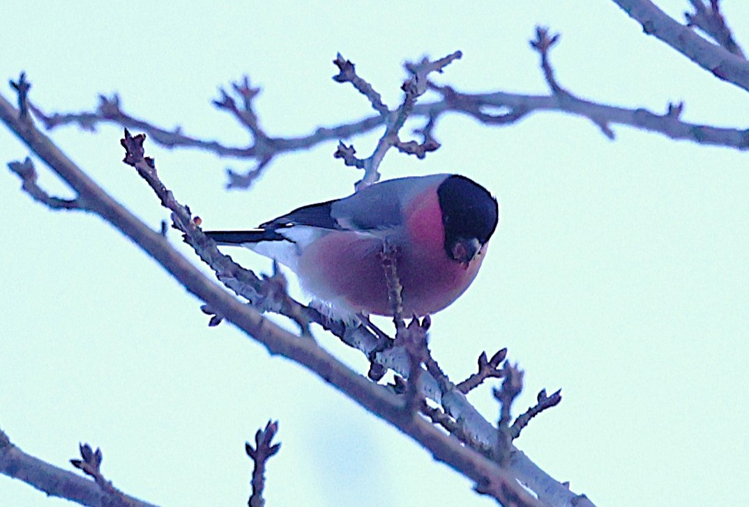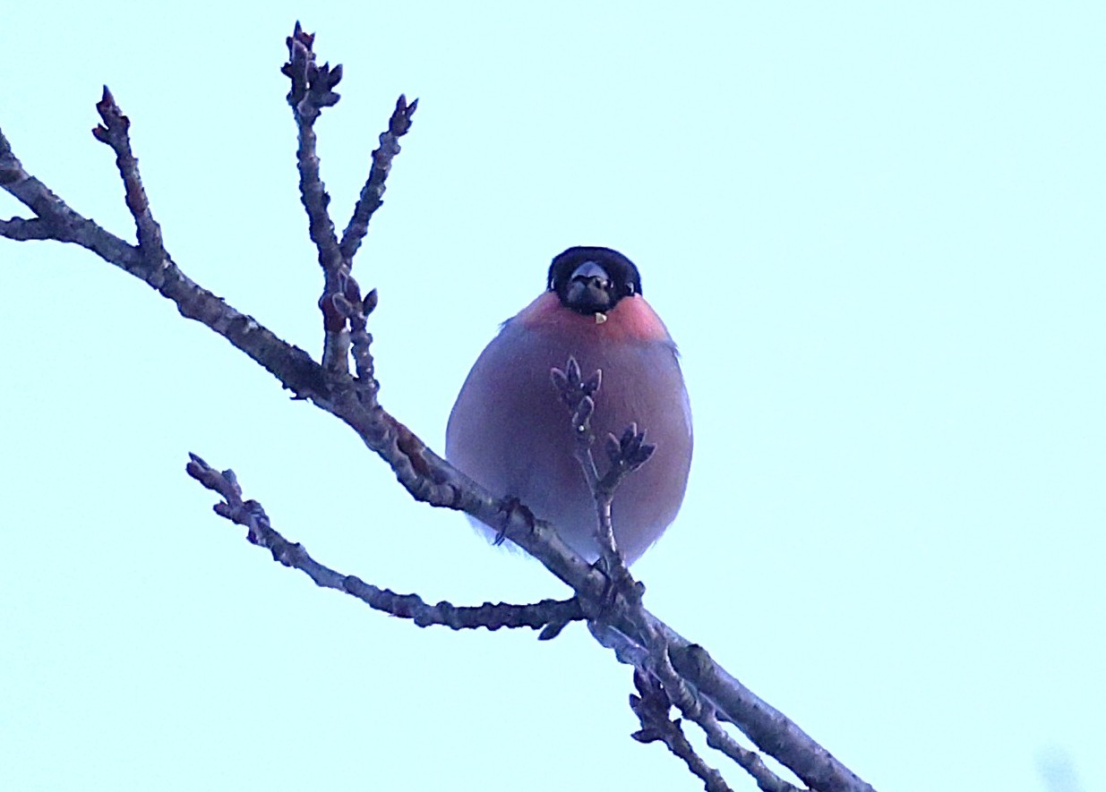ころっとした体形で、頭にはすっぽり黒頭巾を被り、オスの喉は赤く、なんとも愛嬌のある鳥です。嘴は太くて短いのですが、これは木の芽や木の実をすり潰して食べるのに適しています。特にウメ、モモ、サクラの花芽を良く食べます。