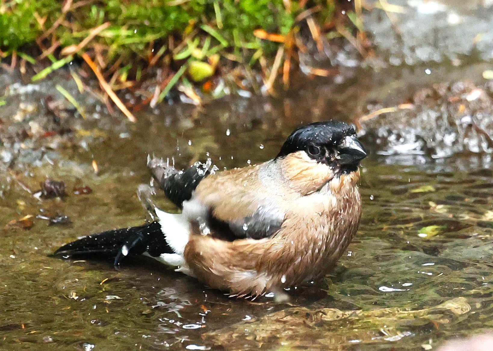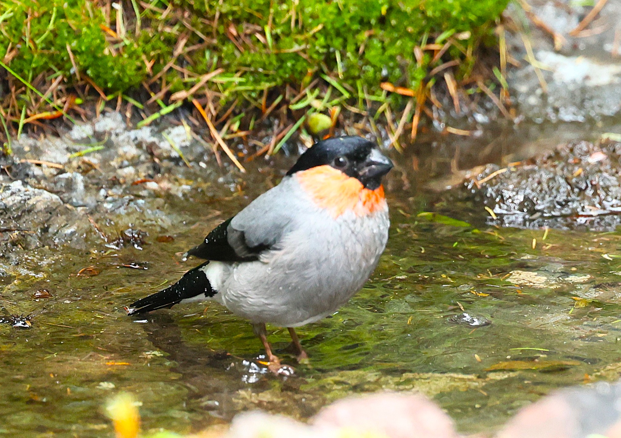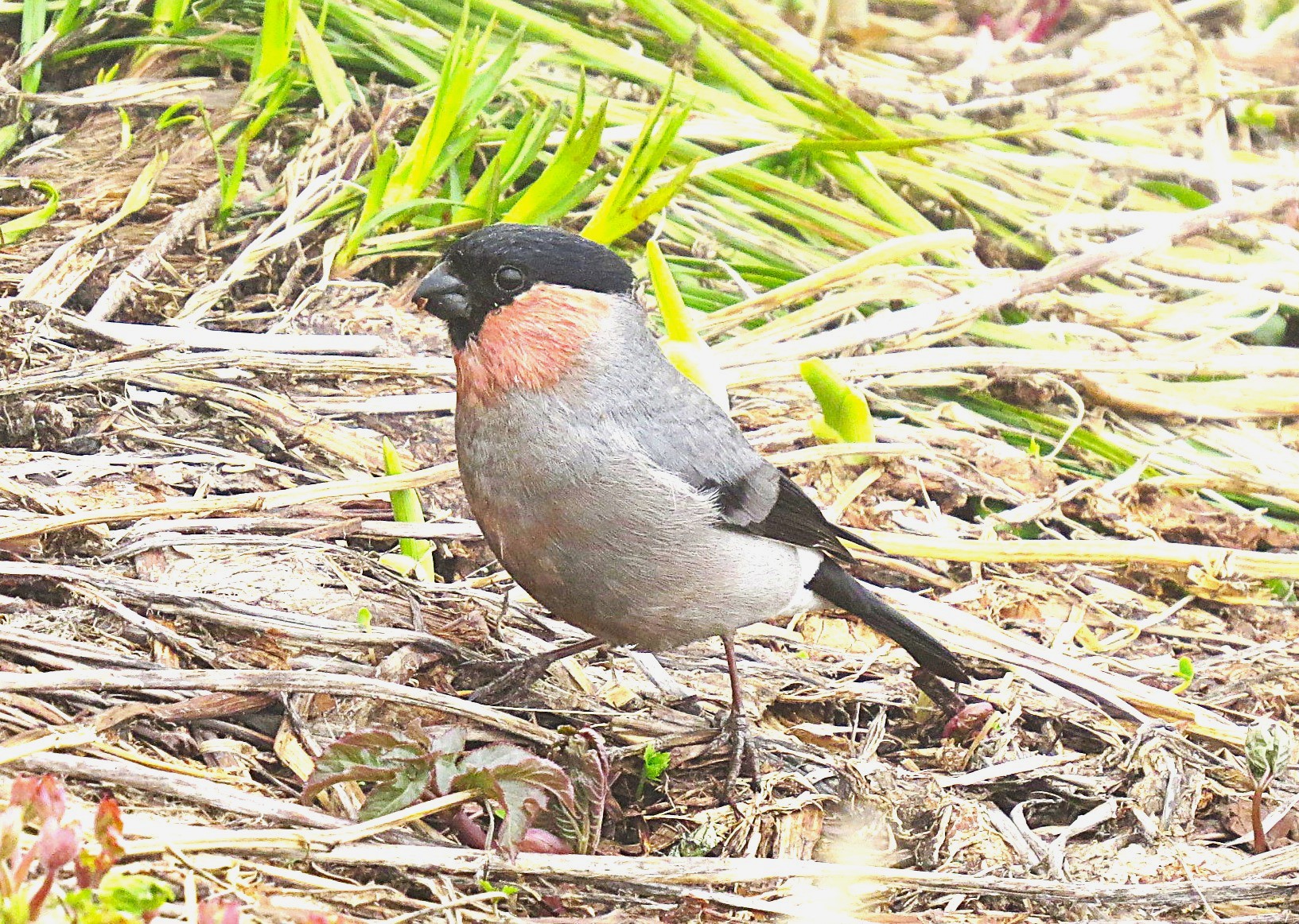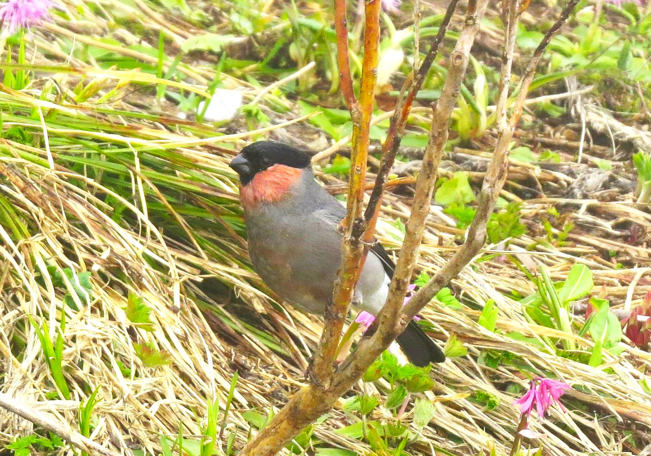 ころっとした体形で、頭にはすっぽり黒頭巾を被り、オスの喉は赤く、なんとも愛嬌のある鳥です。嘴は太くて短いのですが、これは木の芽や木の実をすり潰して食べるのに適しています。特にウメ、モモ、サクラの花芽を良く食べます。