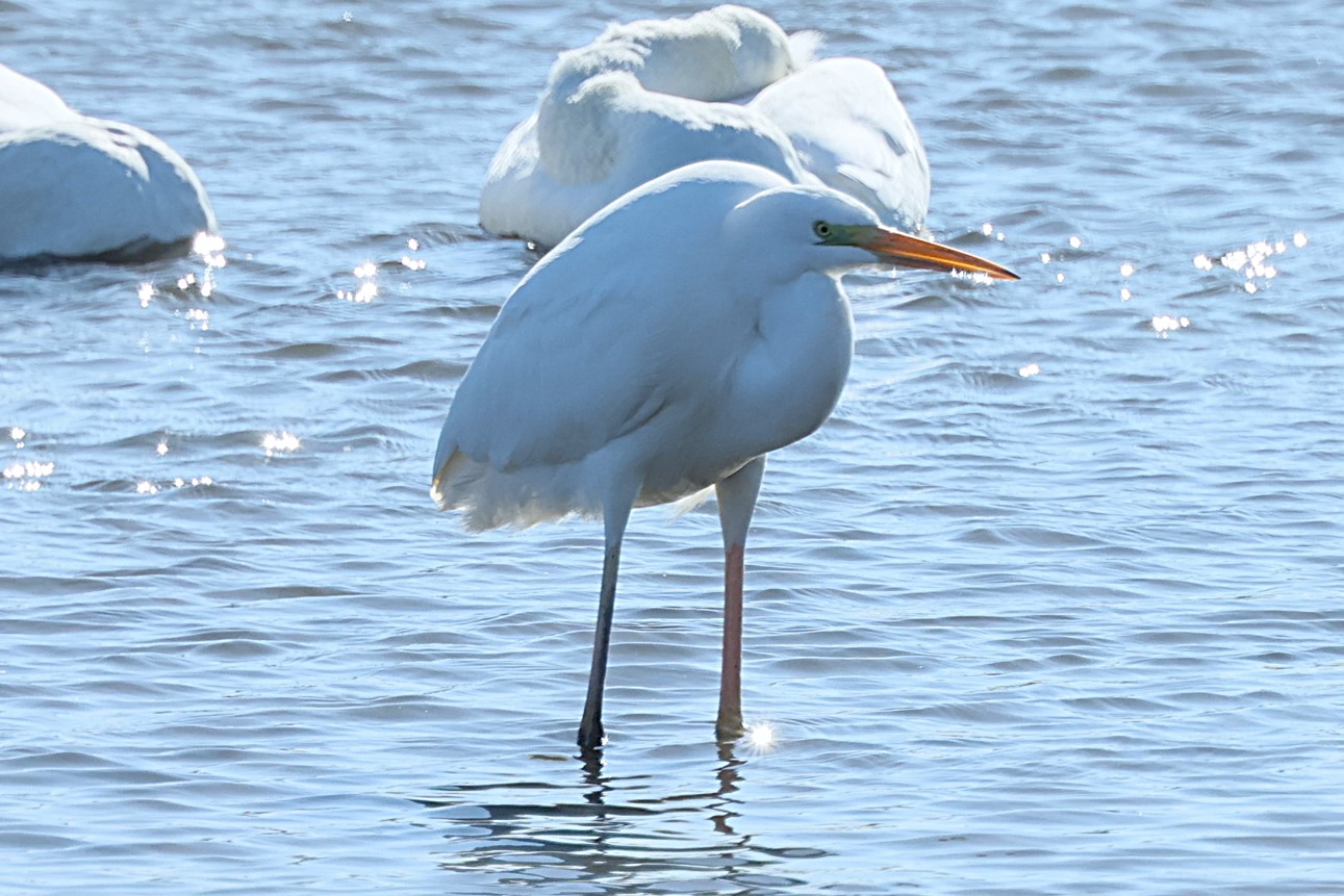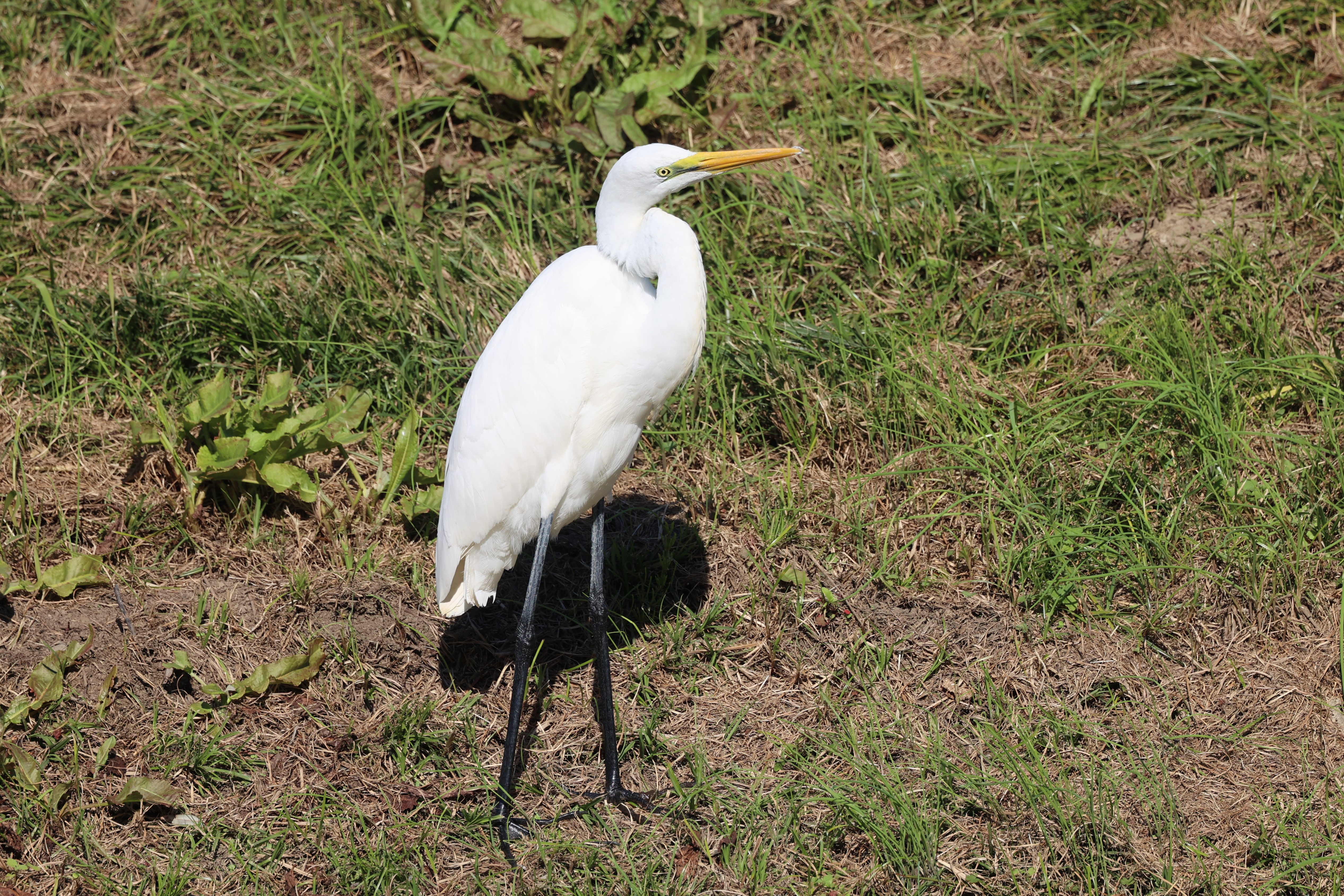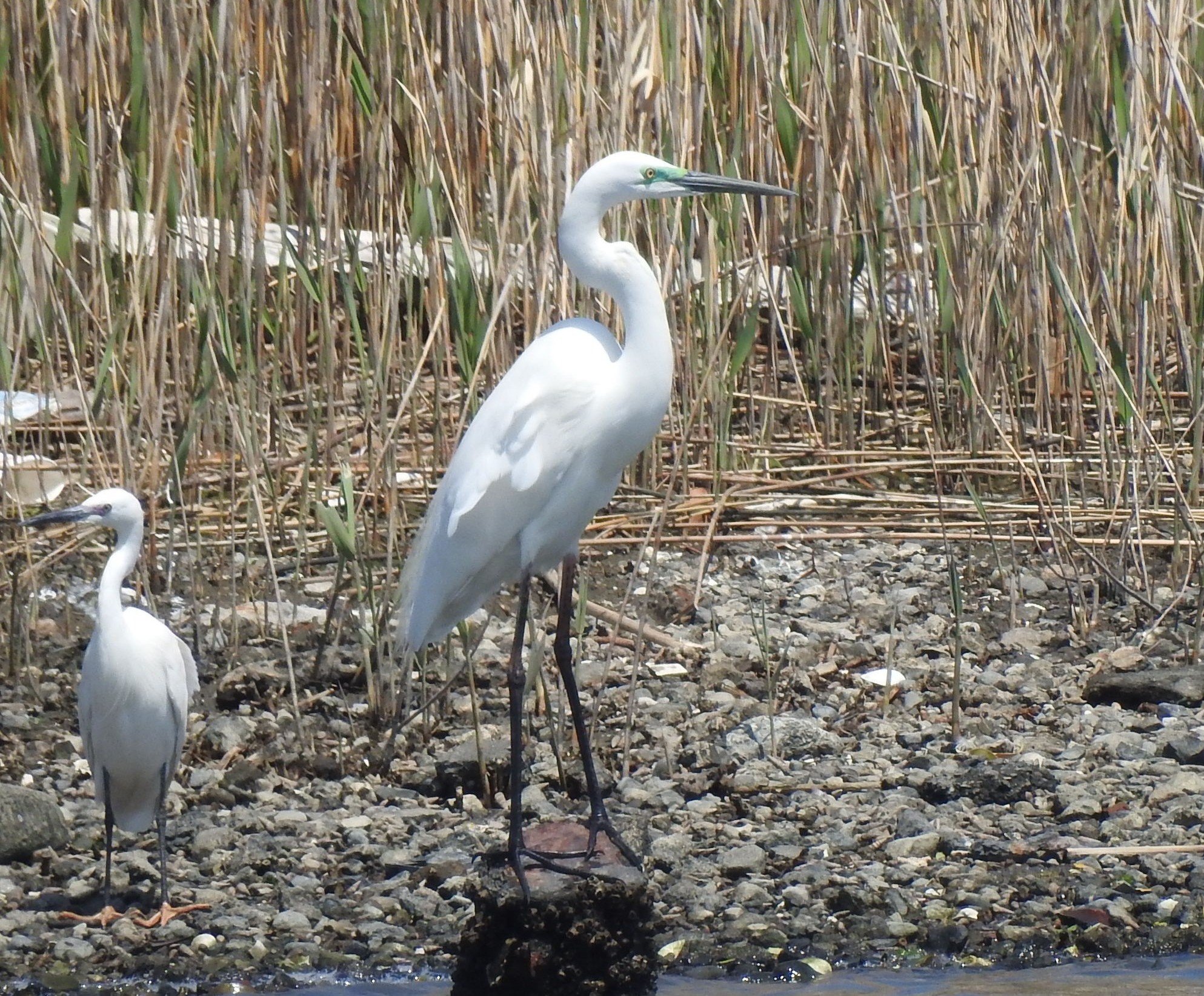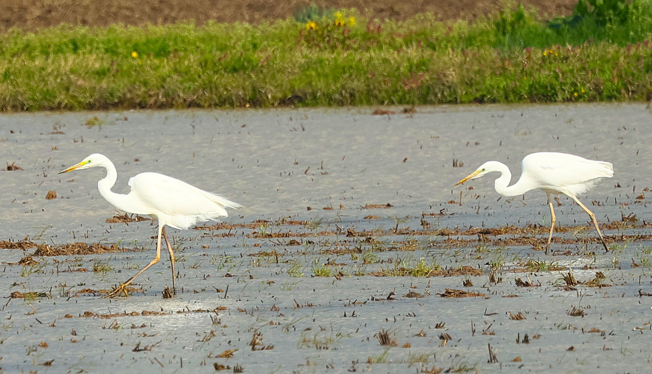 亜種ダイサギはロシアなどから渡ってくる冬鳥で、亜種チュウダイサギより一回り大きく、また足の付け根がやや黄色っぽいのが特徴です。チュウダイサギは夏鳥で、夏に田んぼなどの水辺で魚やカエルを取っているのがこれです。チュウダイサギは一部が日本で越冬するため、冬にはダイサギとチュウダイサギが並んで見られることも有ります。