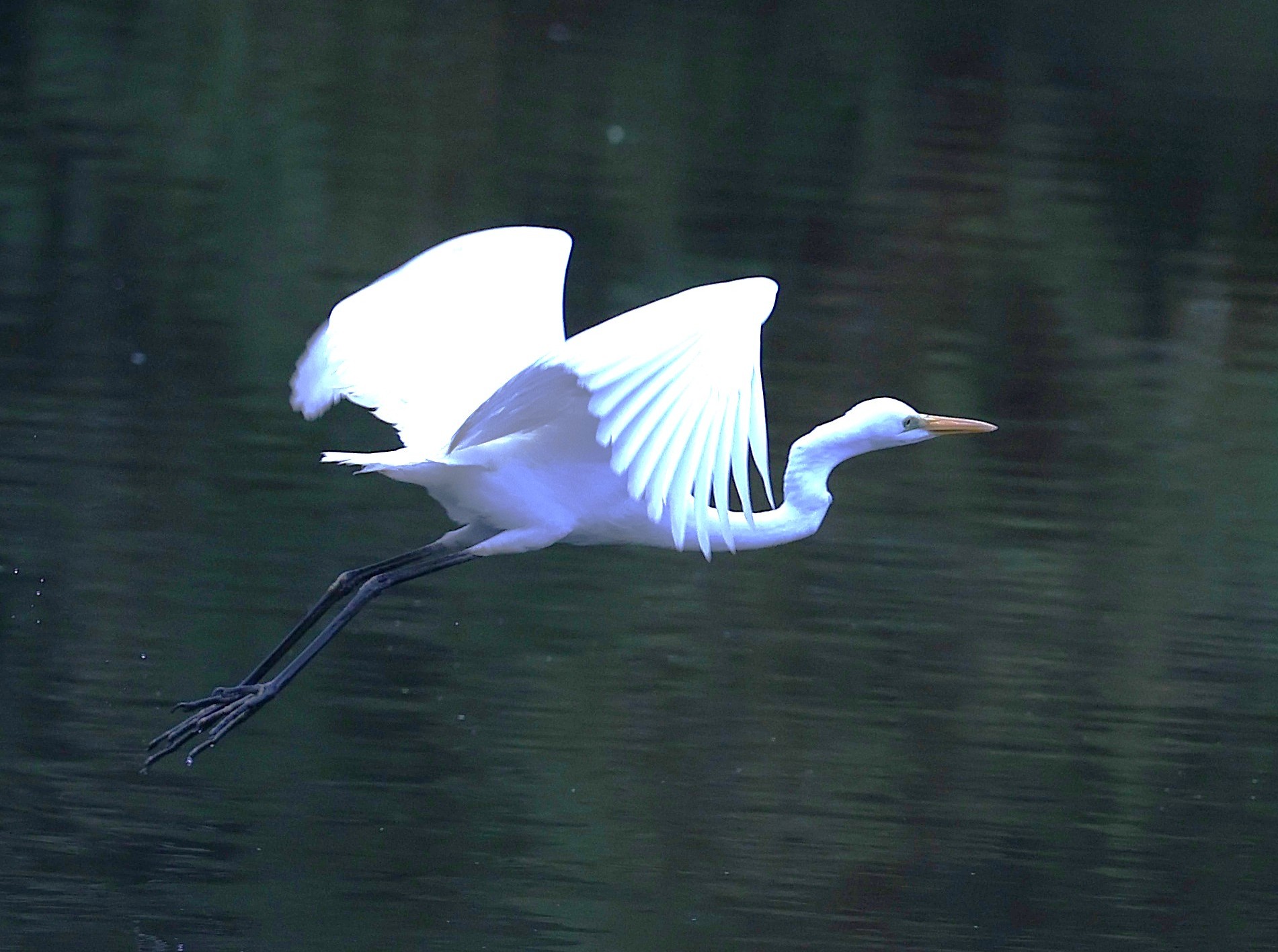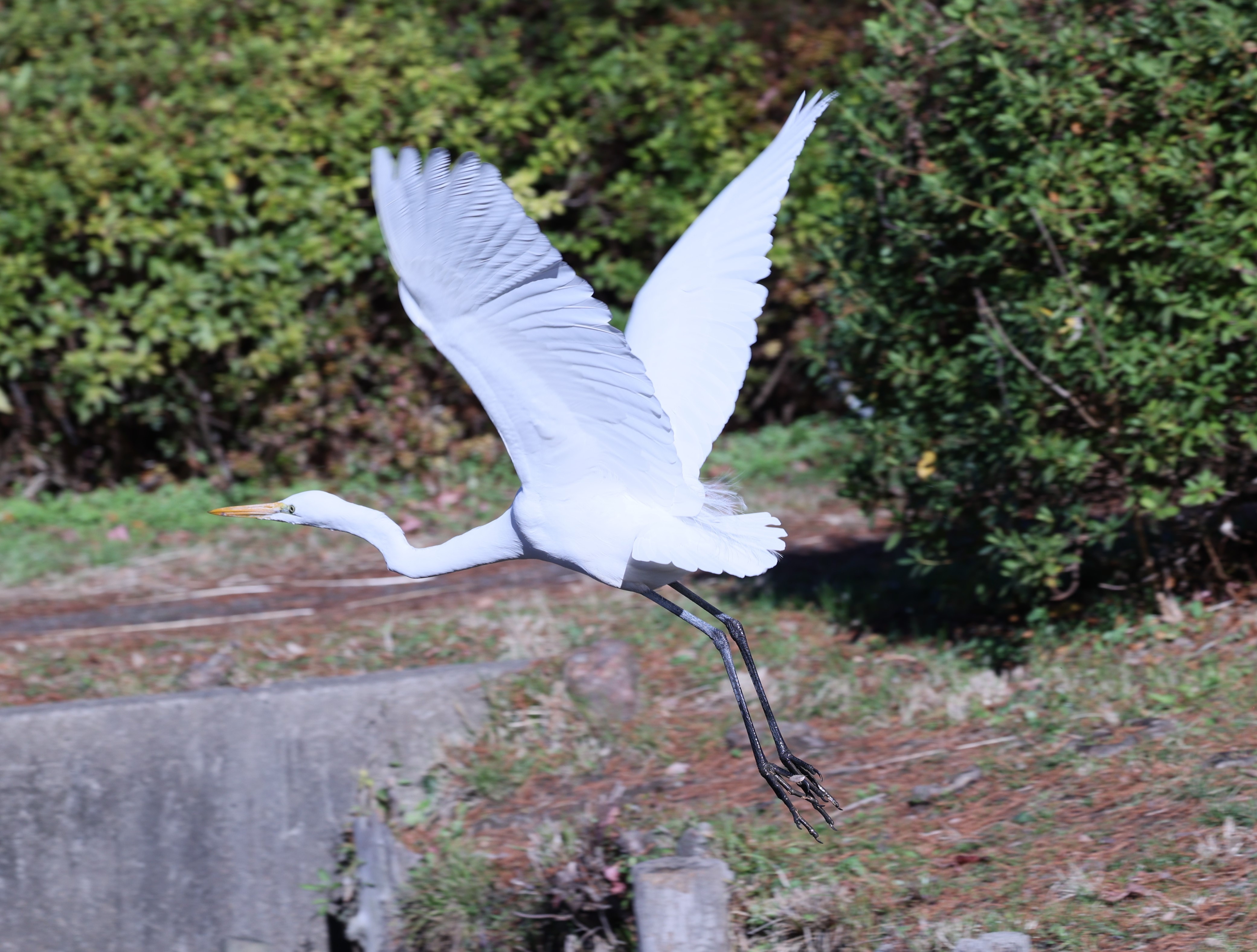 飛翔する姿はゆったりと羽ばたき優雅です。サギの仲間は長い首をS字形に締めて飛びますが、同じように長い首を持つツルの仲間(タンチョウ、マナヅルなど)は首を伸ばしたまま飛びます。