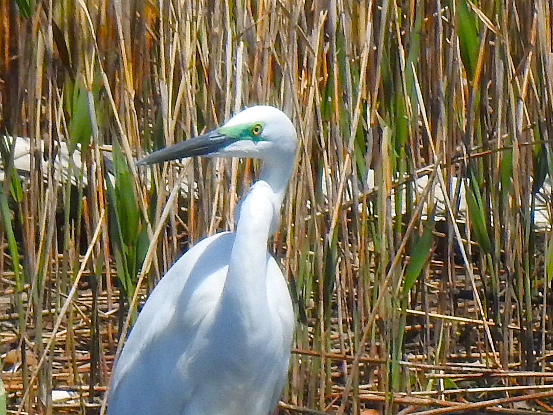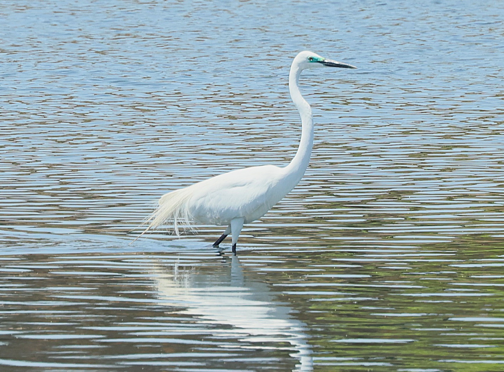 ダイサギは繁殖期になると目先が美しい緑色(エメラルドグリーン)になります。チュウサギの目先は黄色、コサギはピンクになるので、3種の見明け方として、大・中・小で青(緑)・黄・赤の信号の色になると覚えておきます。