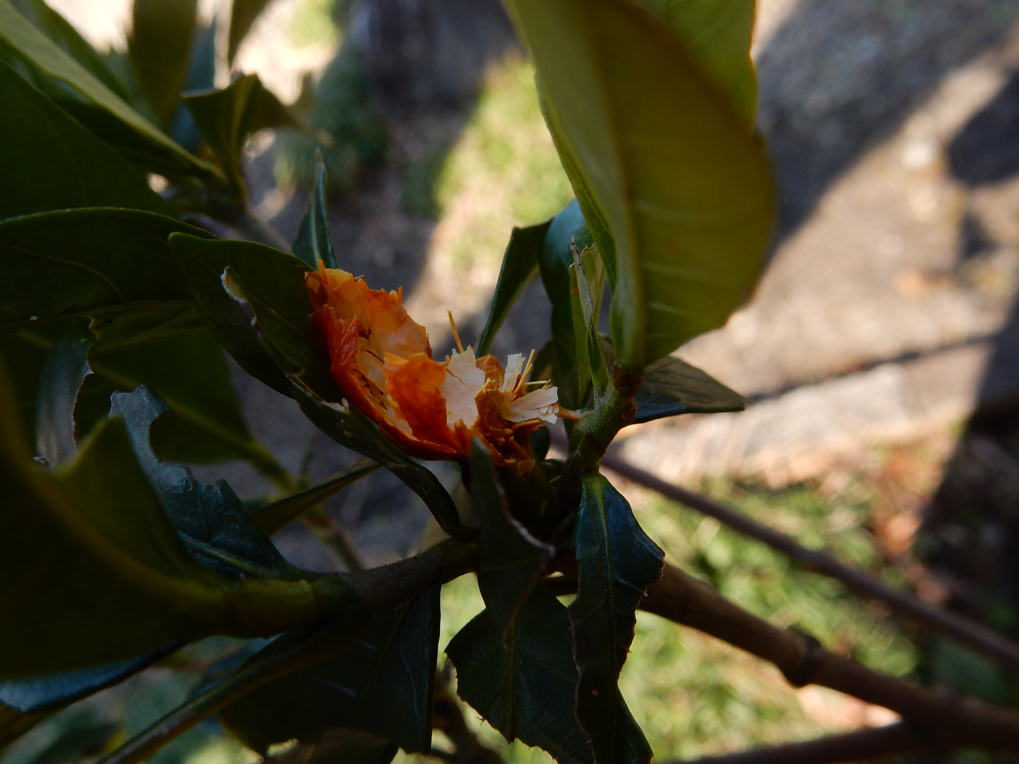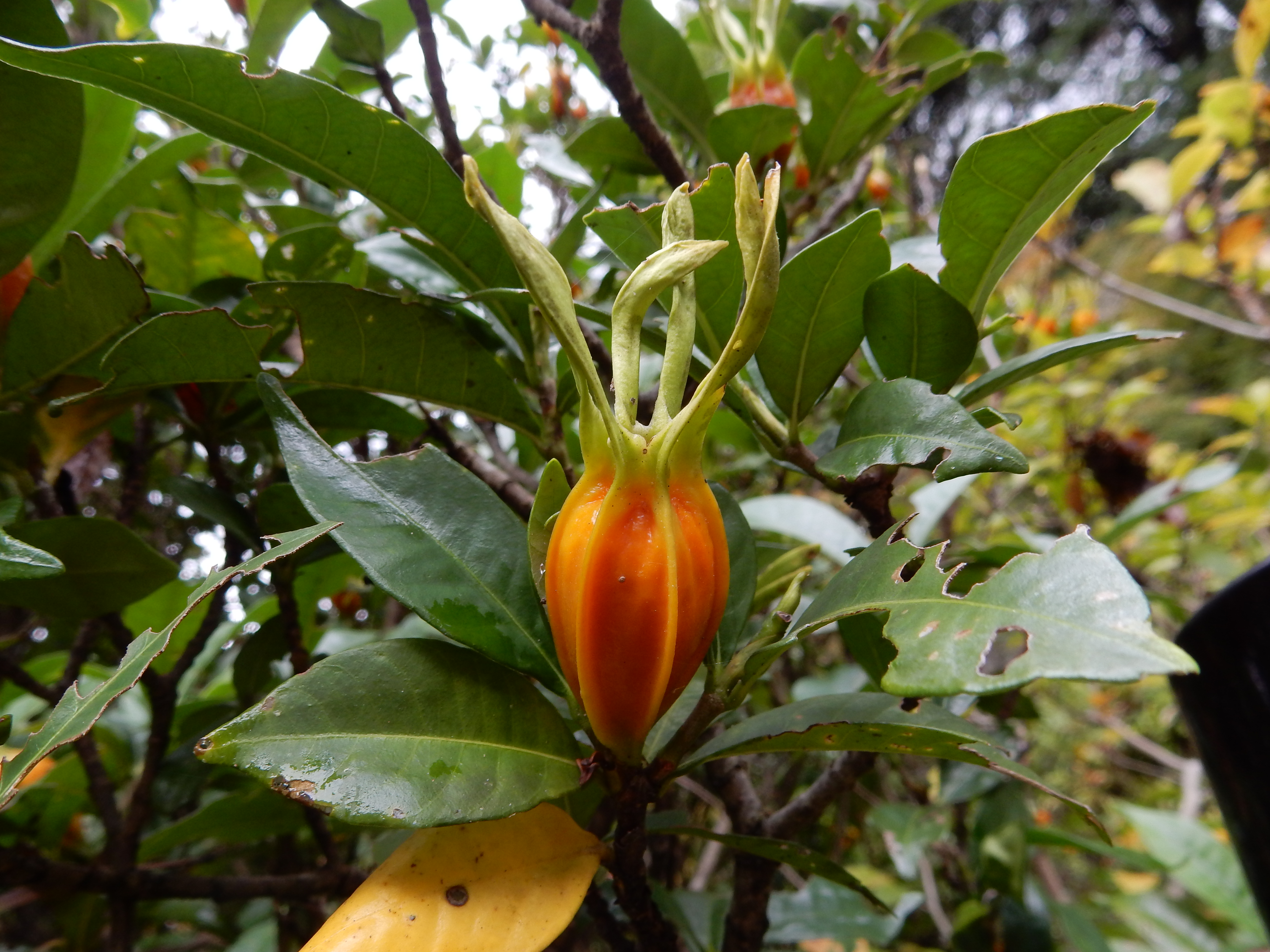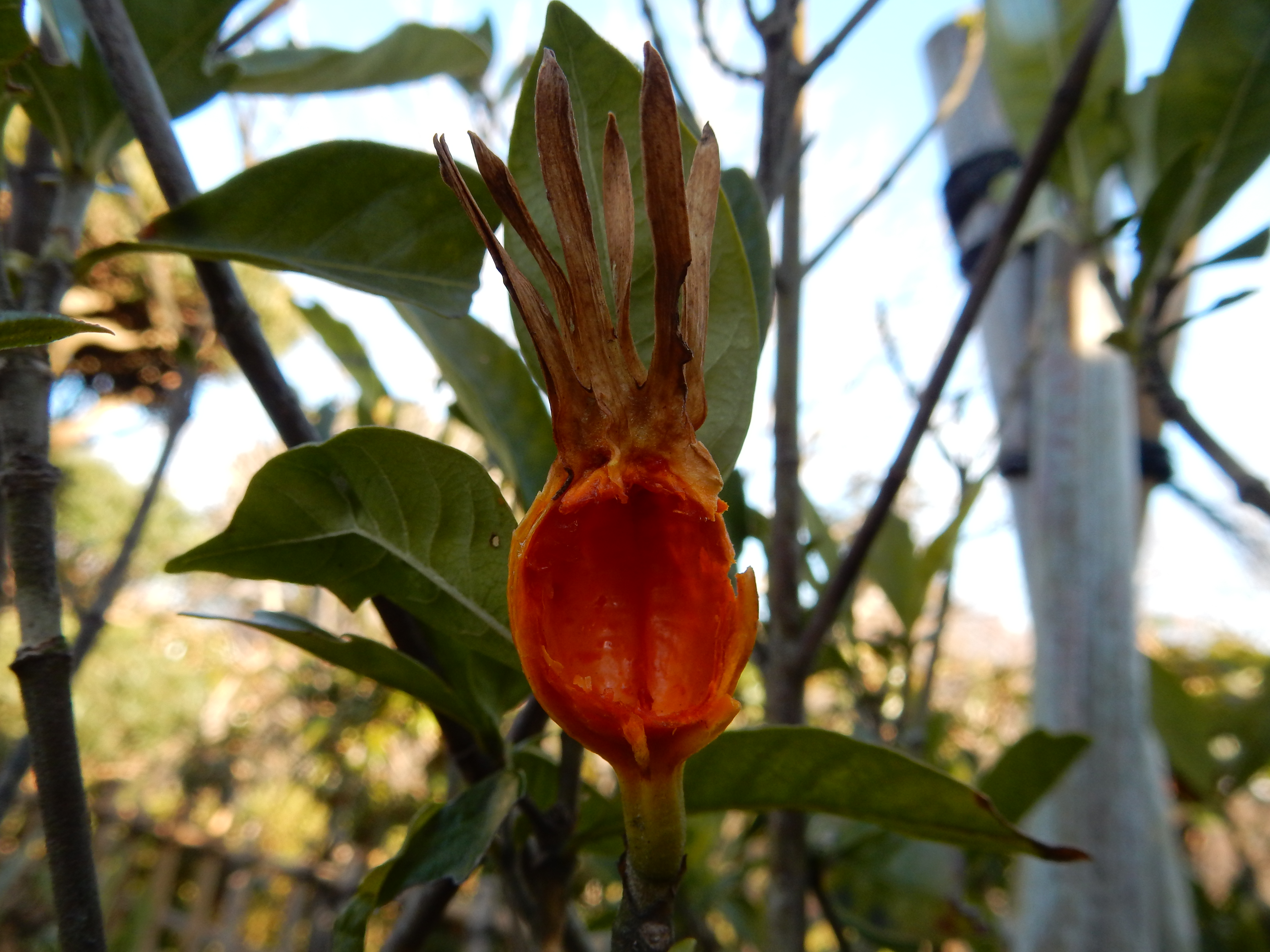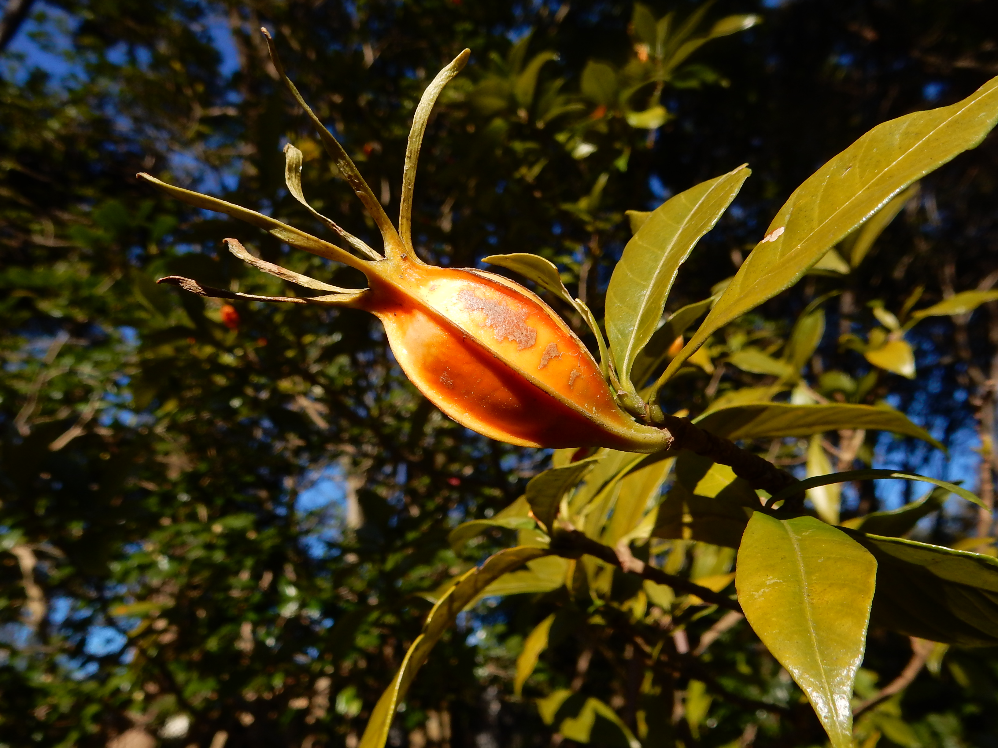 夏に芳香のある白い花を咲かせたクチナシ(一重咲き)は結実して、